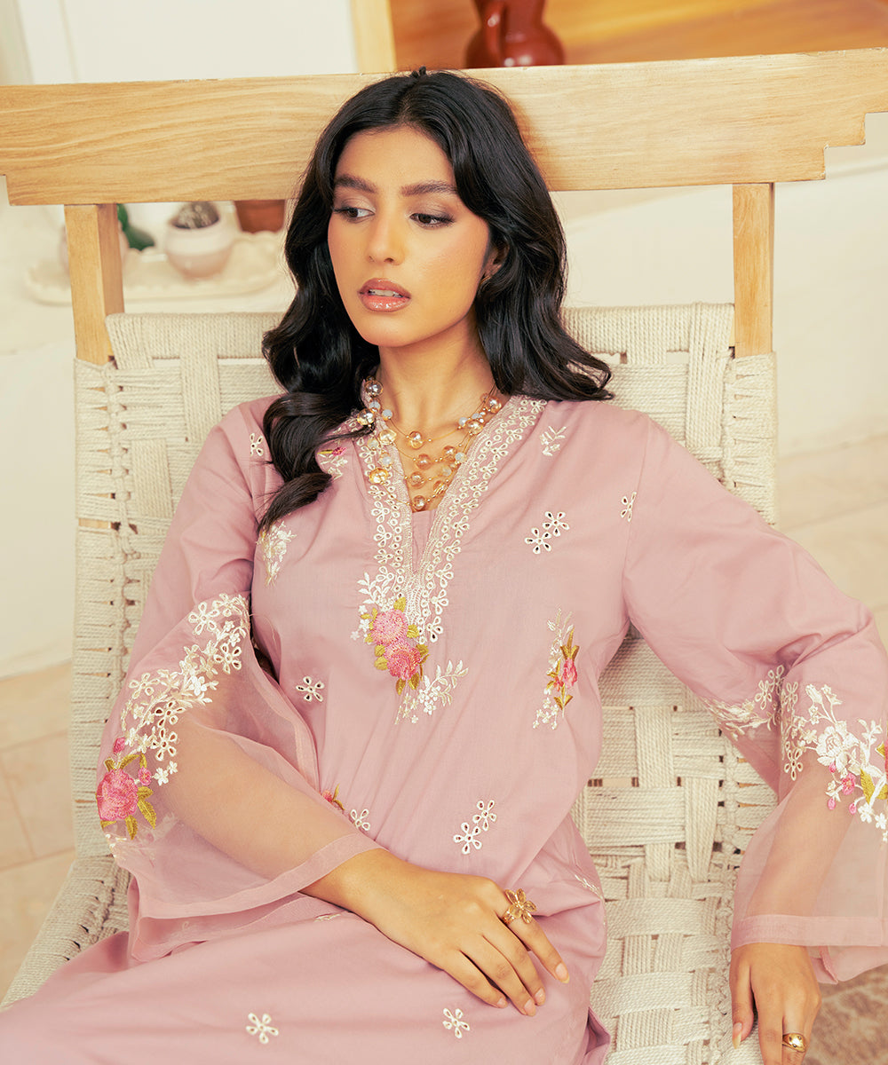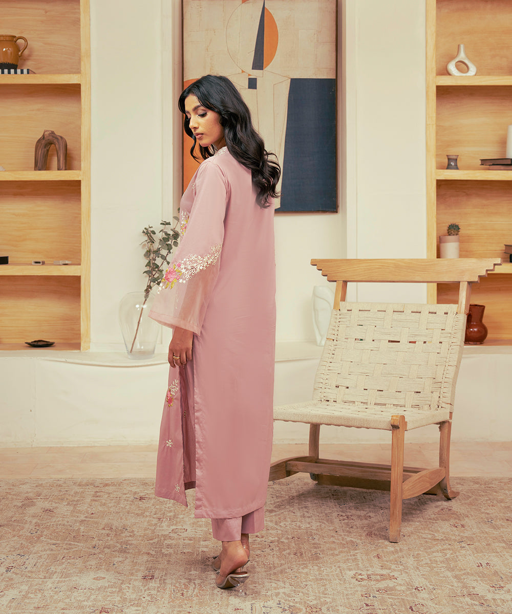 Description: The cotton silk shirt features intricate white cutwork that adds texture and visual interest to the fabric, enhancing the overall look without overwhelming it. Adding a touch of contrast, the contrasting pink rose embroidery is placed on the front and sleeves, with each rose adding a pop of vibrant, rich pink against the softness of the tea pink background. creating a beautiful garden-like feel, adding depth and character to the shirt. The sleeves are made even more special with organza detailing, which adds a layer of ethereal sophistication. The straight pants are simple and understated, made from a plain fabric to balance the ornate embroidery on the top. The simplicity of the pants creates a modern, sleek silhouette while allowing the focus to remain on the intricately embroidered shirt.