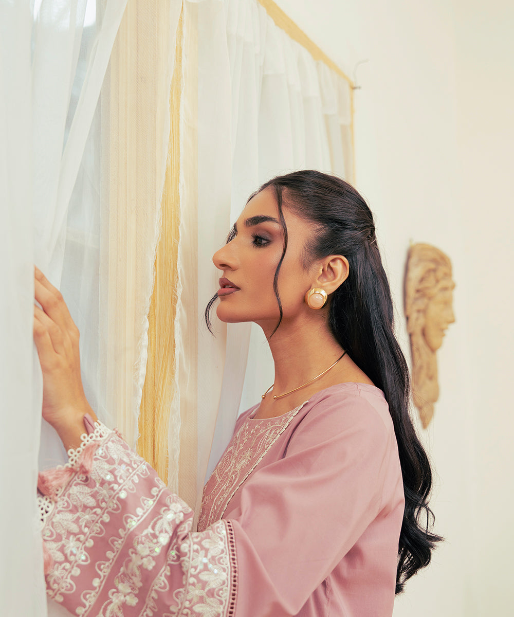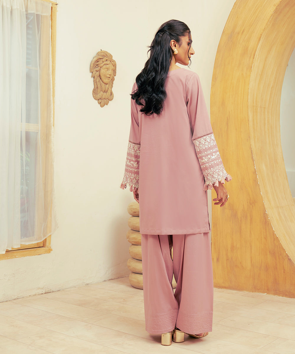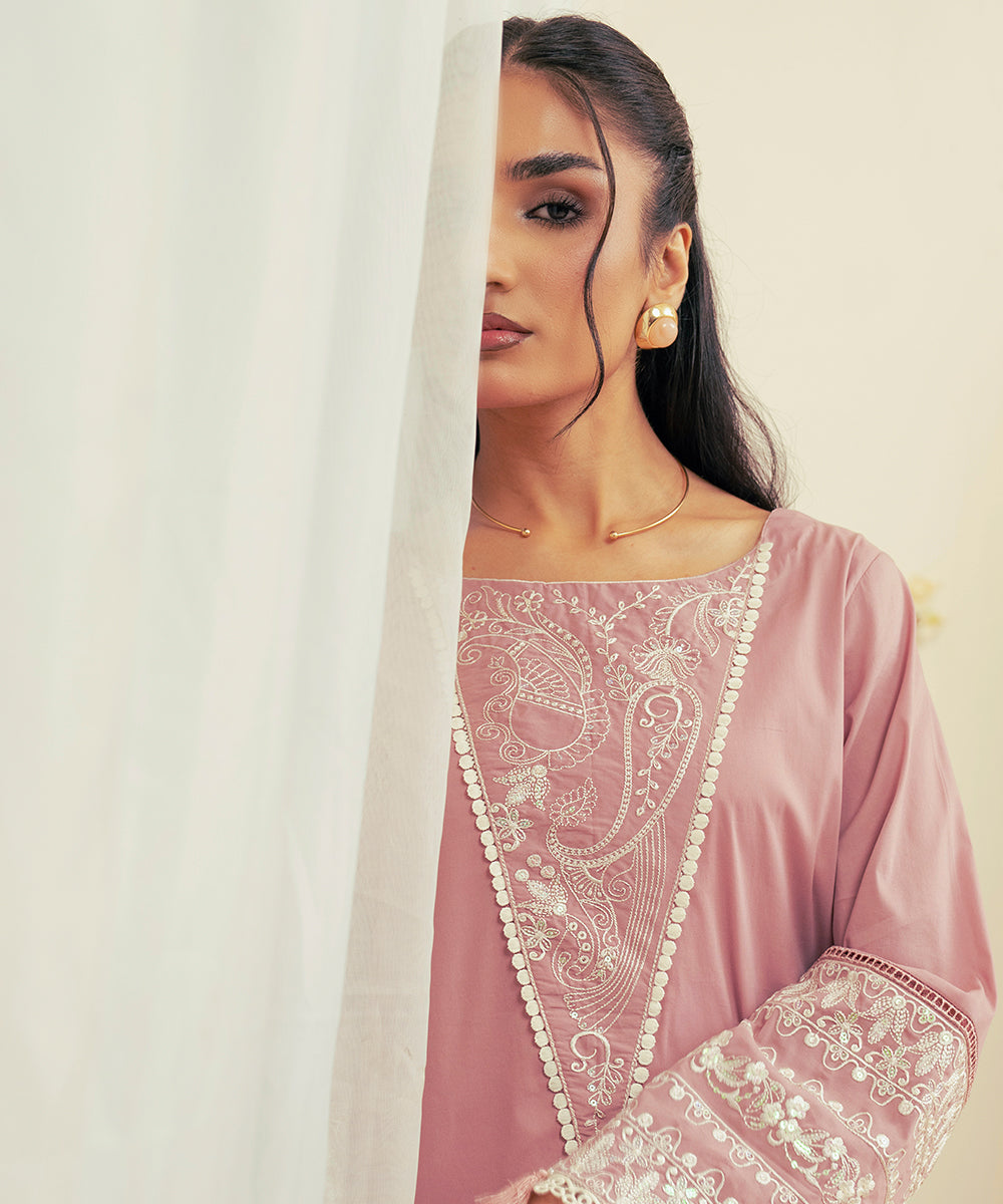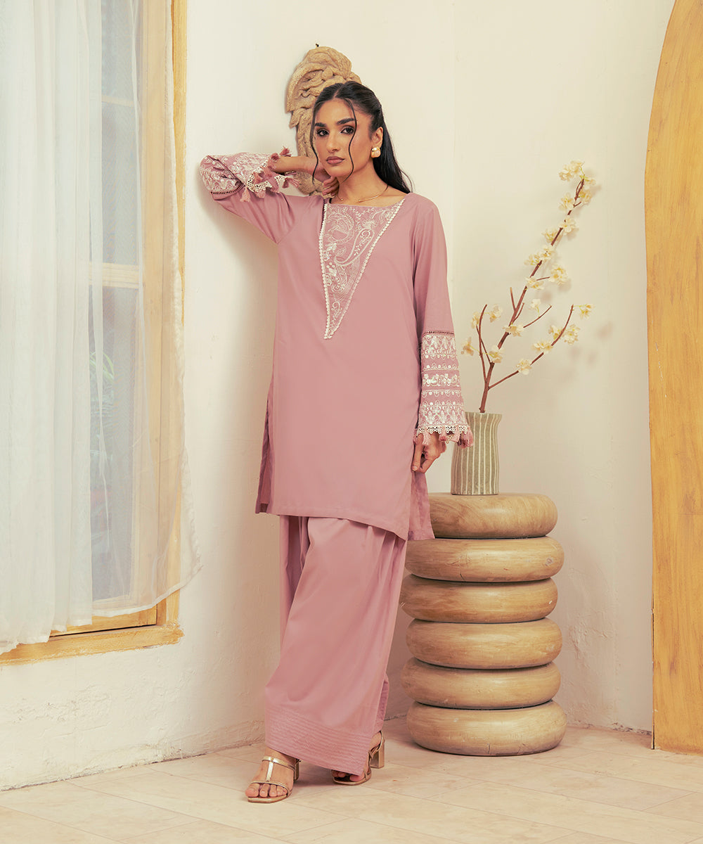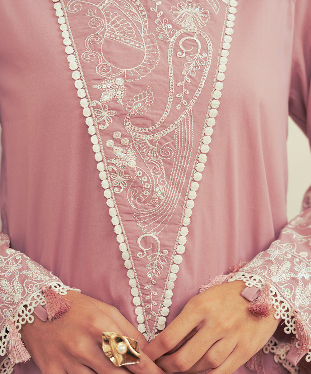 Description: This elegant tea pink 2-piece set blends the soft shine of cotton silk with delicate embroidery details, making it a perfect choice for both casual and semi-formal events. shirt is made from a luxurious tea pink cotton silk blend, which gives it a smooth, slightly lustrous finish. The shirt features beautiful white embroidered neckline or scattered throughout, What makes it stand out are the embroidered details and tassel accents on the sleeves, giving the outfit a charming, bohemian flair. The tassels add movement and texture, making the shirt even more eye-catching. The bottom piece is a farshi sharwar, a traditional style of loose, flowing trousers, which balances the more structured top. The farshi sharwar's relaxed silhouette offers comfort while maintaining a graceful, elegant look. It likely has a slight gathering or embroidery along the waist or hem to match the embroidered theme of the shirt.