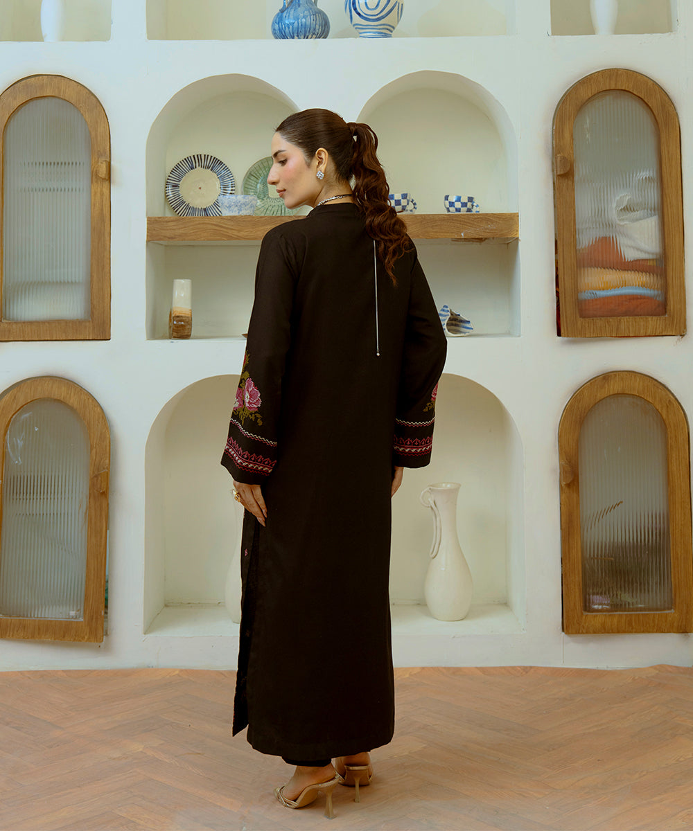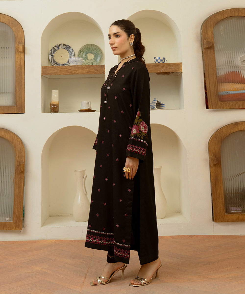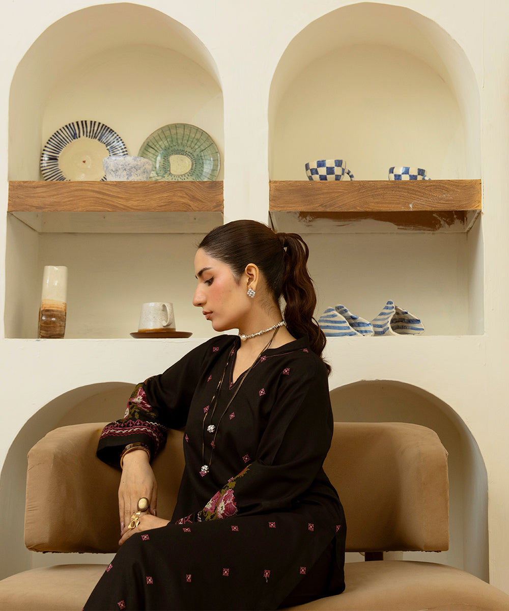 Description: A graceful two piece essemble on black soft dhanak fabric, featuring delicate floral cross stitch embroidery on sleeves and subtle cross stitch spray on front. Paired with embroidered straight pants for a refined yet effortless look, this outfit beautifully blends tradional charm with modern elegance perfect for this winter season.
