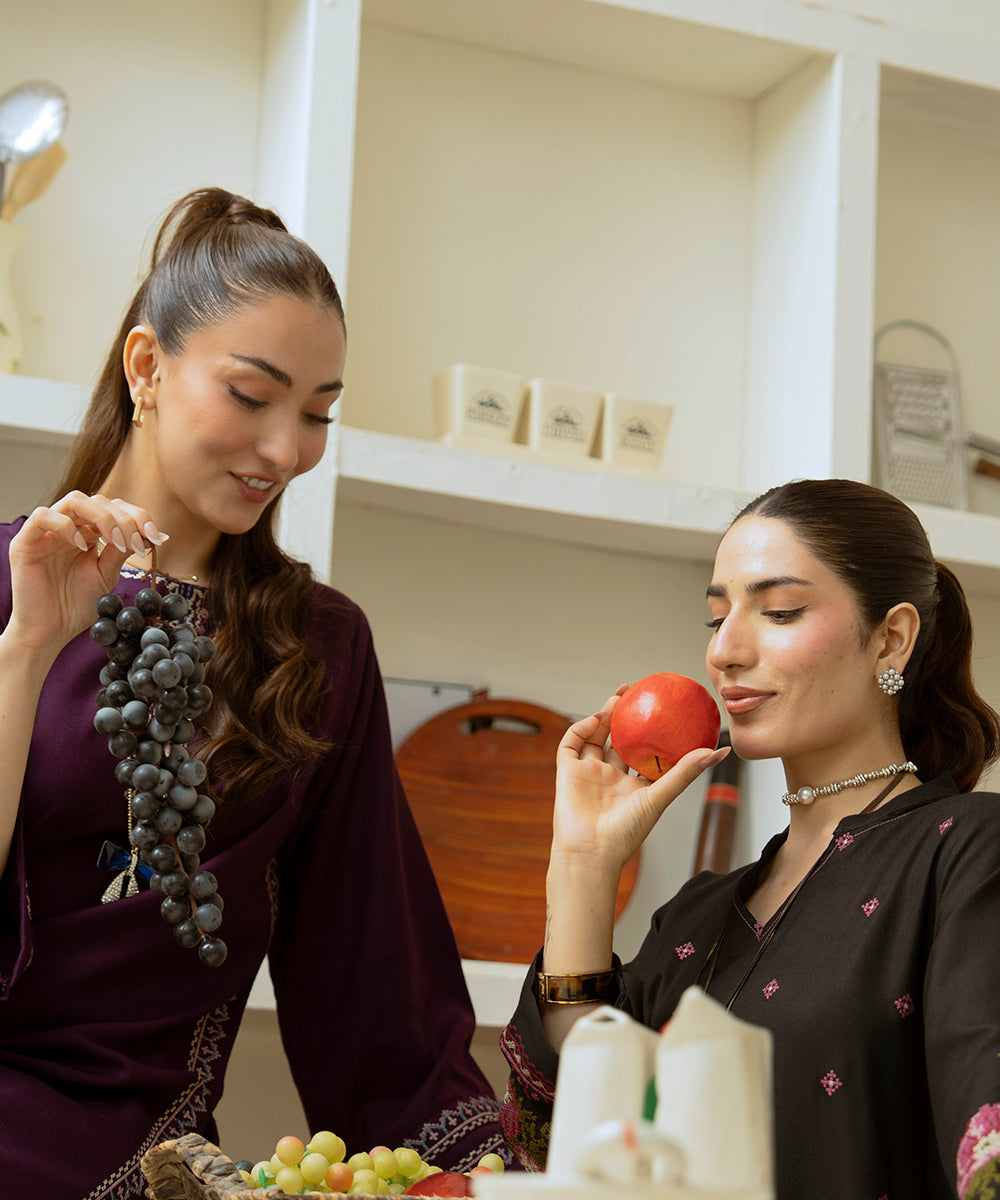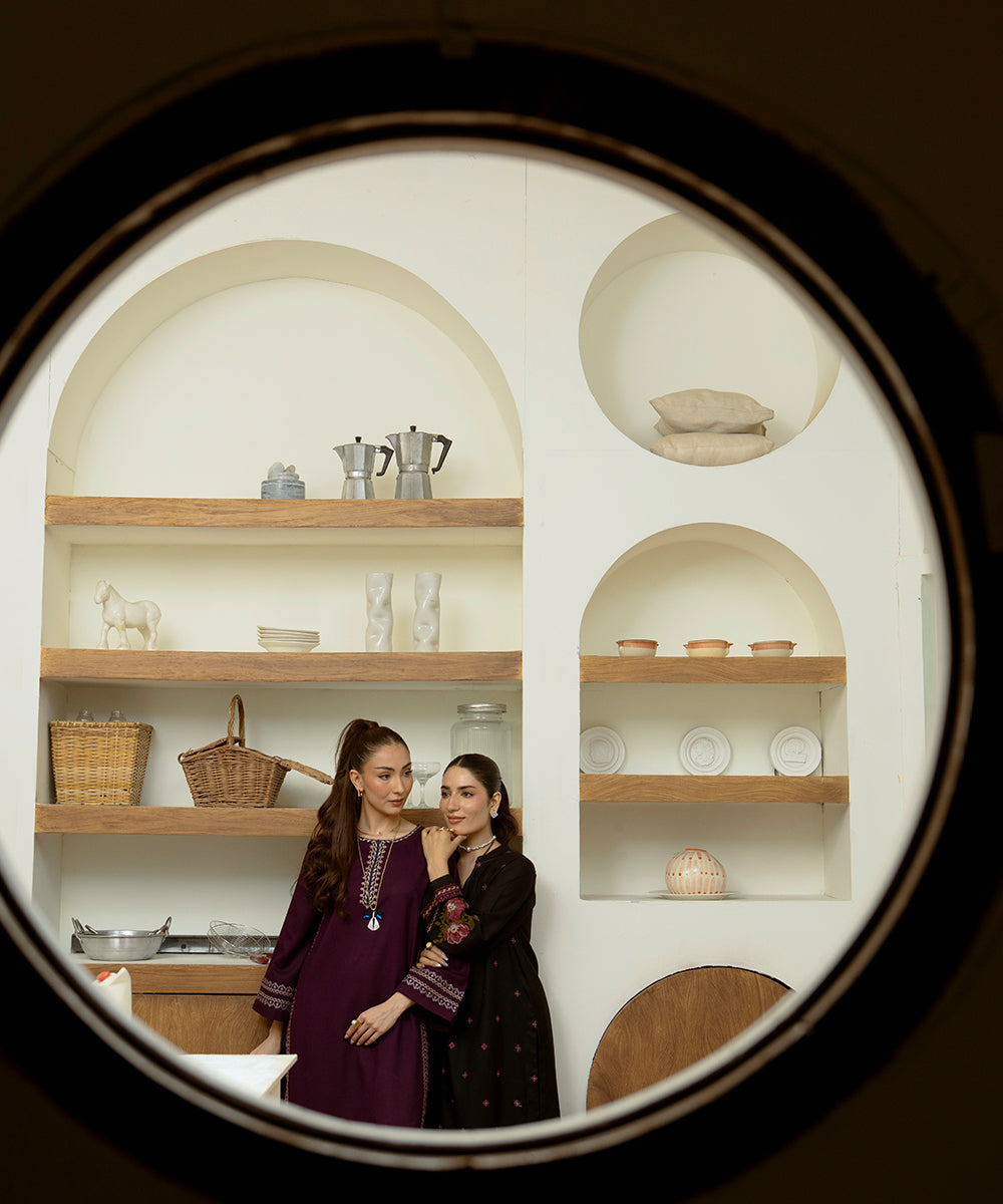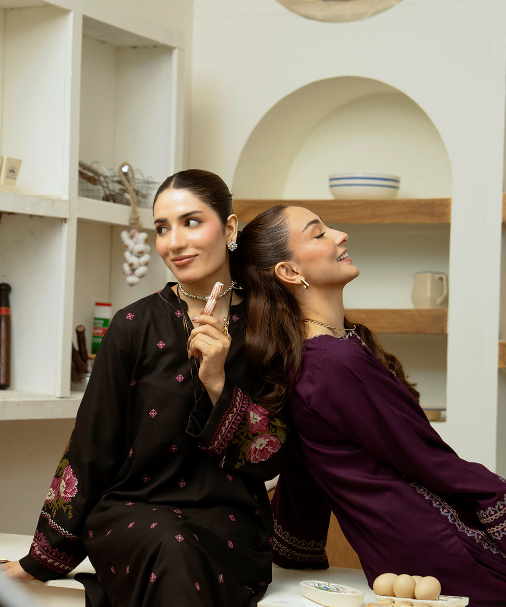 Description: A graceful two piece essemble on black soft dhanak fabric, featuring delicate floral cross stitch embroidery on sleeves and subtle cross stitch spray on front. Paired with embroidered straight pants for a refined yet effortless look, this outfit beautifully blends tradional charm with modern elegance perfect for this winter season.