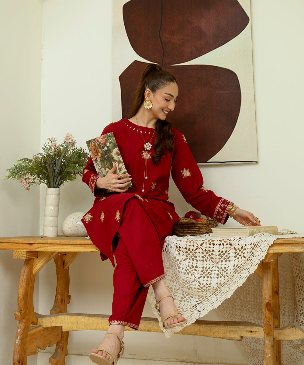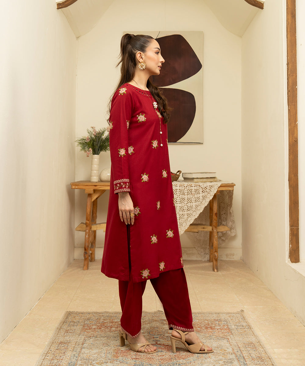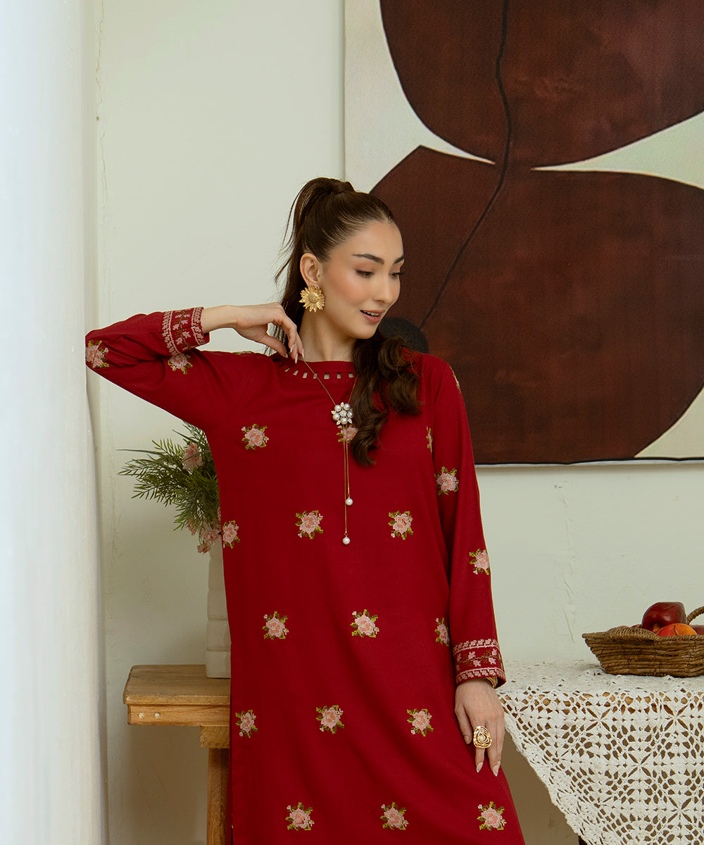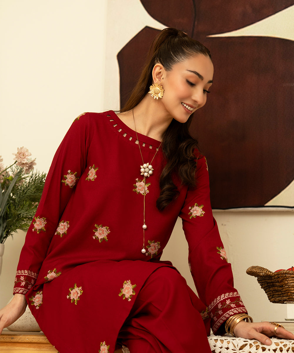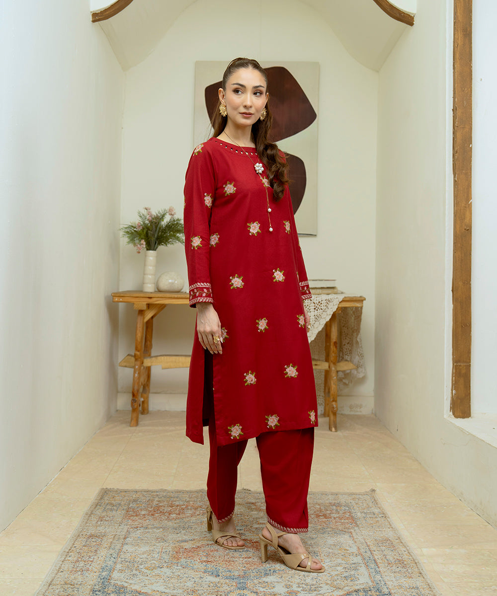 Description: A rich maroon two piece outfit crafted in dhanak fabric, adorned with intricate overall cross stitch embroidery on the shirt. The look is completed with an embroidered border on the shalwaar, making it an elegant and cozy choice for the winter season.