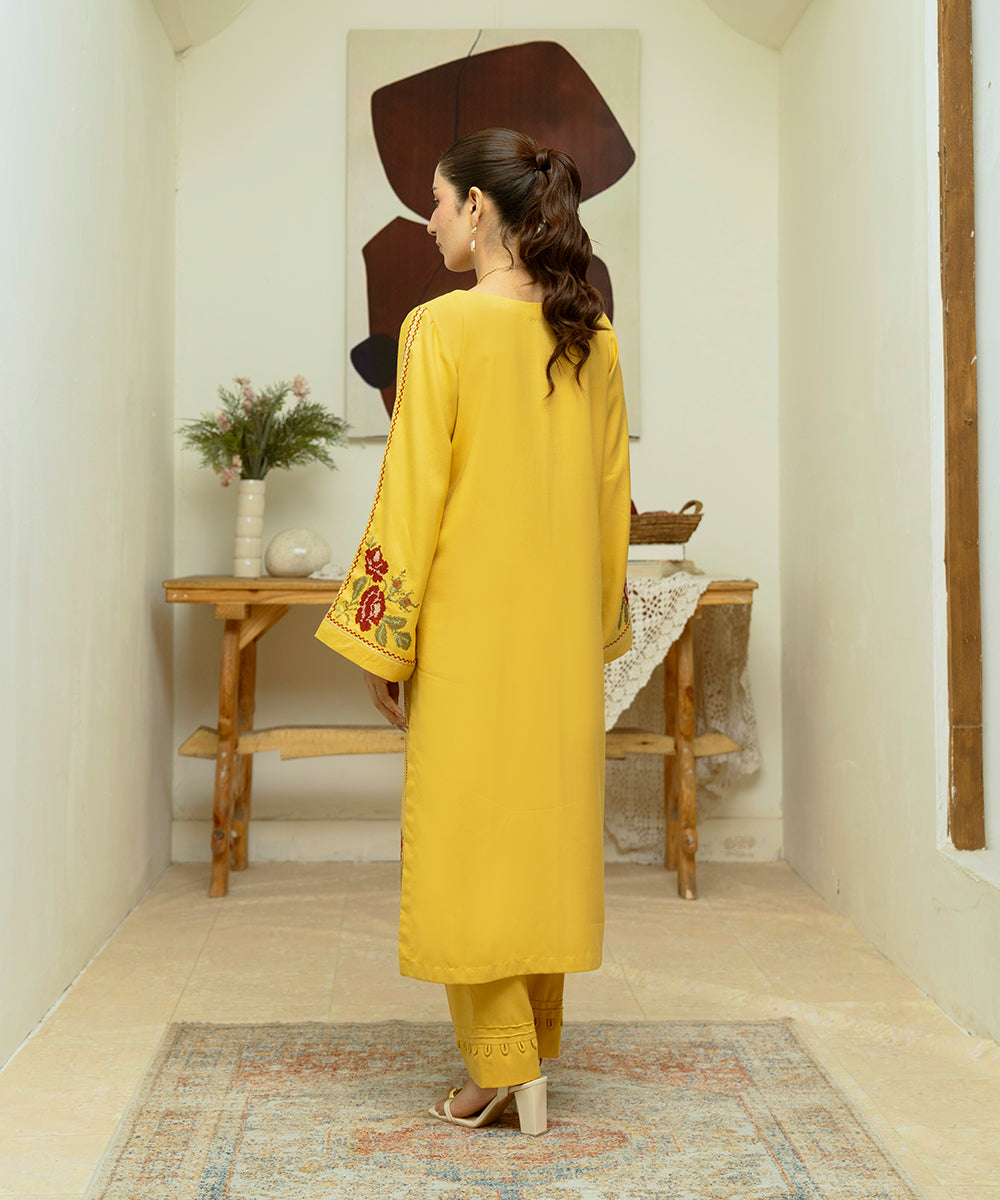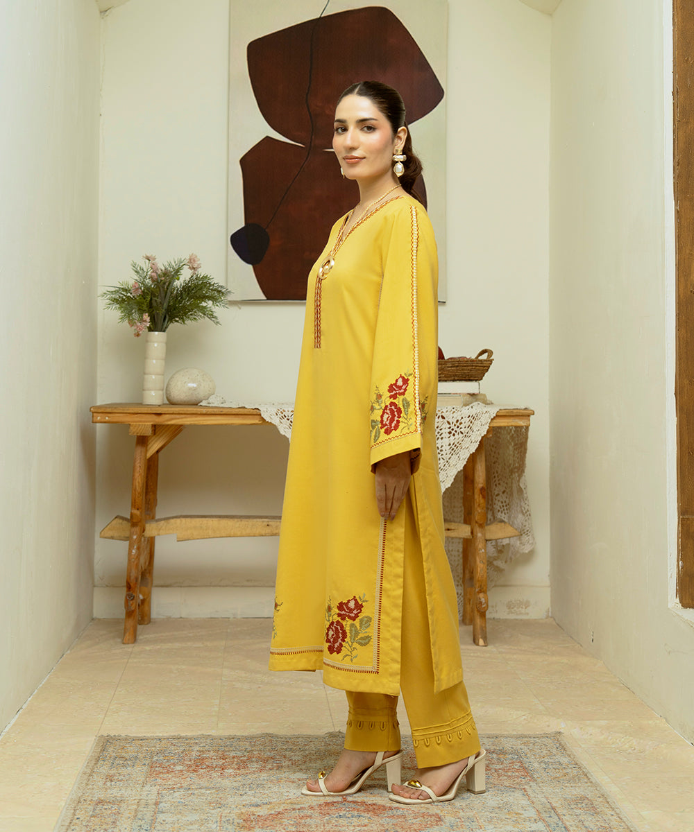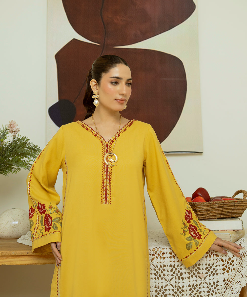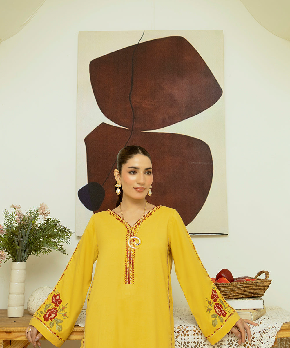 Description: A chic musturd dhanak two piece set, adorned with delicate cross stitch embroidery on the shirt and enhanced with bold floral cross stitch motifs on the sleeves, paired with straight pants for an elegant winter look.