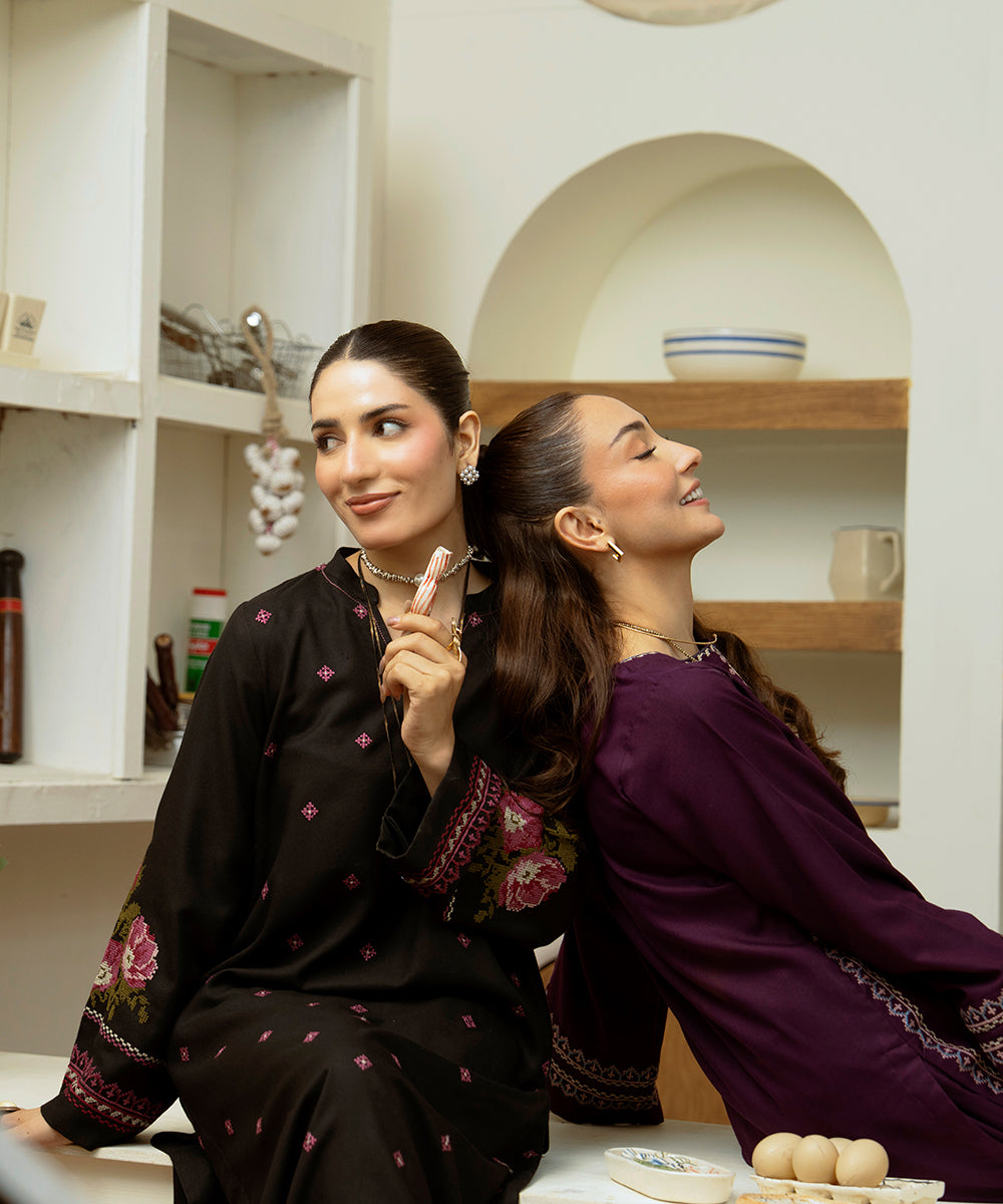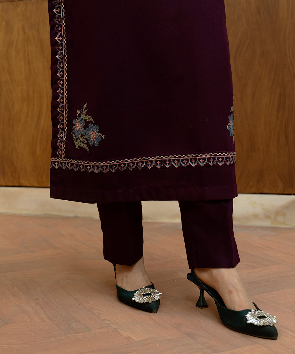 Description: Plum Dhanak two piece set featuring refined cross stitch embroidery along the neckline, sleeves and hem, highlighted with delicate motifs in soft tones of beige, blue and pink. paired with straight pants, this design blends timeless elegance with understated winter charm.