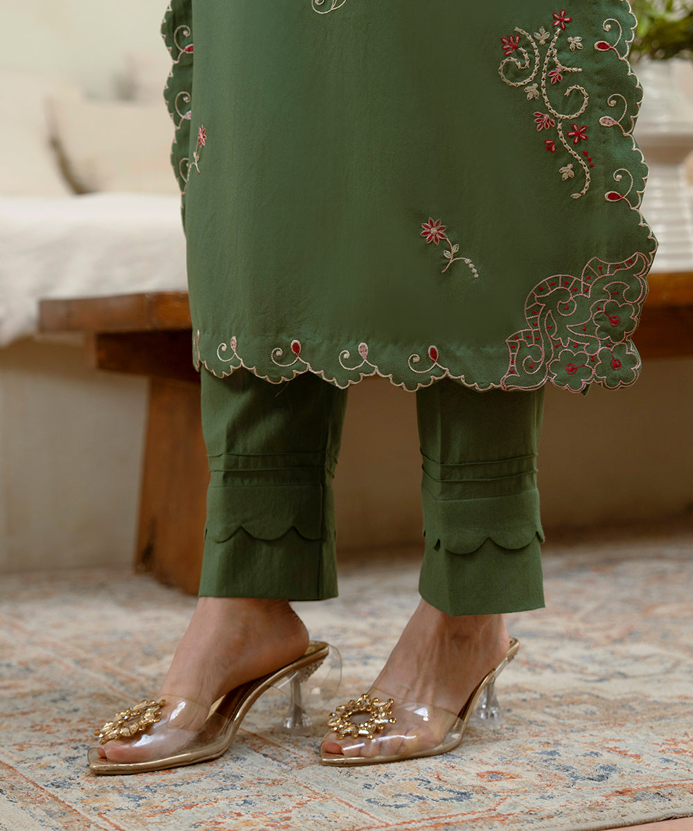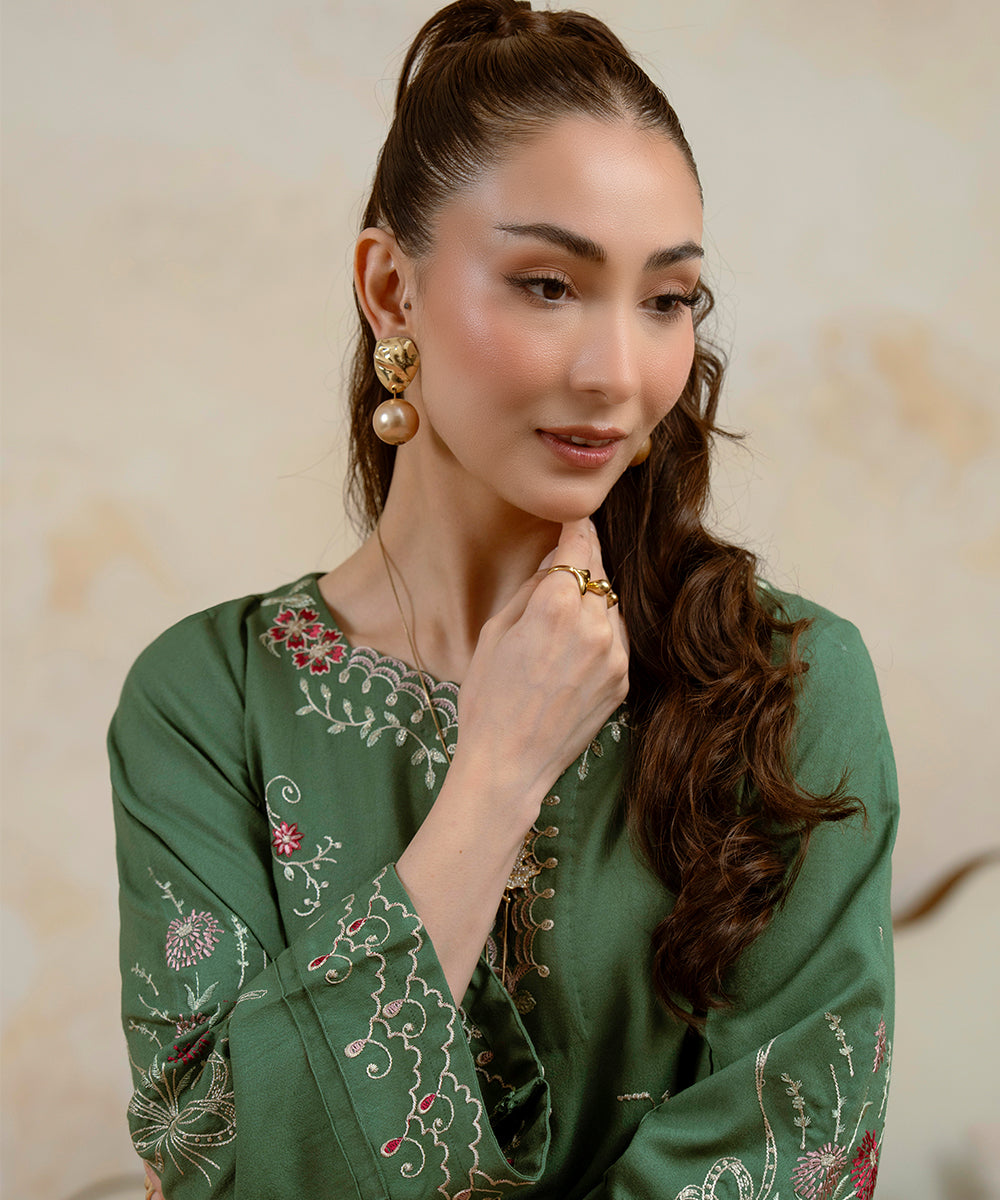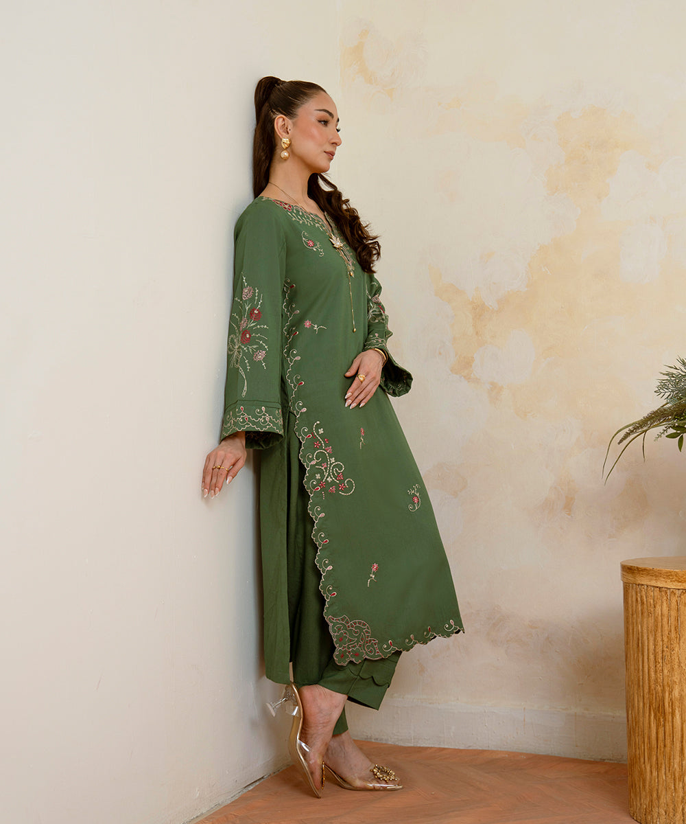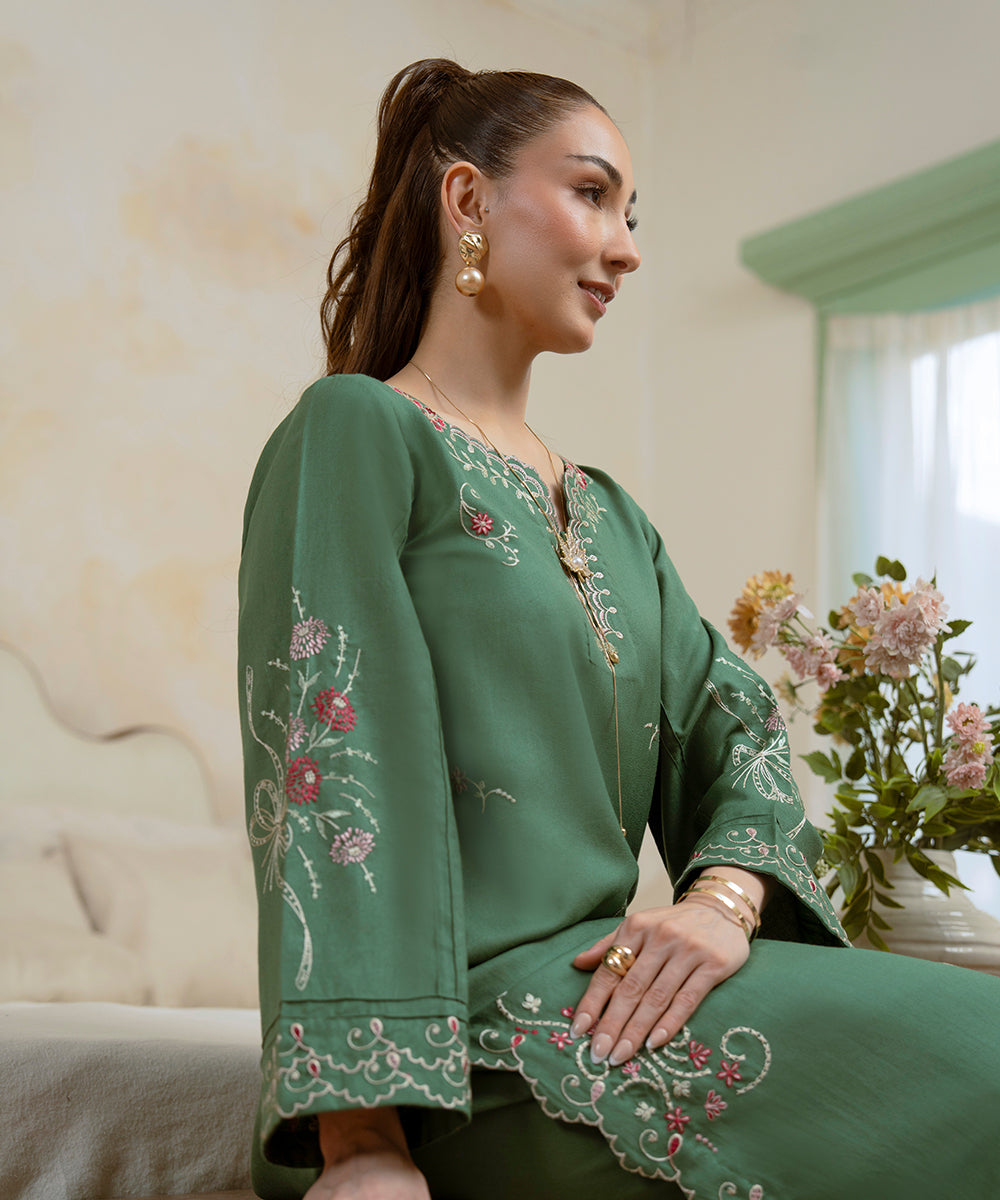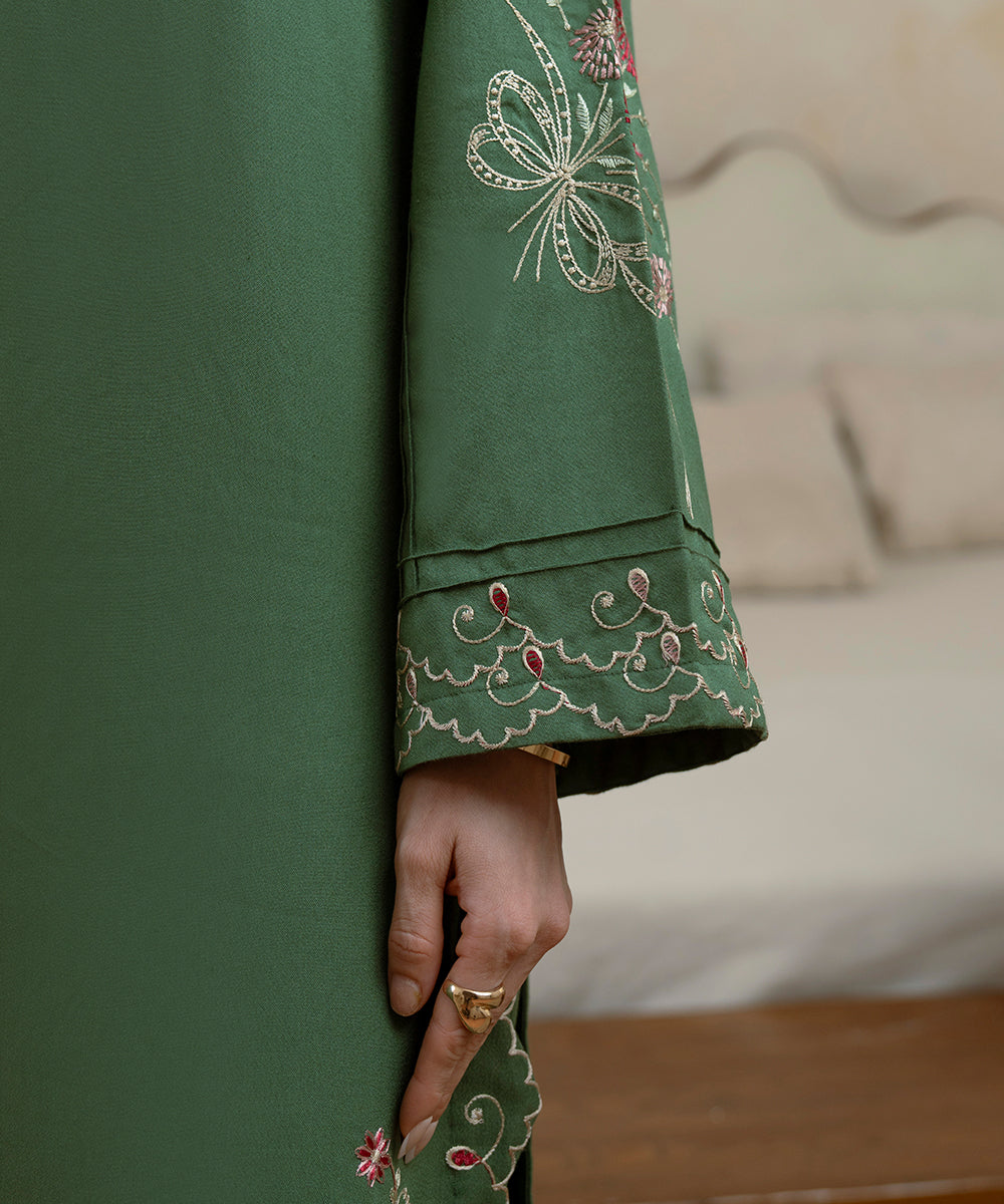Description: Sage green dhanak two piece featuring contemporary colorful composed embroidery on the shirt, delicately accented with subtle sequins along the neckline and complemented by embroidered sleeves. Paired with straight pants, this essemble blends modern detailing with winter sophistication.