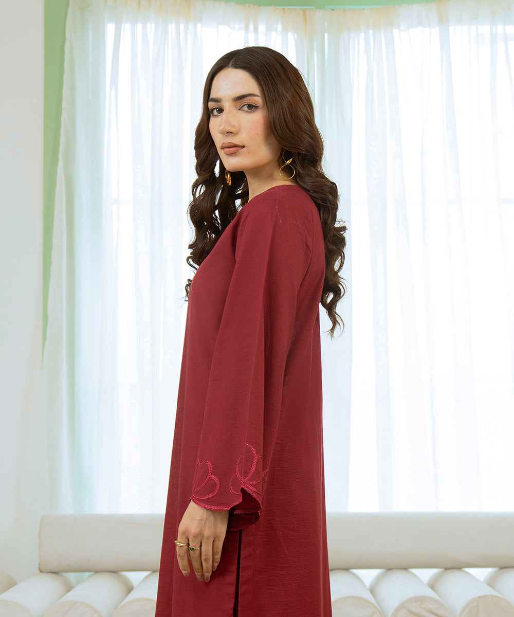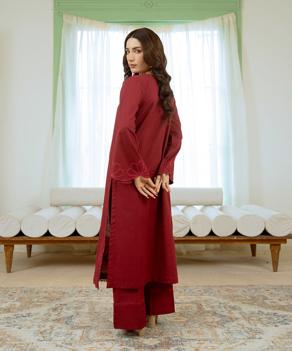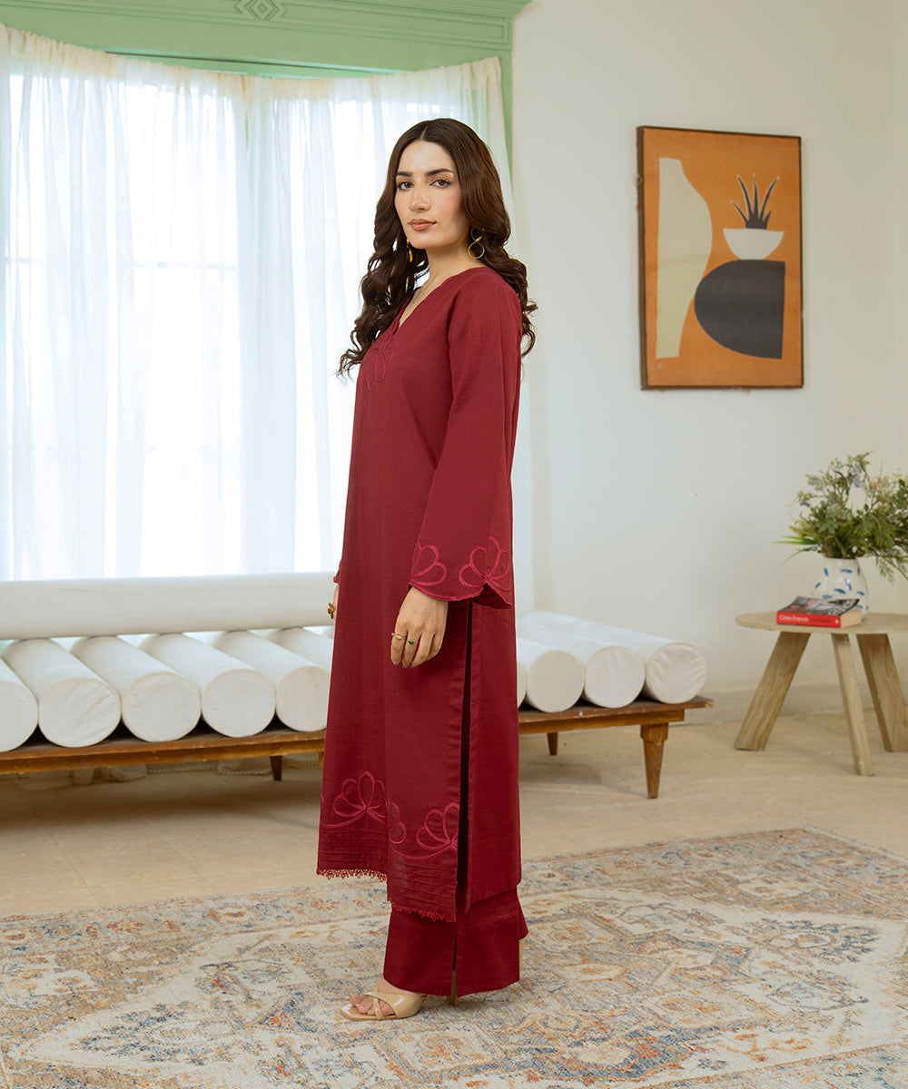 Description: Maroon khaddar two piece esemble designed for refined winter style. The shirt is beautifully embroidered along the neckline, hem and sleeves adding a depth and elegance to the look. Paired with straight pants featuring lace detailing and a chic slit, this outfit offers a perfect blend of tradition and contemporary sophistication.
