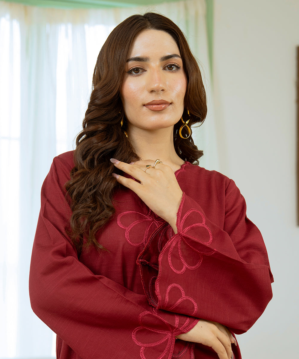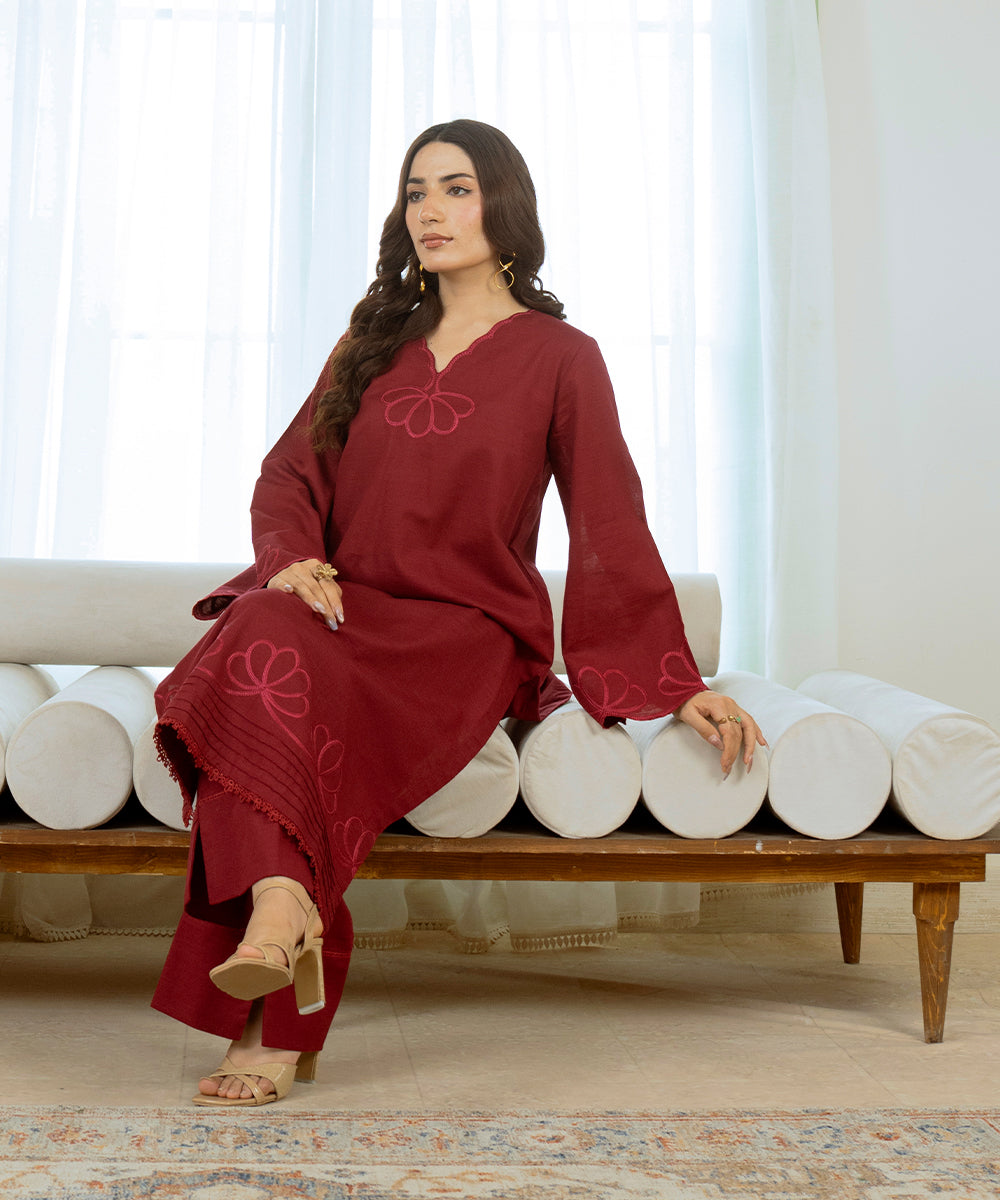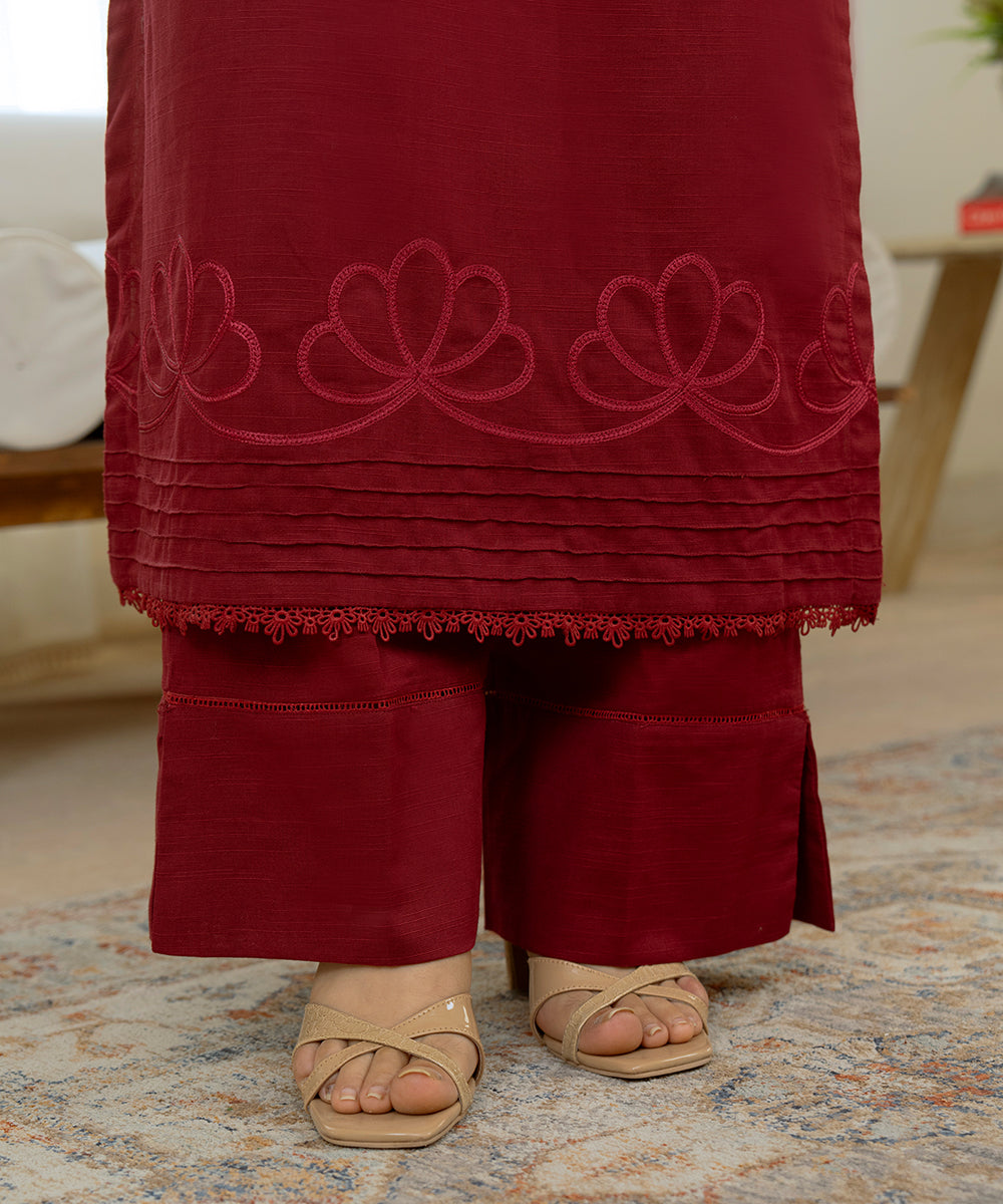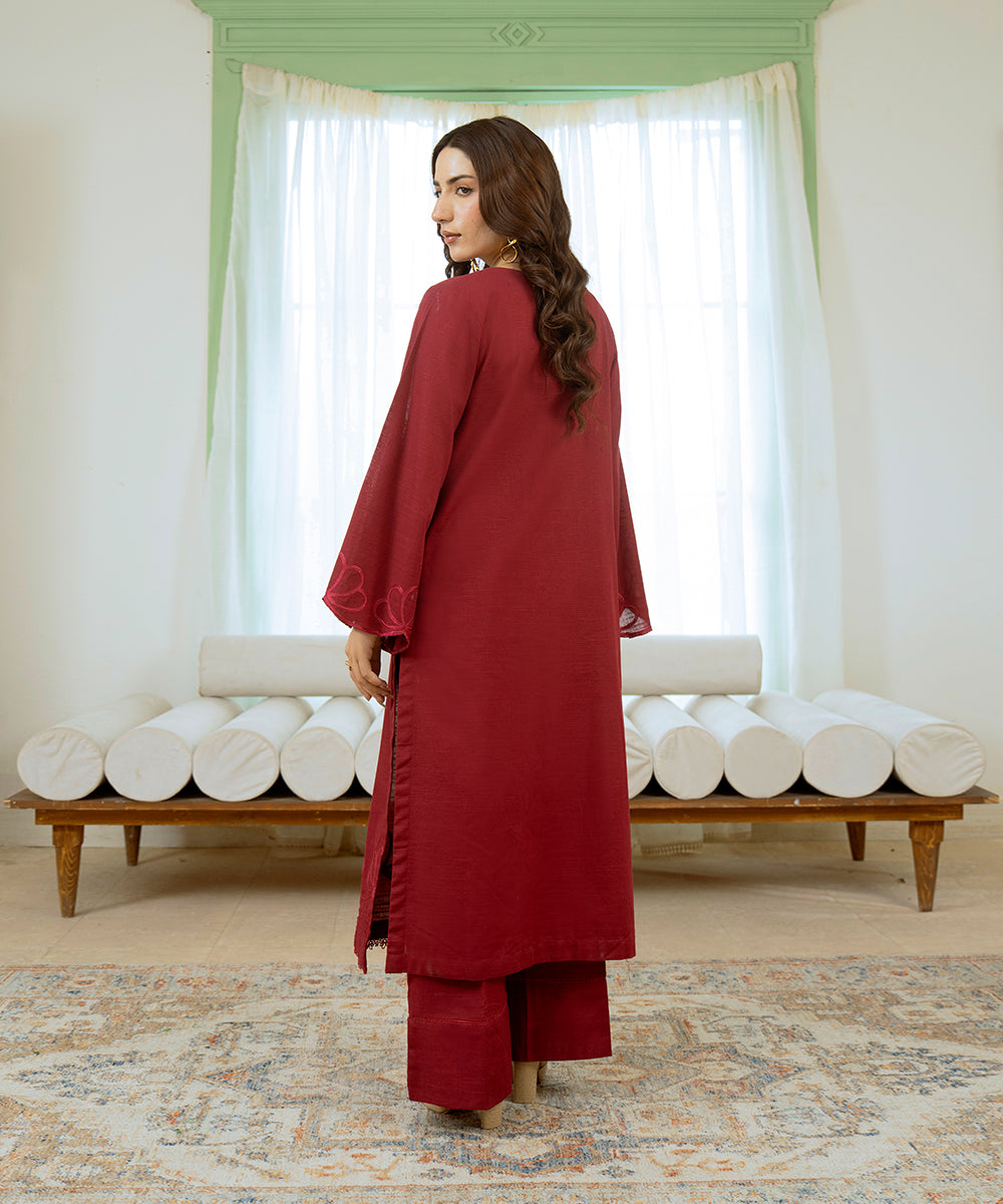 Description: Maroon khaddar two piece esemble designed for refined winter style. The shirt is beautifully embroidered along the neckline, hem and sleeves adding a depth and elegance to the look. Paired with straight pants featuring lace detailing and a chic slit, this outfit offers a perfect blend of tradition and contemporary sophistication.