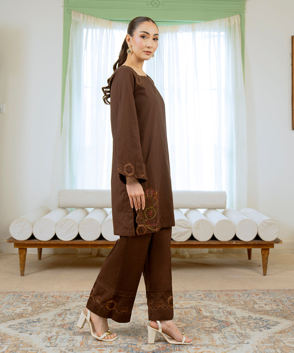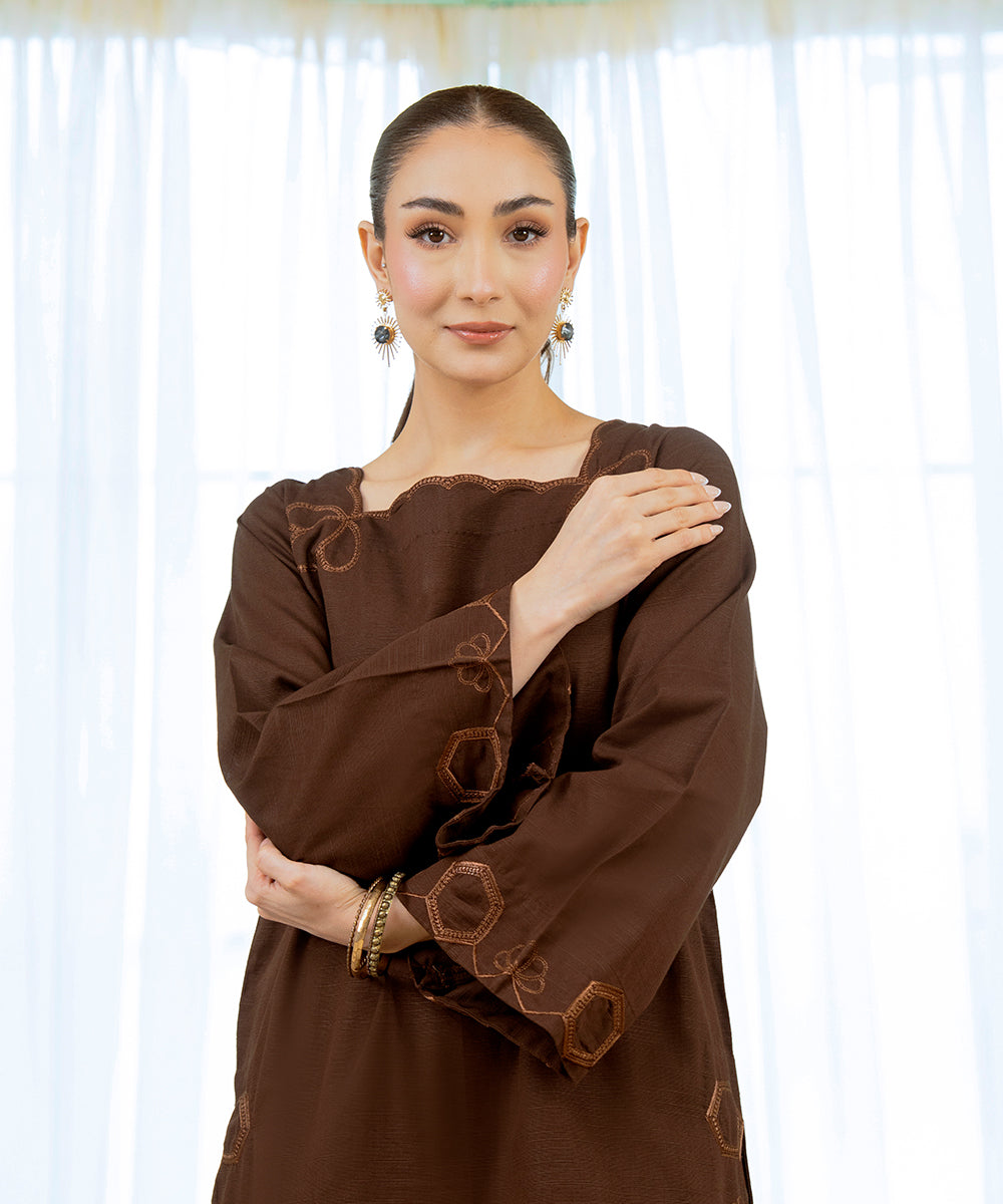 Description: Brown khaddar two piece set featuring an embroidered shirt with refined elements on the front and sleeves. Paired with embroidered culottes, this esemble offers a perfect balance of comfort and sophistication, making it an elegant choice for winter wear.