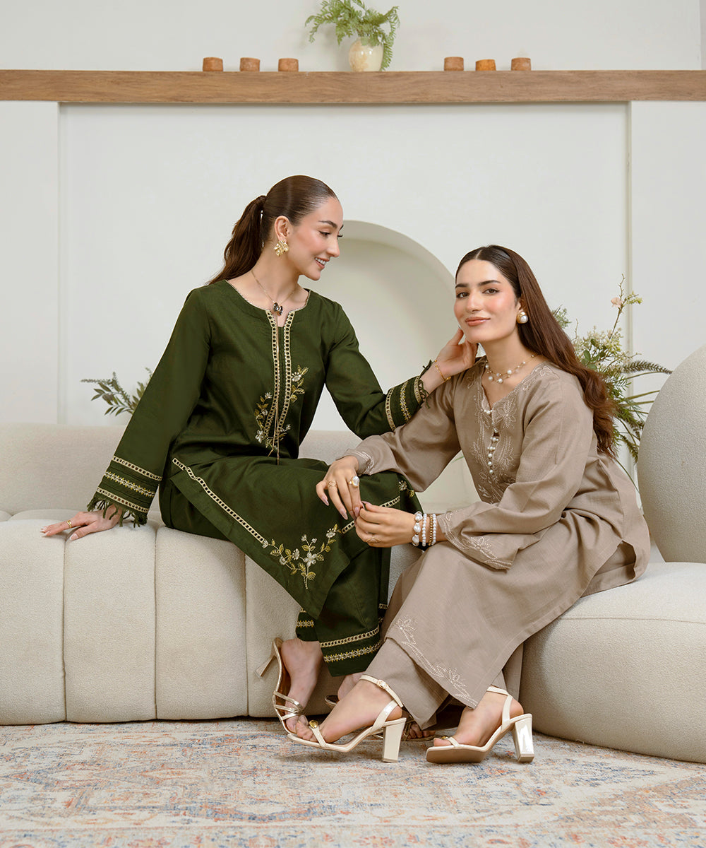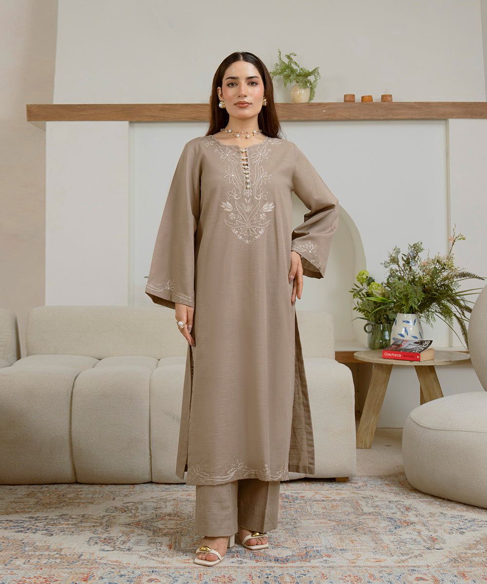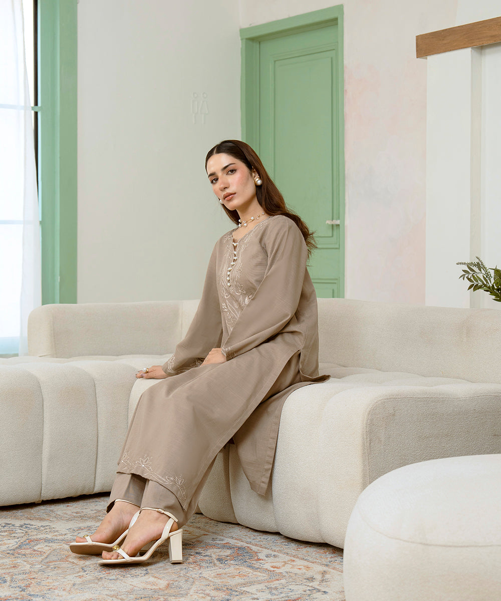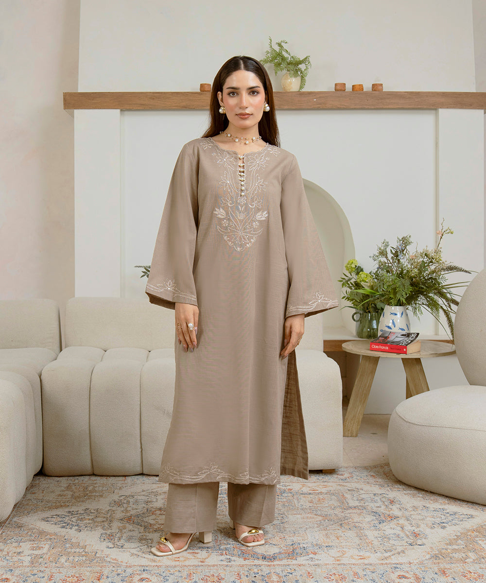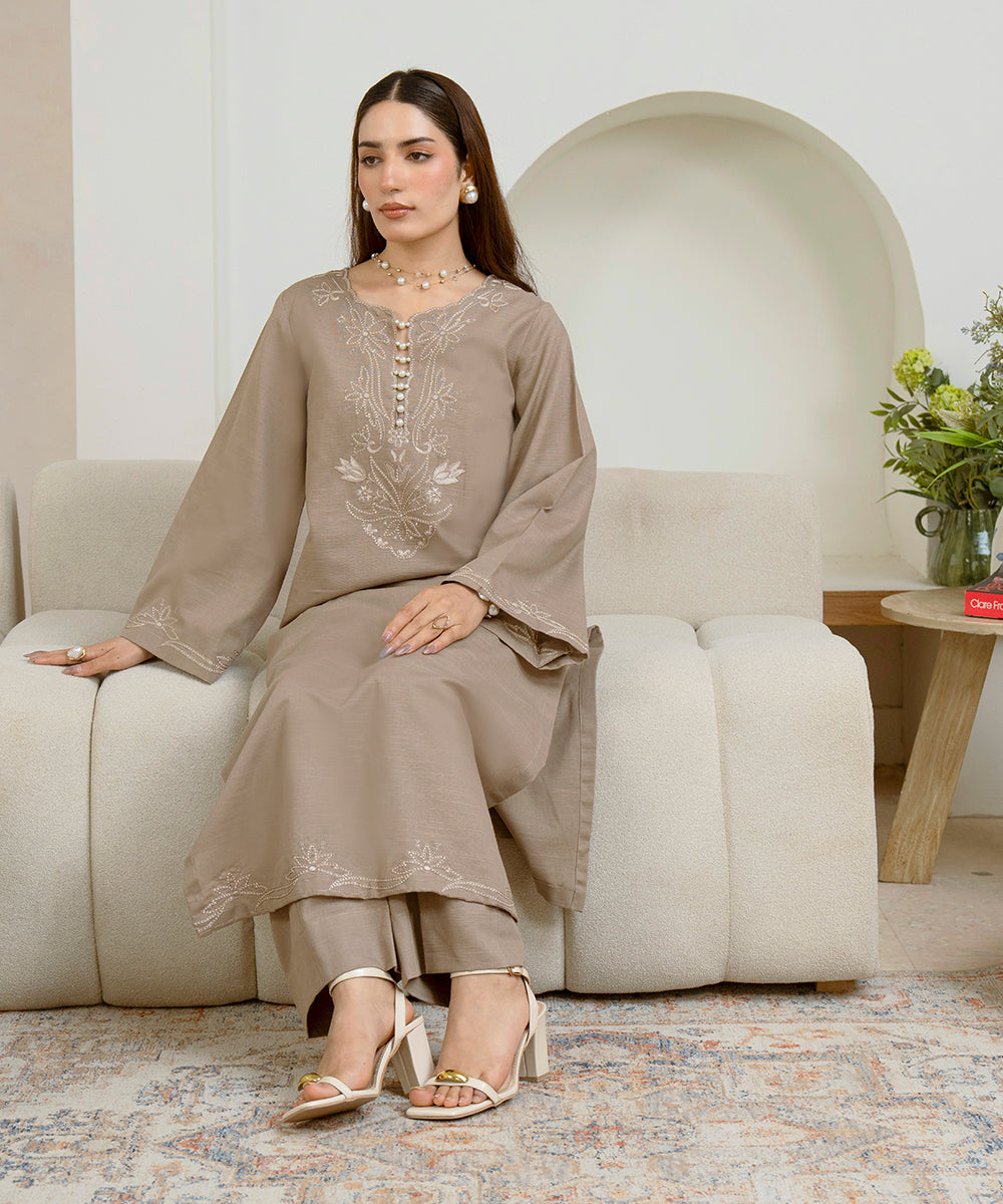 Description: An elegant beige khaddar two piece essemble, thoughtfully adorned with monotone embroidery along the neckline, sleeves and hemline. The neckline is further enhanced with subtle pearl details, adding a refined touch of sophistication. Paired with tailored culottes, this outfit beautifully balances timeless charm with modern simplicity, making it a versatile choice for both casual and semi formal wear.