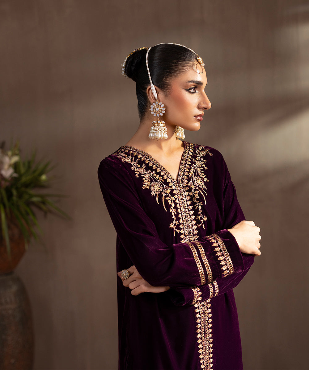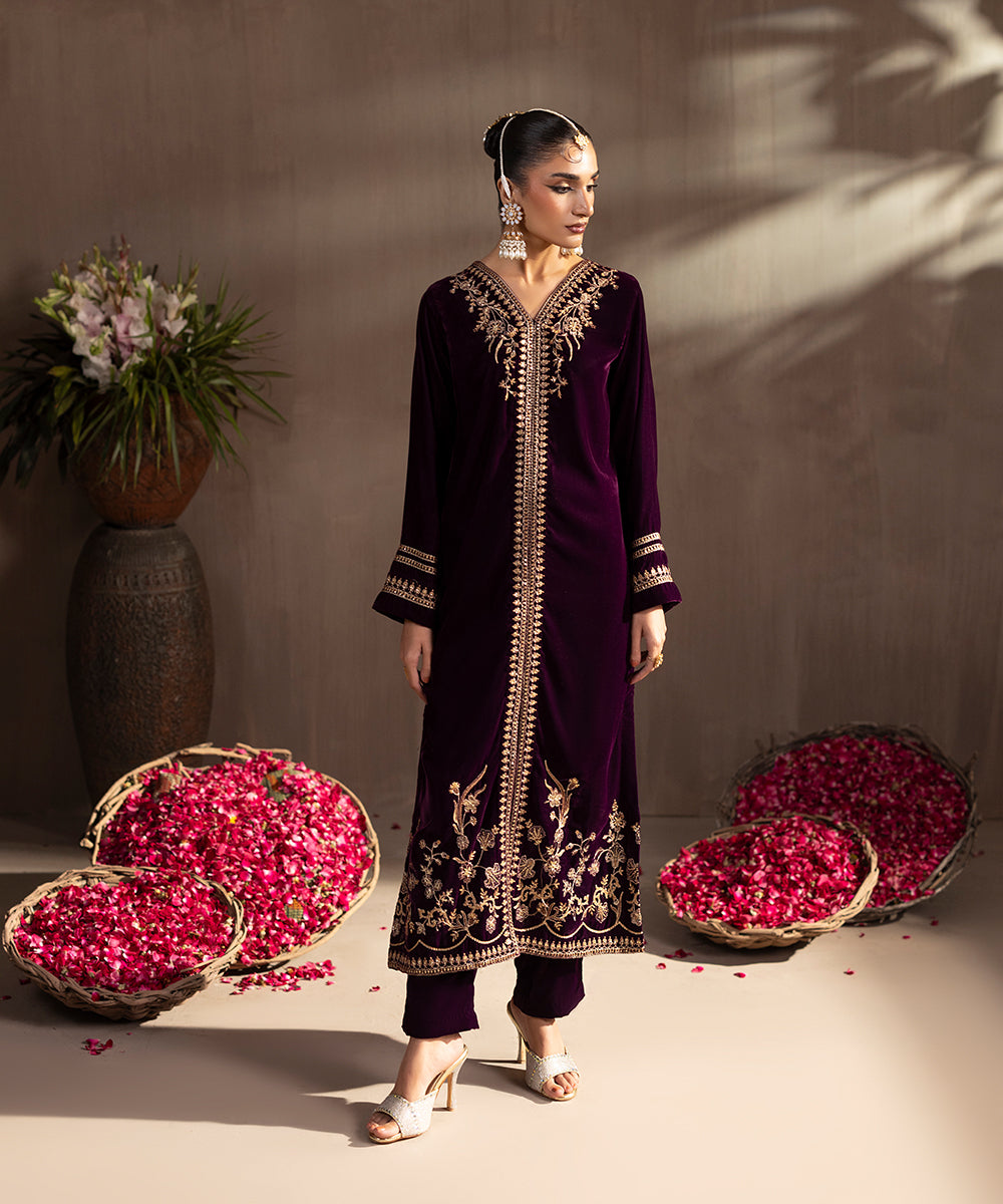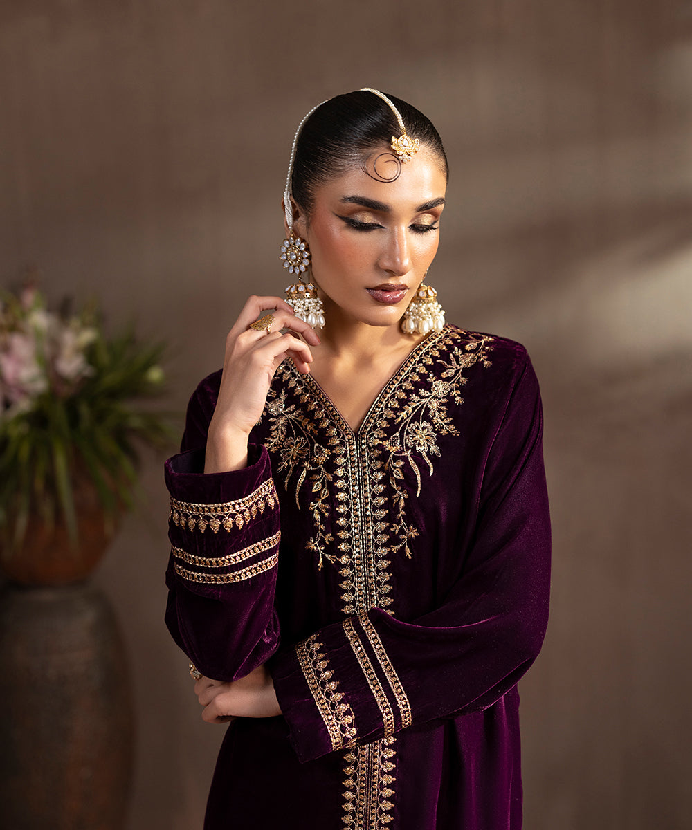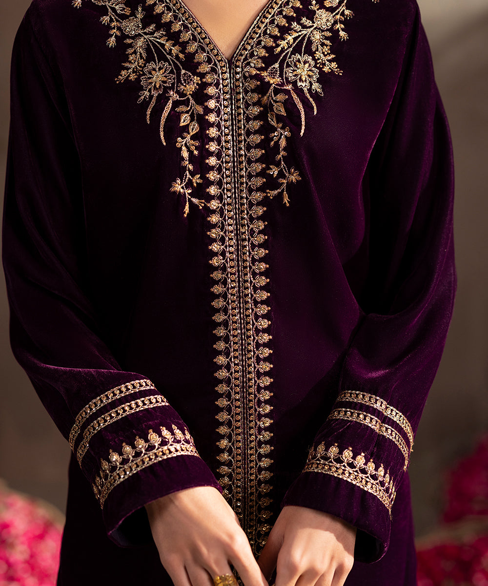 Description: This elegant two piece velvet ensemble in a rich berry hue exudes timeless sophistication. The front-open shirt features exquisite gold and beige tone embroidery highlighted with shiny golden sequins, adding a luxurious sparkle. Delicate floral motifs adorn the neckline, sleeves, and hem, enhancing its regal appeal. Paired with straight-cut velvet pants, this outfit is perfect for festive evenings and winter soirées.