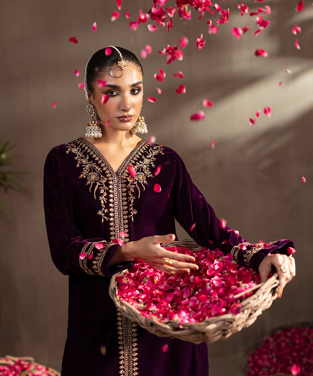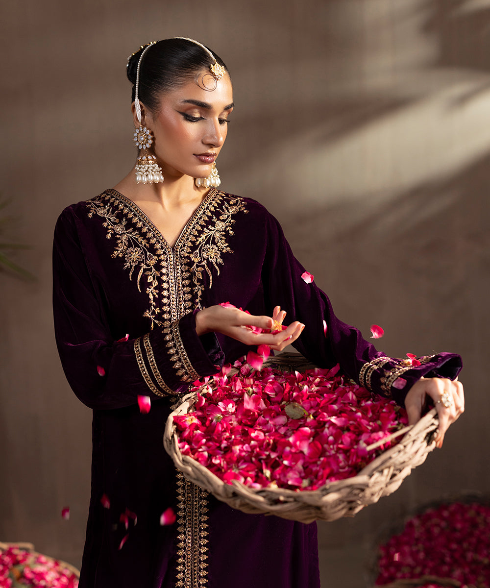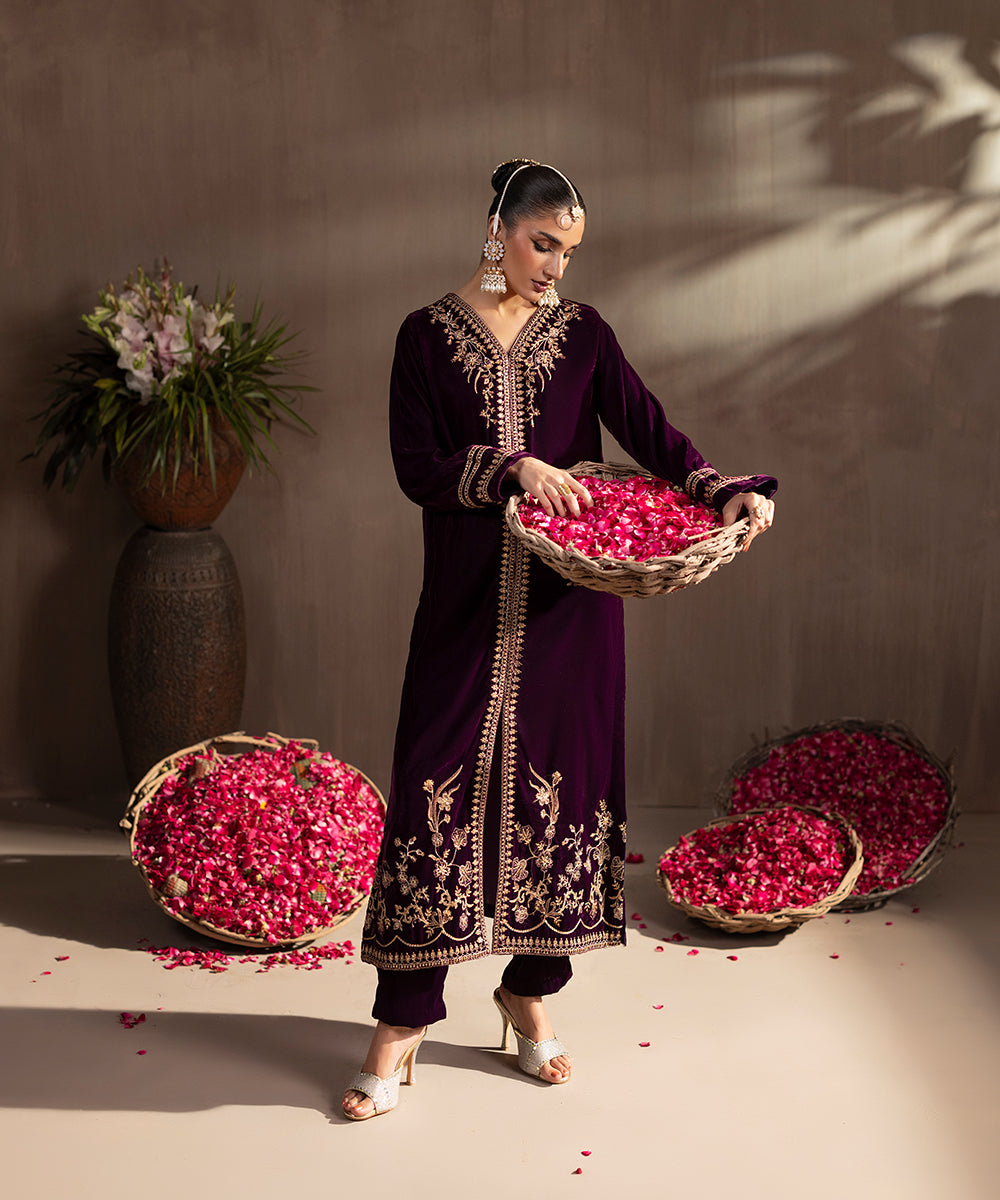 Description: This elegant two piece velvet ensemble in a rich berry hue exudes timeless sophistication. The front-open shirt features exquisite gold and beige tone embroidery highlighted with shiny golden sequins, adding a luxurious sparkle. Delicate floral motifs adorn the neckline, sleeves, and hem, enhancing its regal appeal. Paired with straight-cut velvet pants, this outfit is perfect for festive evenings and winter soirées.