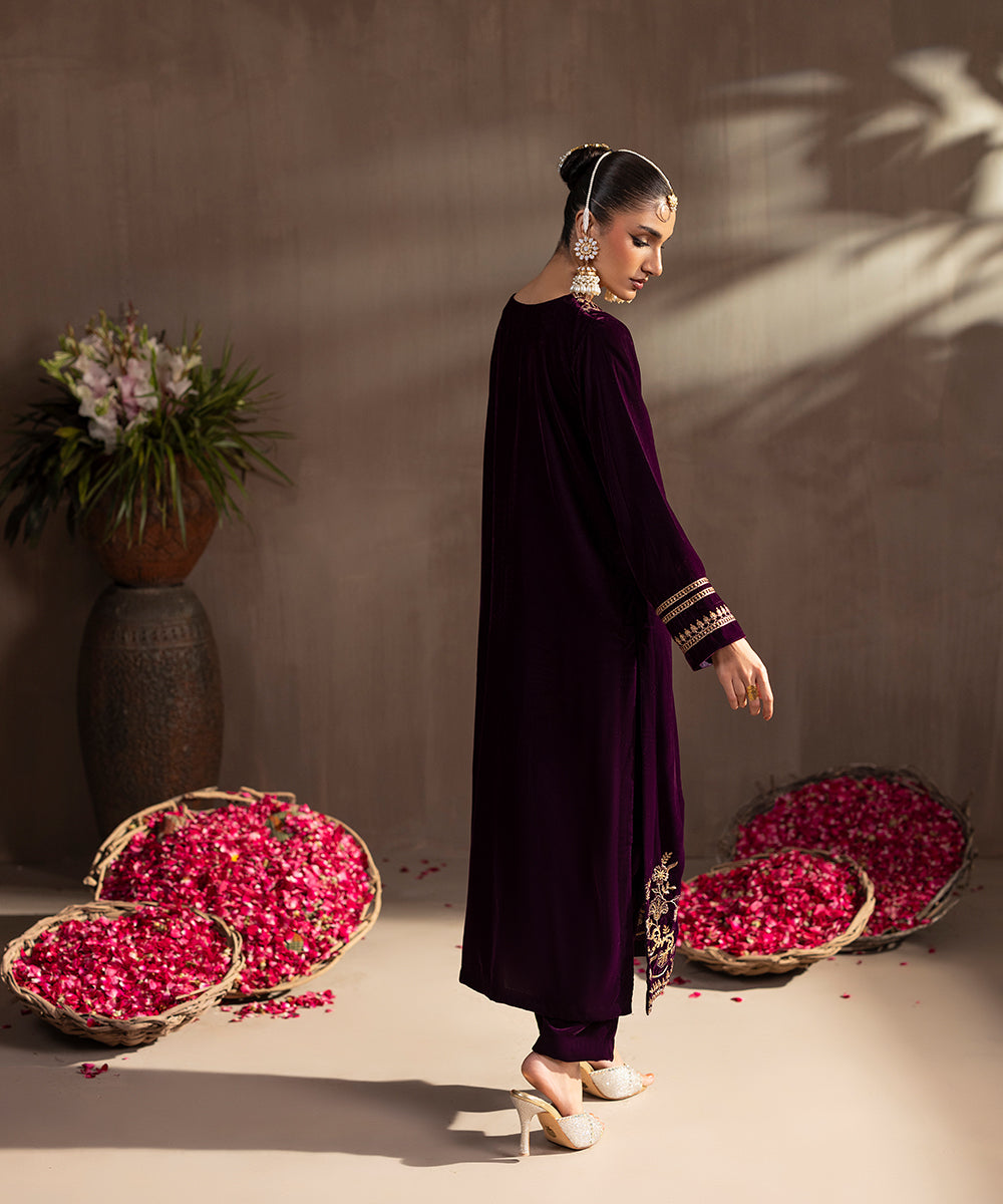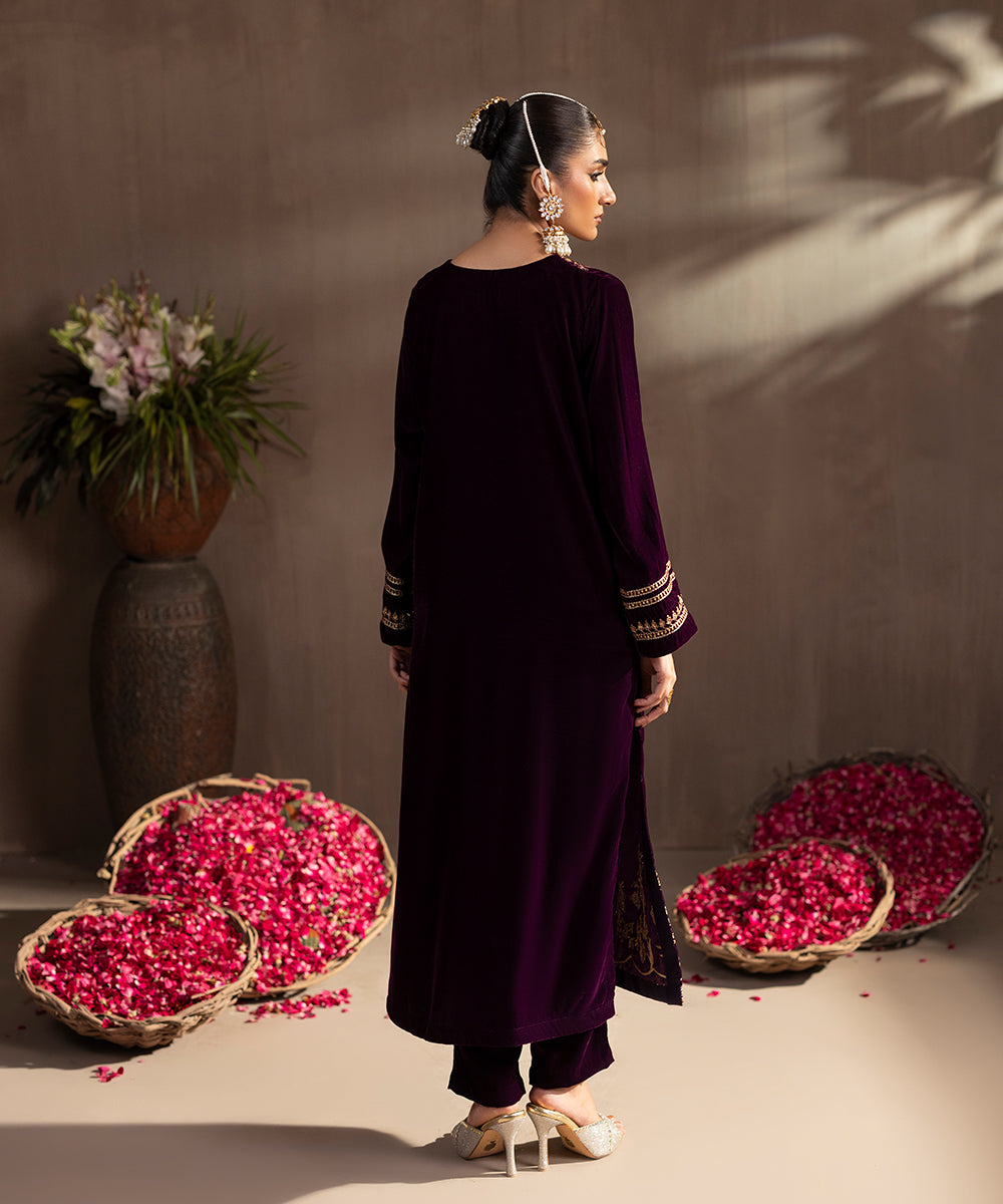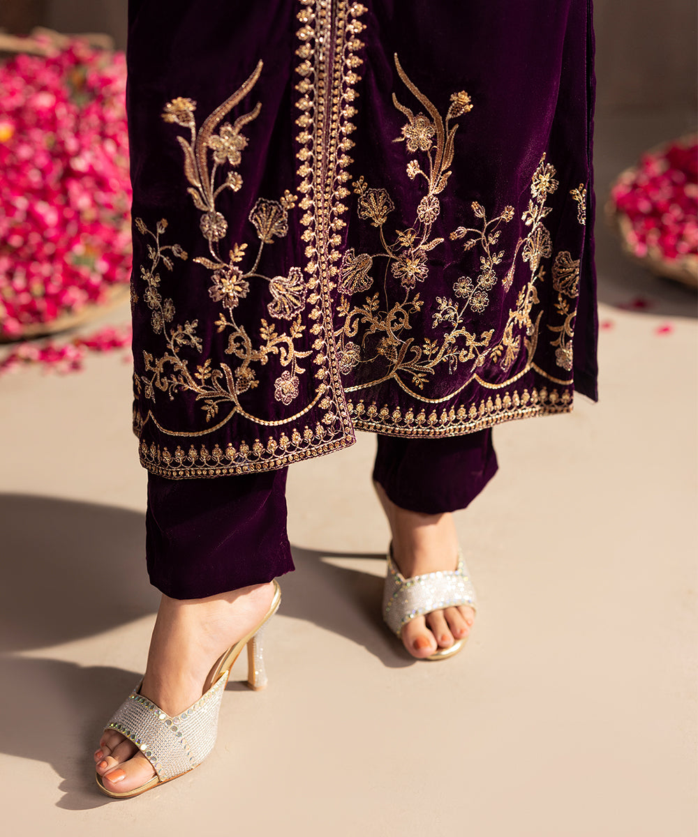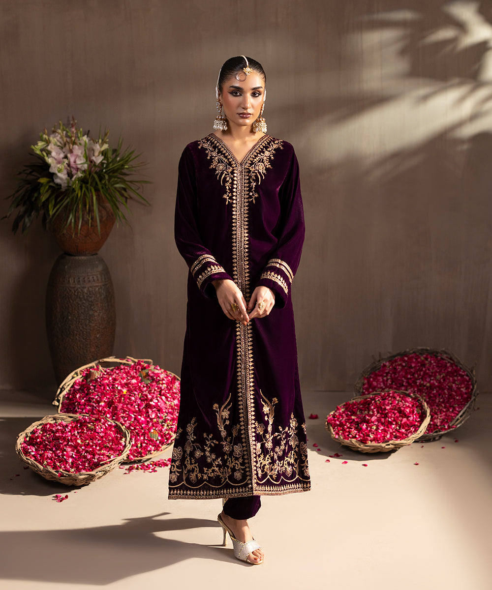 Description: This elegant two piece velvet ensemble in a rich berry hue exudes timeless sophistication. The front-open shirt features exquisite gold and beige tone embroidery highlighted with shiny golden sequins, adding a luxurious sparkle. Delicate floral motifs adorn the neckline, sleeves, and hem, enhancing its regal appeal. Paired with straight-cut velvet pants, this outfit is perfect for festive evenings and winter soirées.