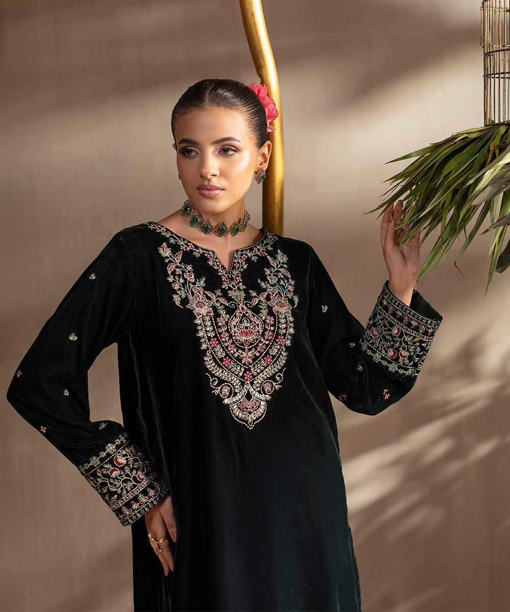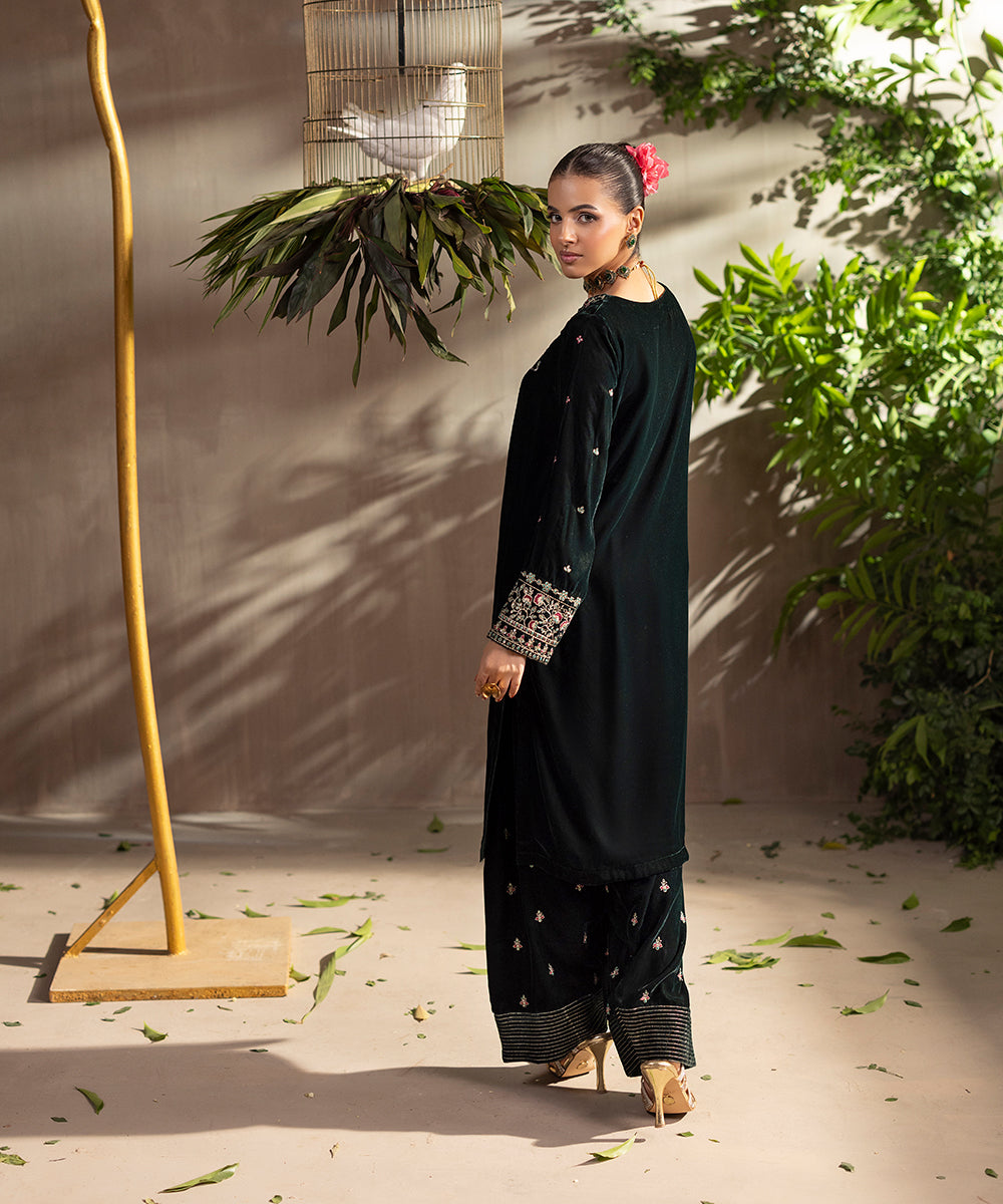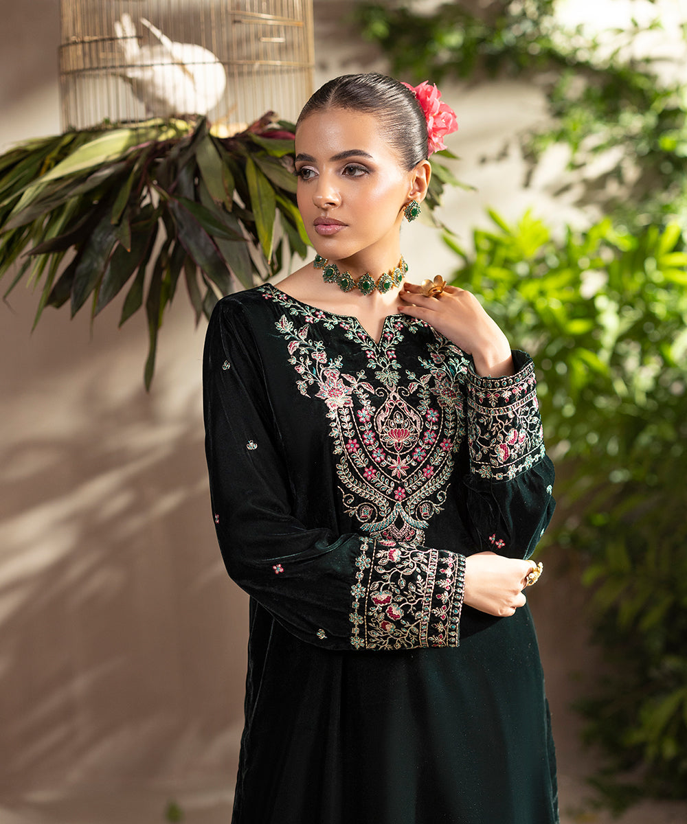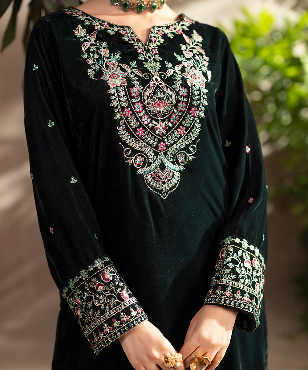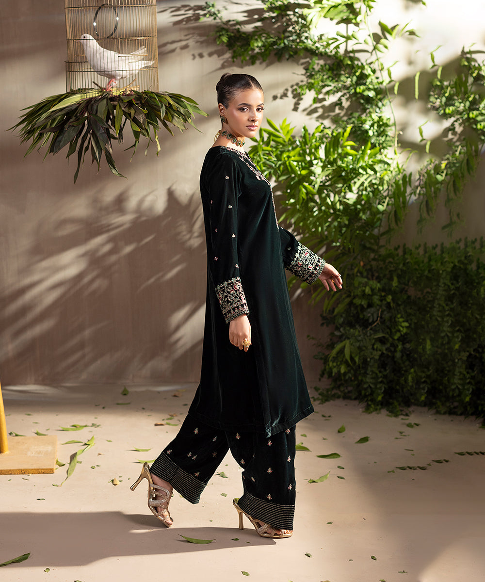 Description: This vibrant two piece bottle green velvet ensemble features multicolored embroidery enhanced with golden tilla and sequin accents, creating a rich festive appeal. The design includes a decorative sleeve border and is paired with a farshi shalwar detailed with fine tilla stitching, blending traditional artistry with modern elegance.