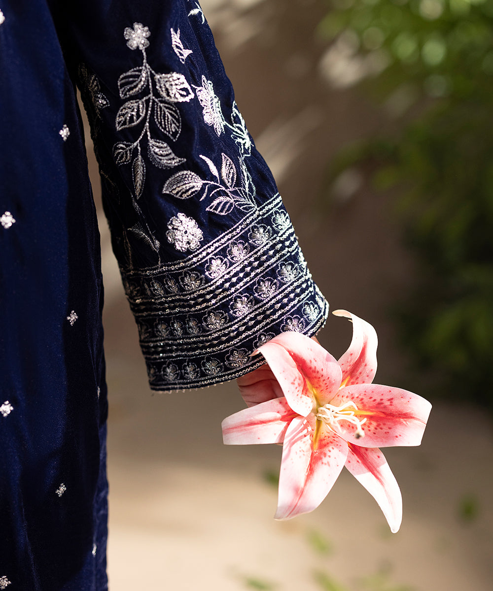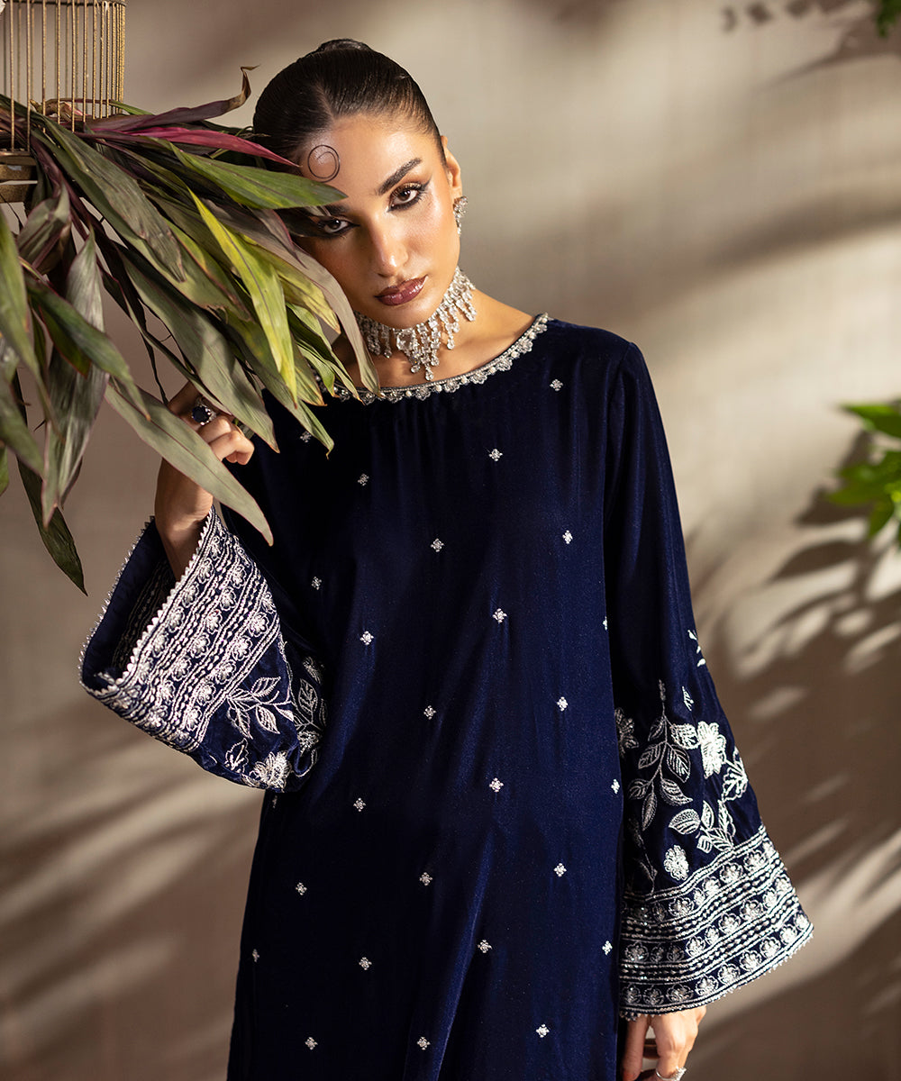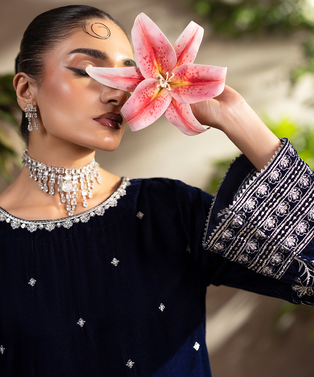 Description: A refined two-piece velvet ensemble in deep navy tones, beautifully accented with hints of silver and white. The shirt features an all-over delicate spray, an intricately crafted ada-work neckline, and elaborately embroidered sleeves, paired seamlessly with straight velvet pants for a graceful winter look.