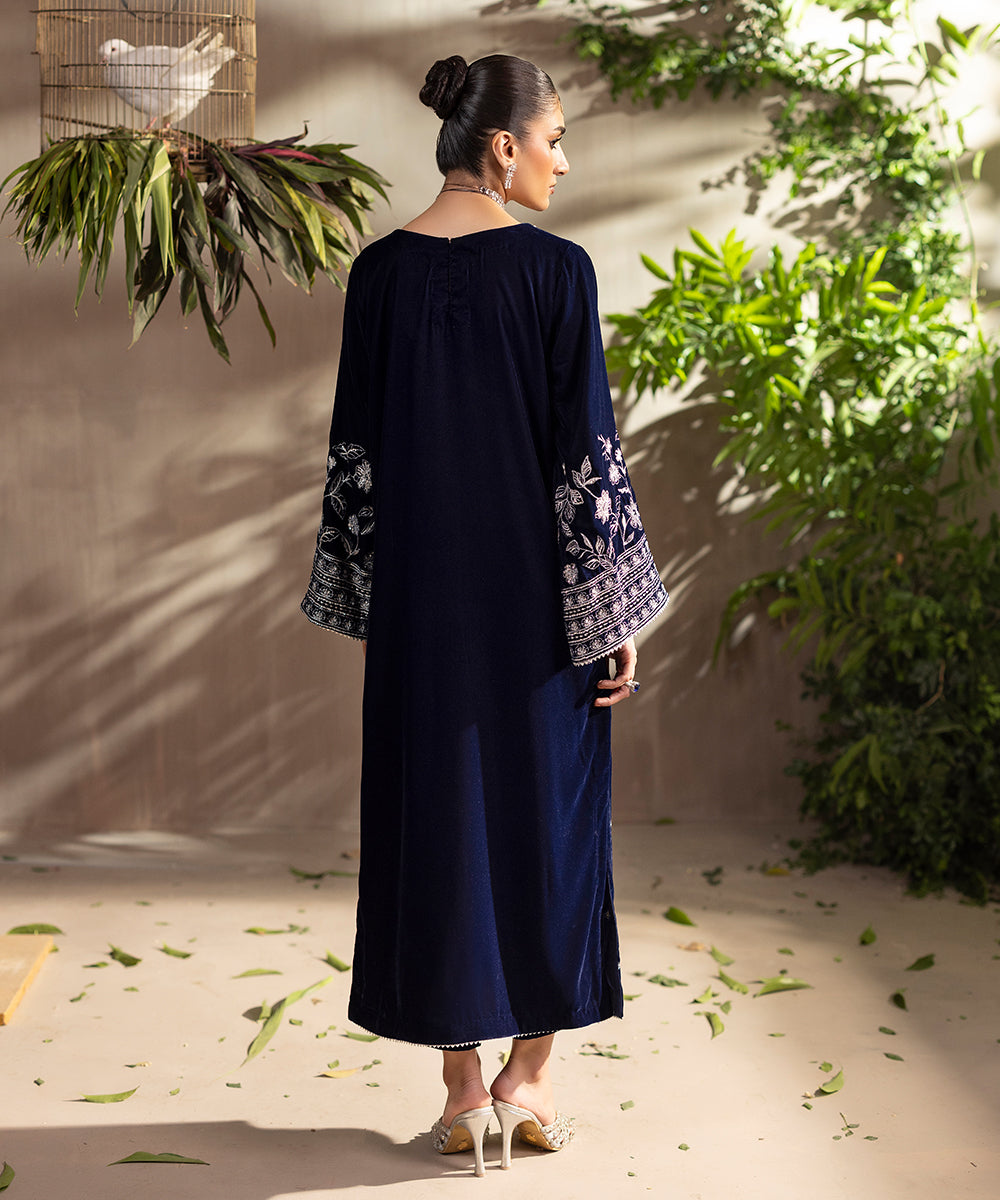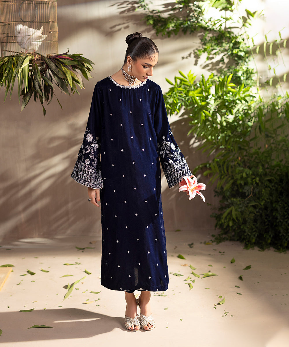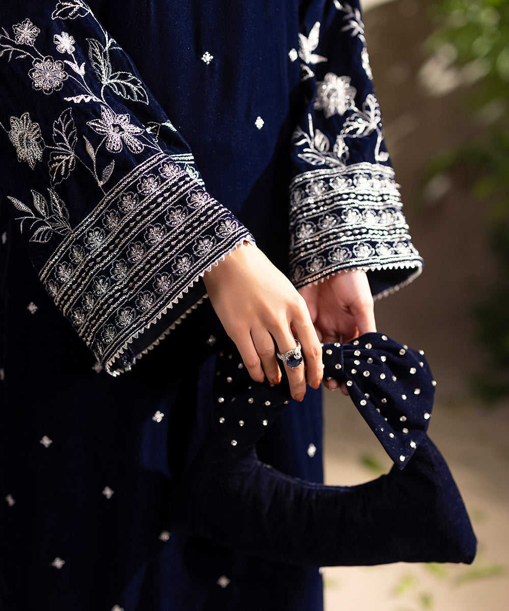 Description: A refined two-piece velvet ensemble in deep navy tones, beautifully accented with hints of silver and white. The shirt features an all-over delicate spray, an intricately crafted ada-work neckline, and elaborately embroidered sleeves, paired seamlessly with straight velvet pants for a graceful winter look.