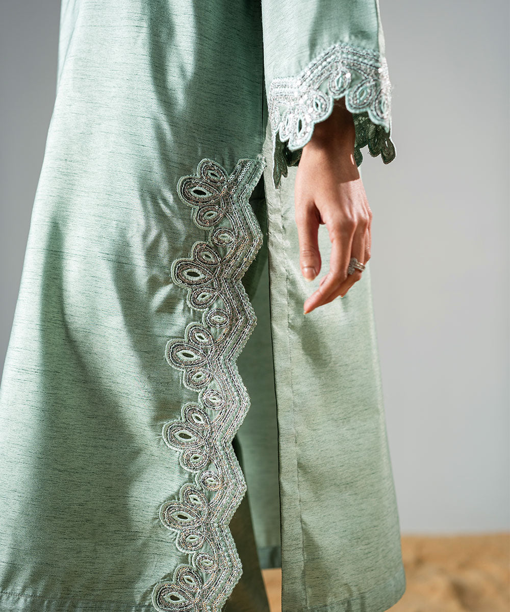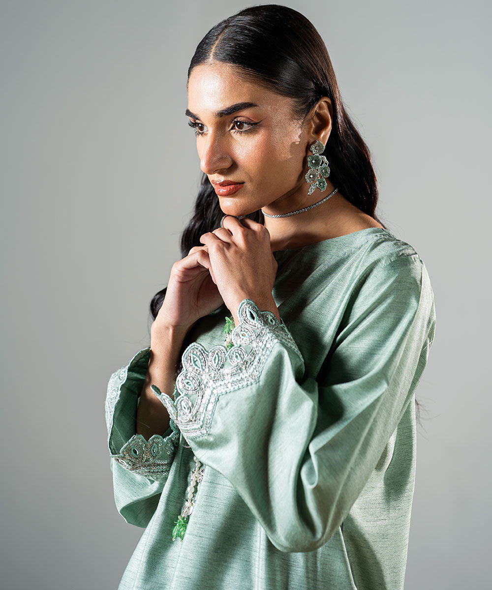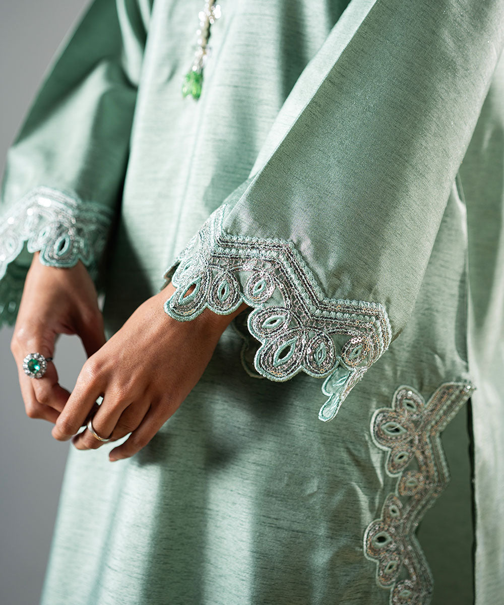 Description: This refreshing mint green raw silk outfit features delicate, trendy sleeves adorned with full silver sequins for a sparkling effect. The hemline is designed in a contemporary style, perfectly complementing the outfit’s chic aesthetic. The neckline is enhanced with elegant embellishments, adding a touch of sophistication. Ideal for festive occasions or special gatherings, this ensemble beautifully combines modern trends with timeless elegance.
