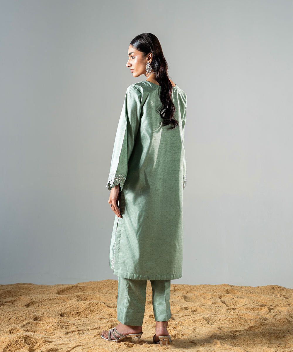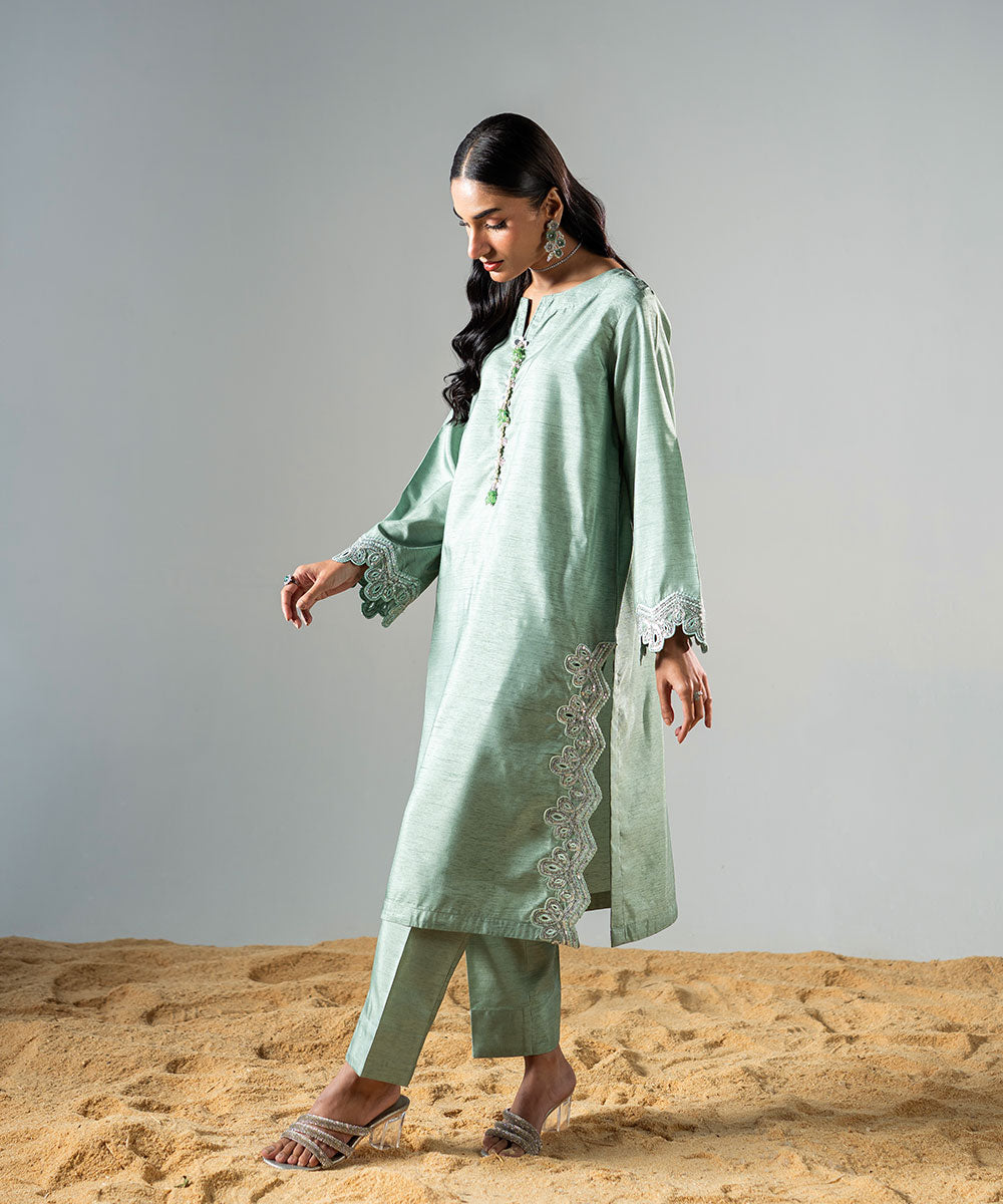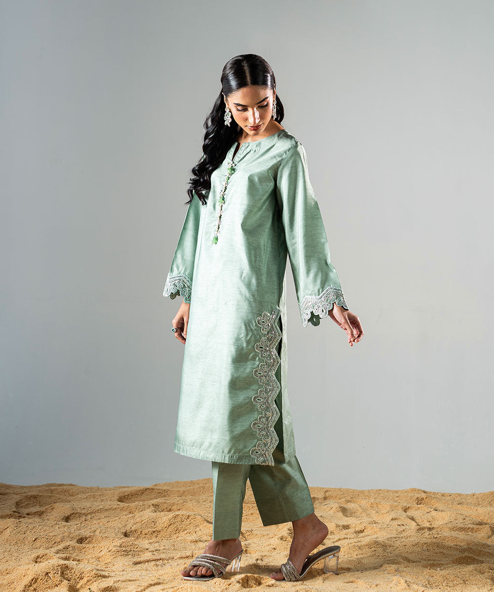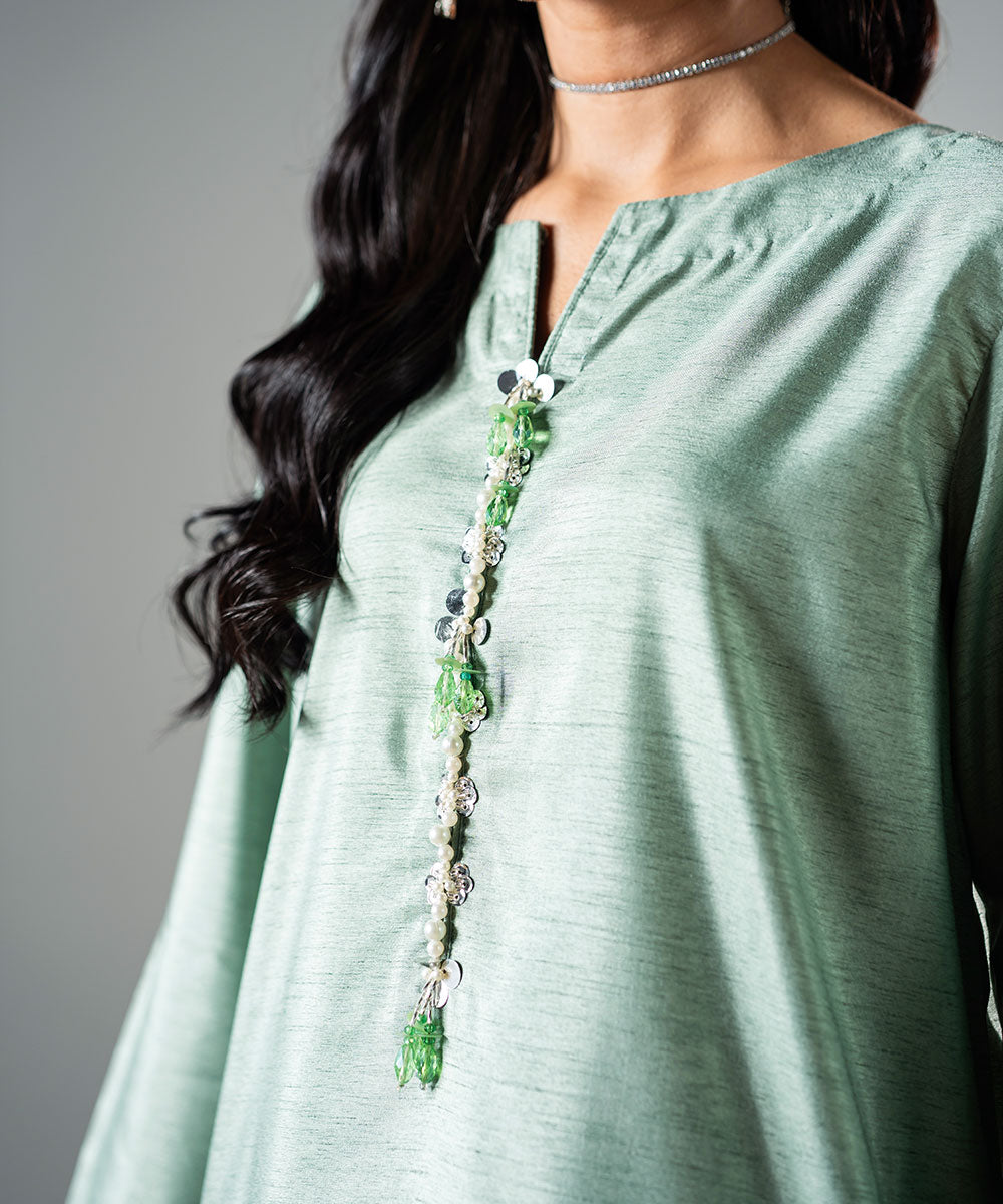 Description: This refreshing mint green raw silk outfit features delicate, trendy sleeves adorned with full silver sequins for a sparkling effect. The hemline is designed in a contemporary style, perfectly complementing the outfit’s chic aesthetic. The neckline is enhanced with elegant embellishments, adding a touch of sophistication. Ideal for festive occasions or special gatherings, this ensemble beautifully combines modern trends with timeless elegance.
