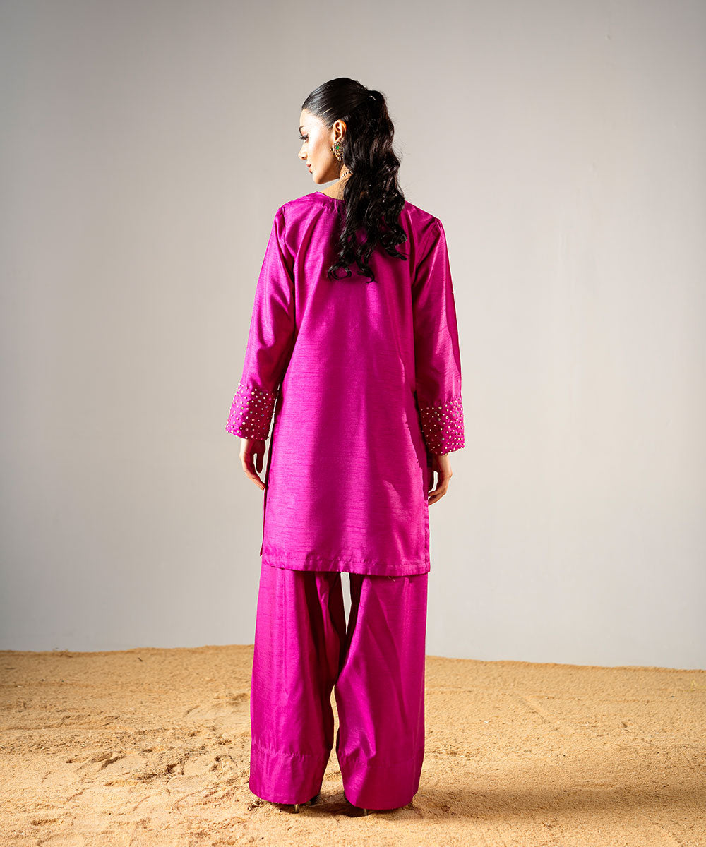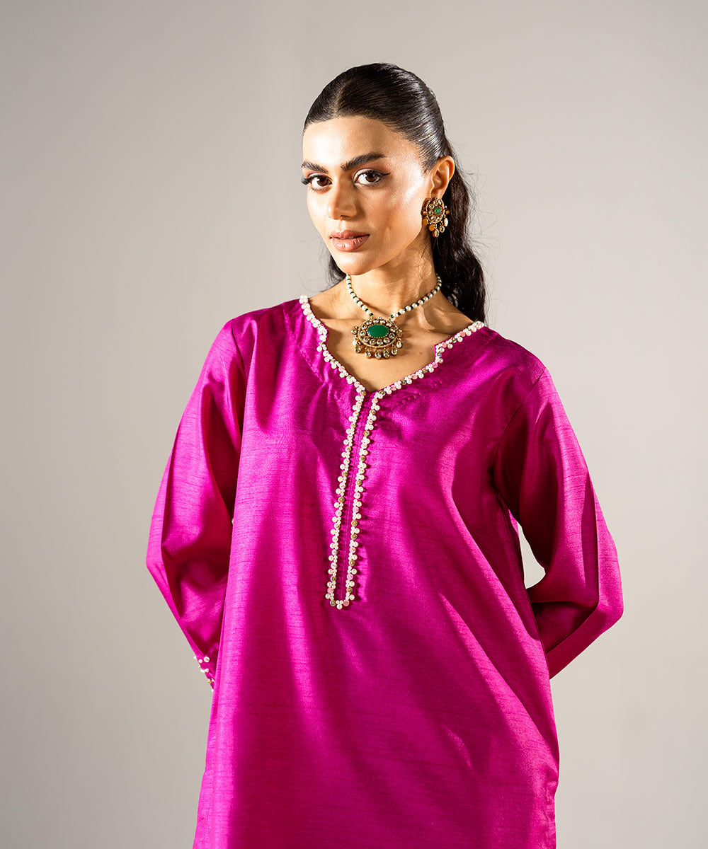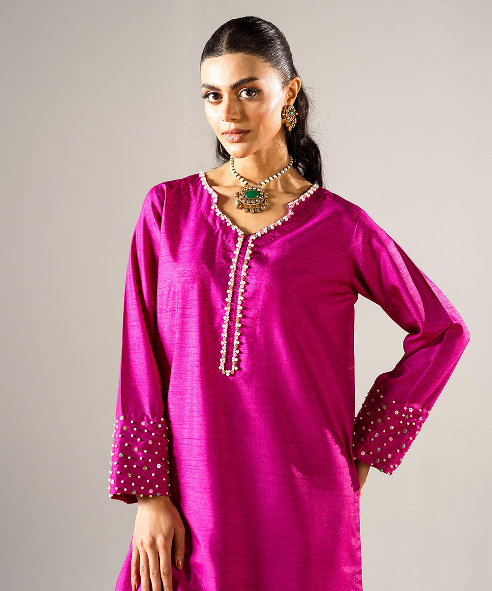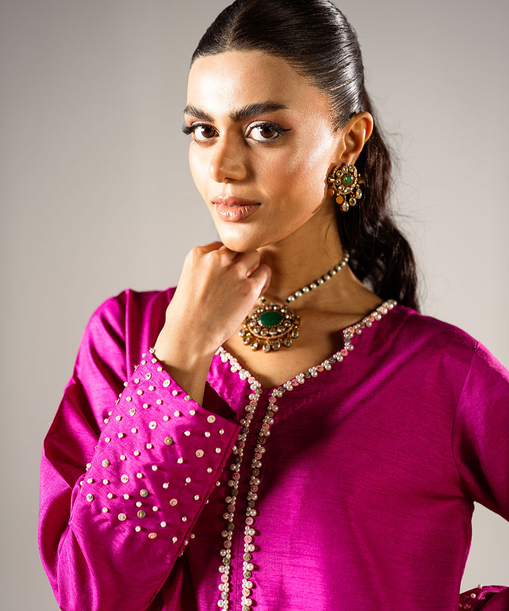 Description: This stunning two piece magenta raw silk outfit features delicate ada work on the neckline, adding an elegant handcrafted touch. The sleeves are adorned with matching intricate detailing, creating a beautifully balanced design. Paired with a traditional farshi shalwar, the ensemble exudes graceful charm with a luxurious feel. Perfect for festive gatherings and special occasions, it blends classic craftsmanship with timeless style.
