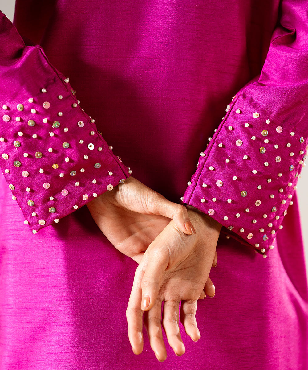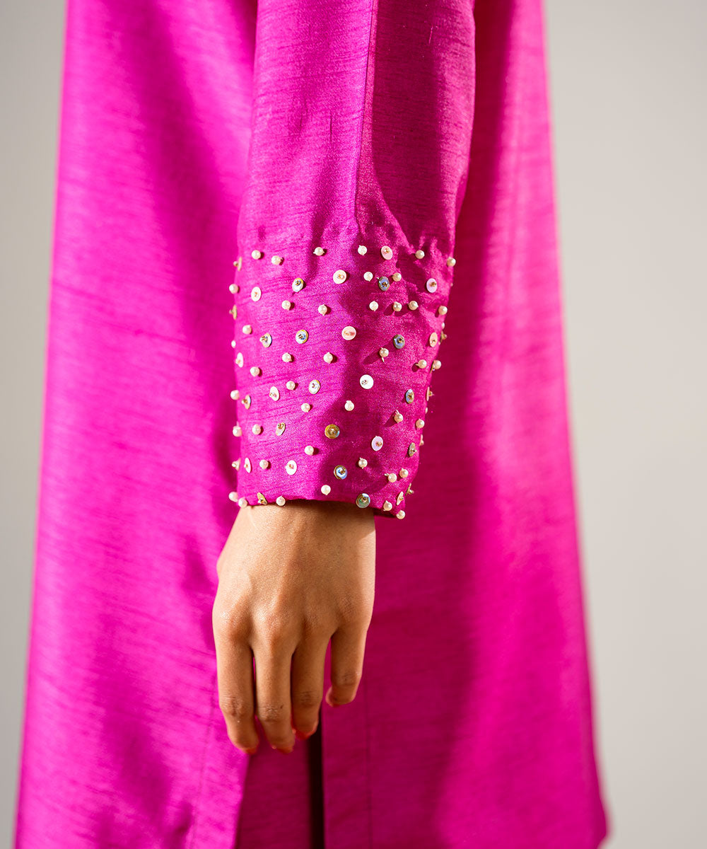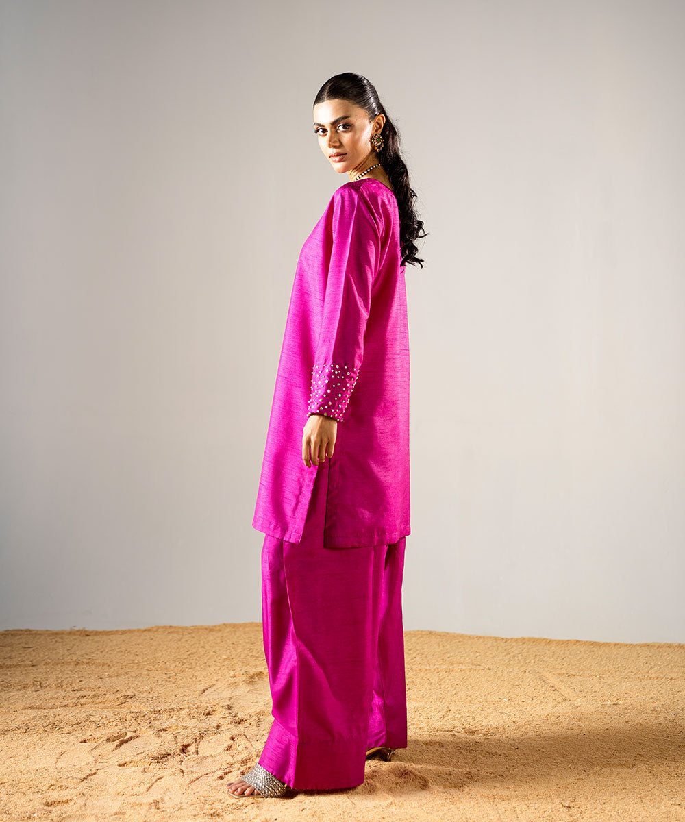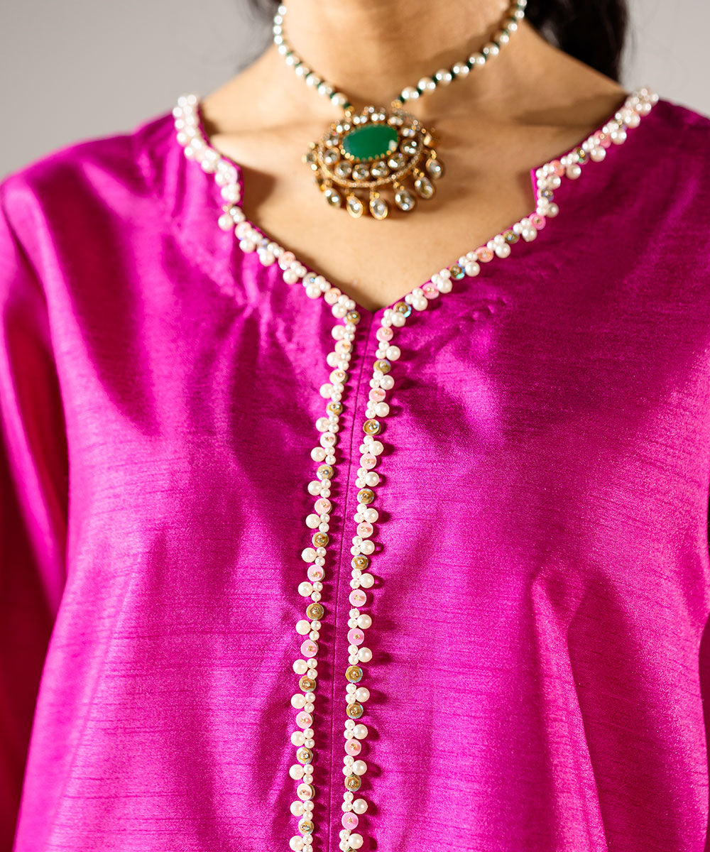 Description: This stunning two piece magenta raw silk outfit features delicate ada work on the neckline, adding an elegant handcrafted touch. The sleeves are adorned with matching intricate detailing, creating a beautifully balanced design. Paired with a traditional farshi shalwar, the ensemble exudes graceful charm with a luxurious feel. Perfect for festive gatherings and special occasions, it blends classic craftsmanship with timeless style.