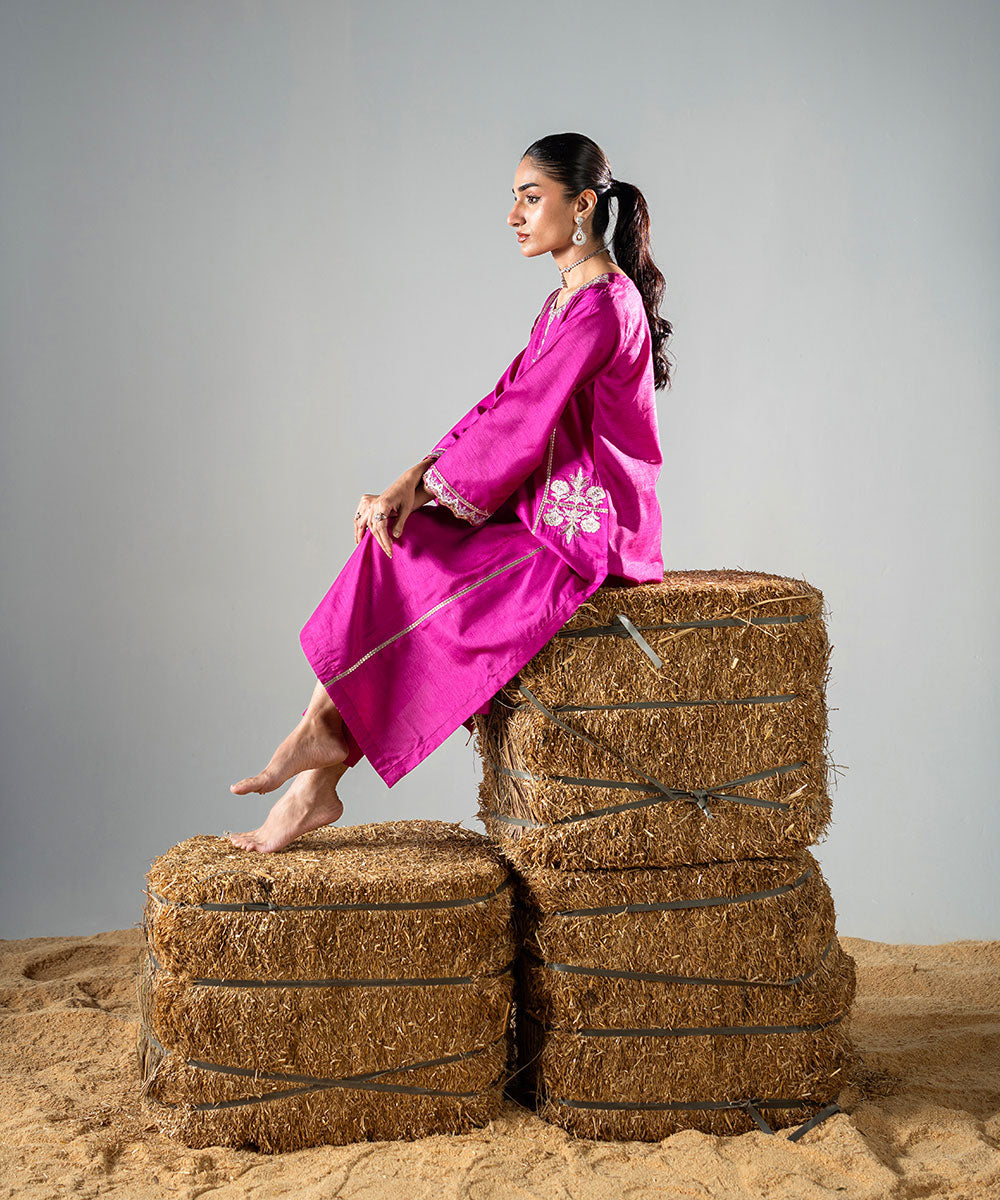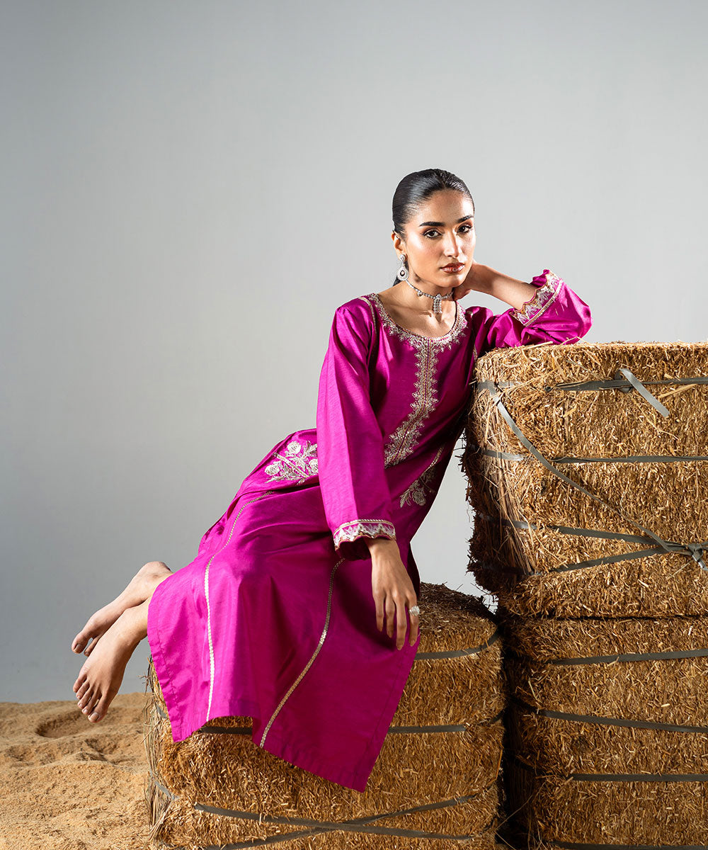 Description: This magenta raw silk outfit features a beautifully crafted embroidered neckline that adds elegance and richness to the design. The sleeves are enhanced with delicate embroidery, giving the ensemble a graceful and detailed finish. Made from premium raw silk, it offers a luxurious texture and refined sheen. Perfect for both special occasions and semi-formal wear, this piece blends classic charm with modern sophistication.