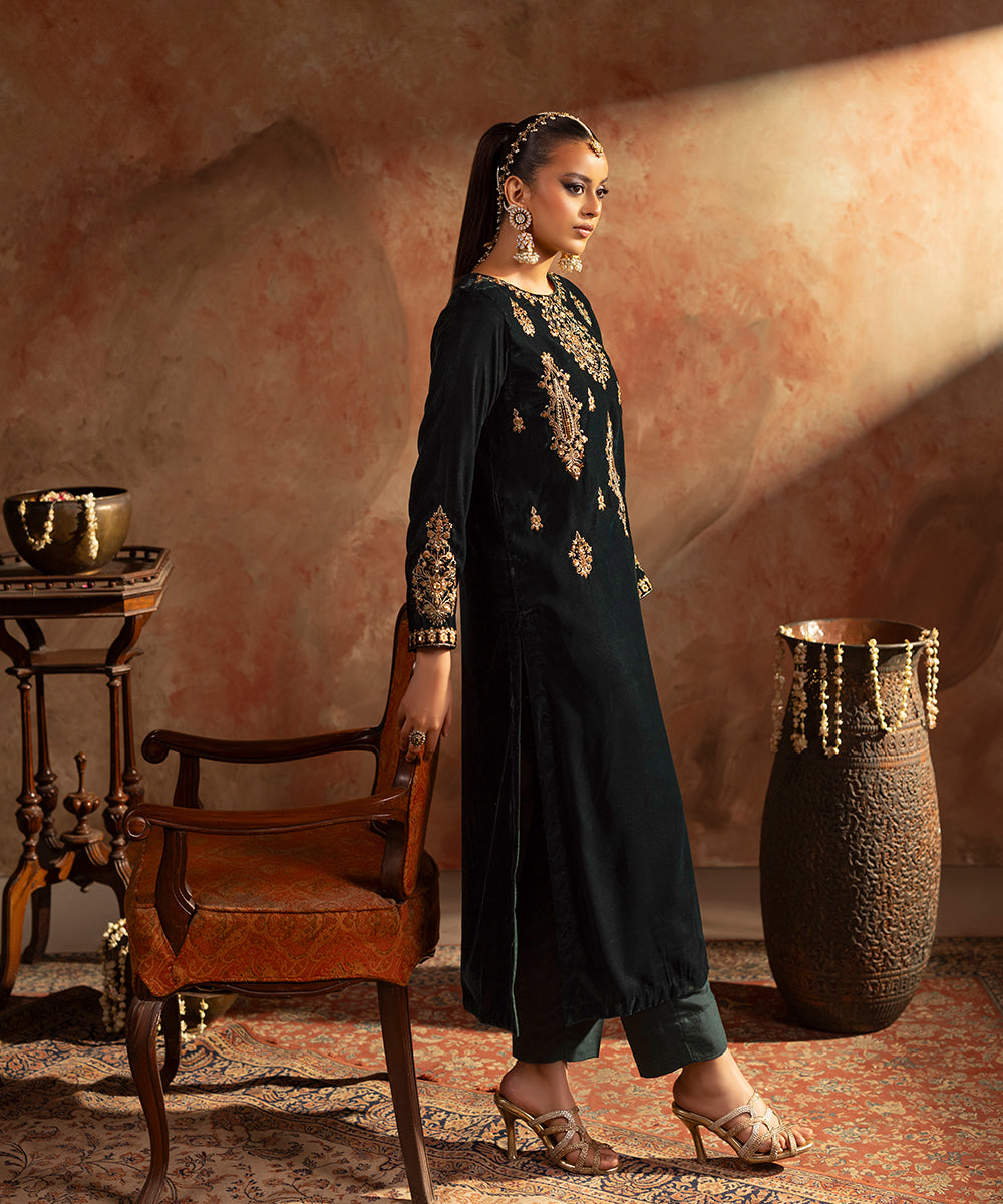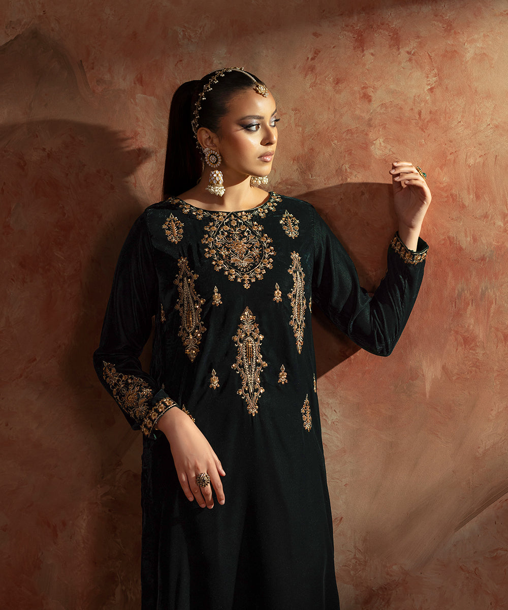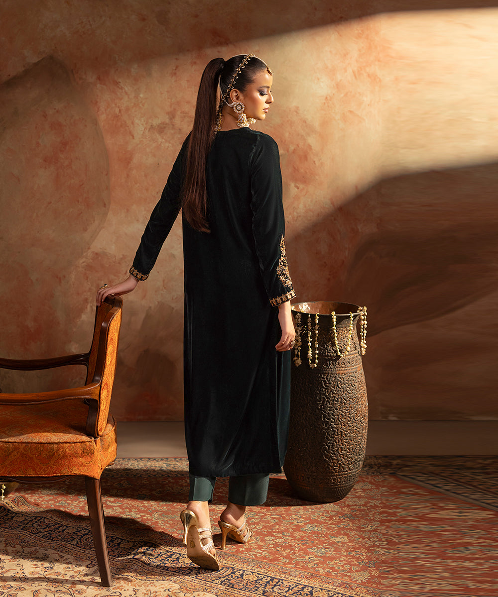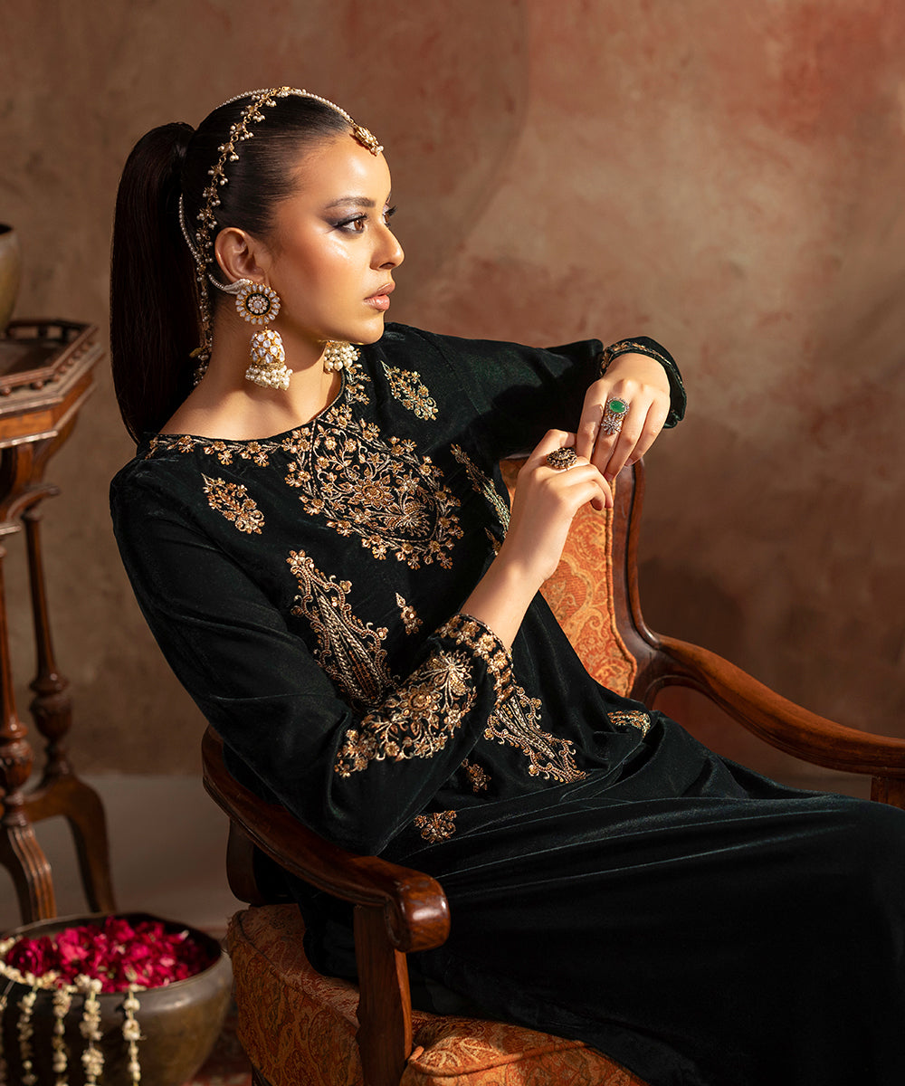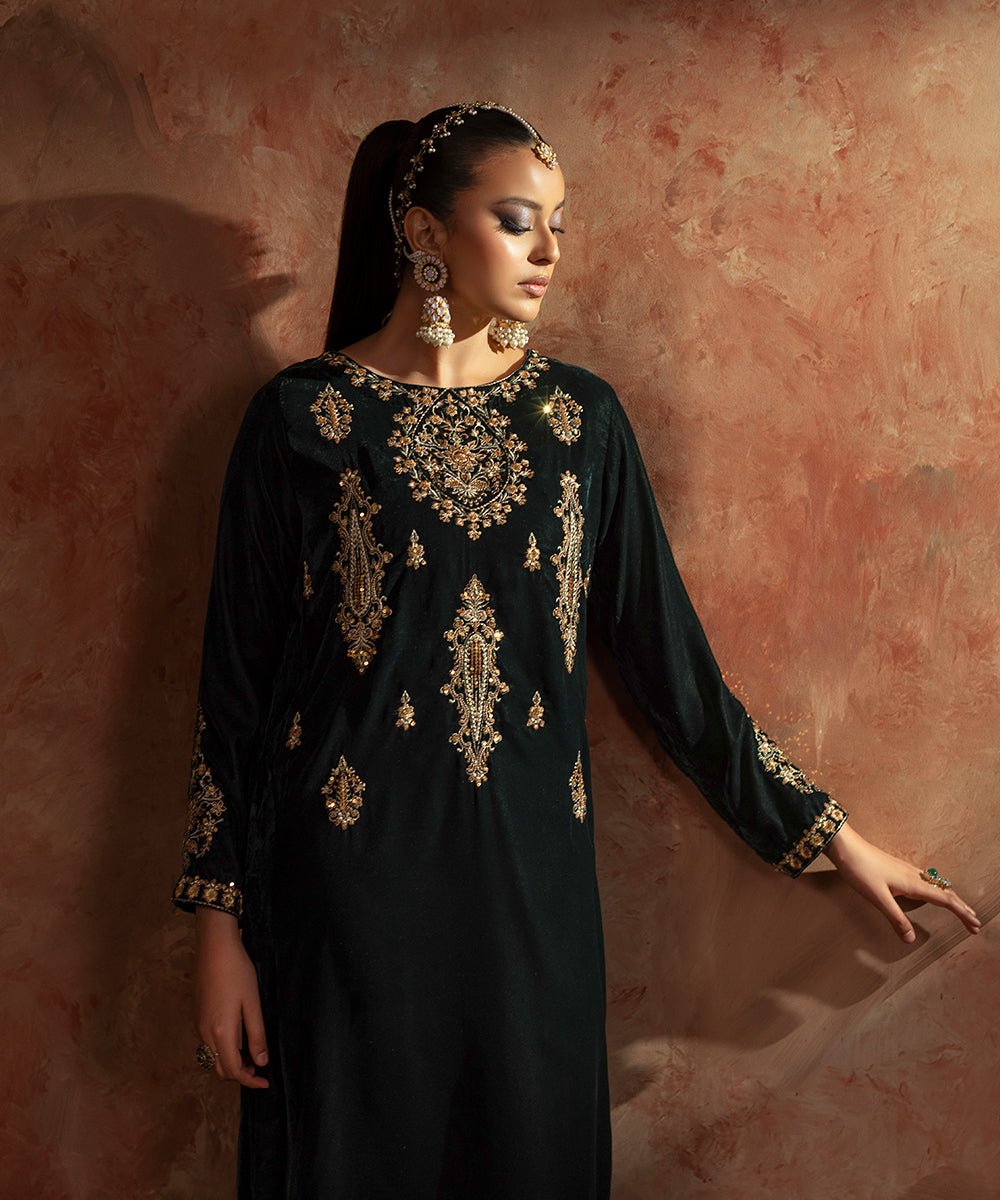 Description: This timeless bottle green velvet outfit showcases traditional embroidered motifs crafted with dual tilla work and golden sequins, creating a rich, heritage-inspired look. The design is further enhanced with matching sleeve motifs, adding depth and elegance to this graceful one-piece ensemble.