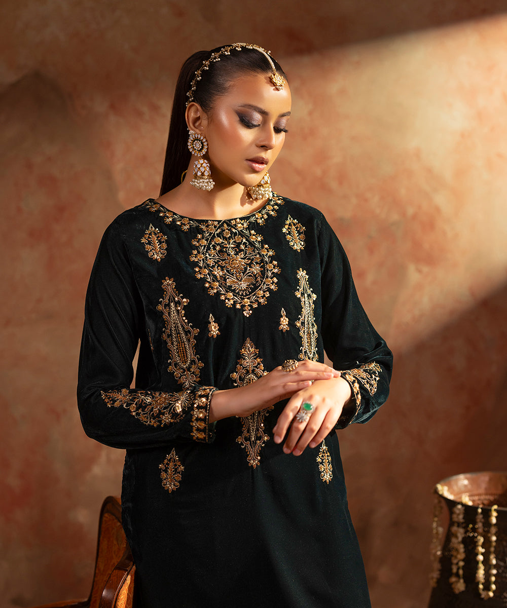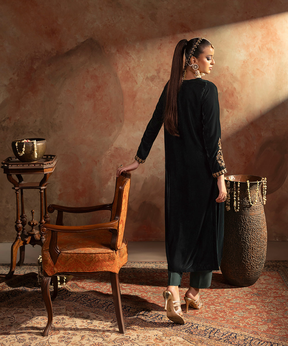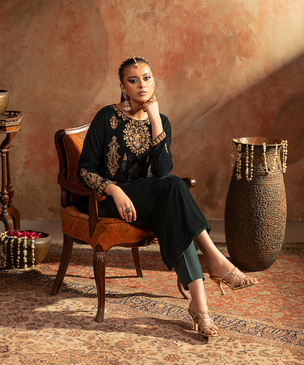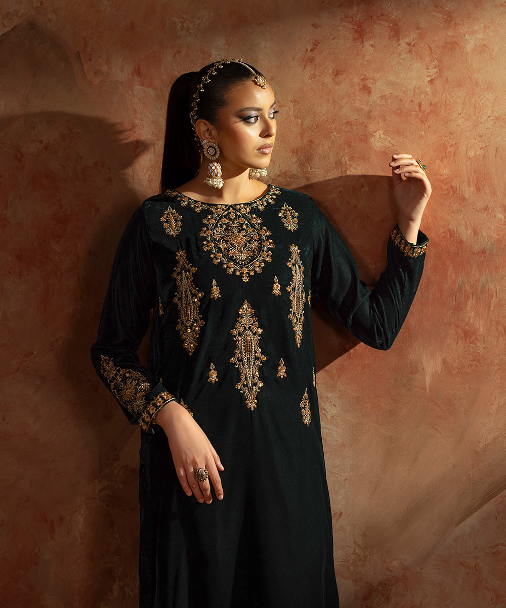 Description: This timeless bottle green velvet outfit showcases traditional embroidered motifs crafted with dual tilla work and golden sequins, creating a rich, heritage-inspired look. The design is further enhanced with matching sleeve motifs, adding depth and elegance to this graceful one-piece ensemble.