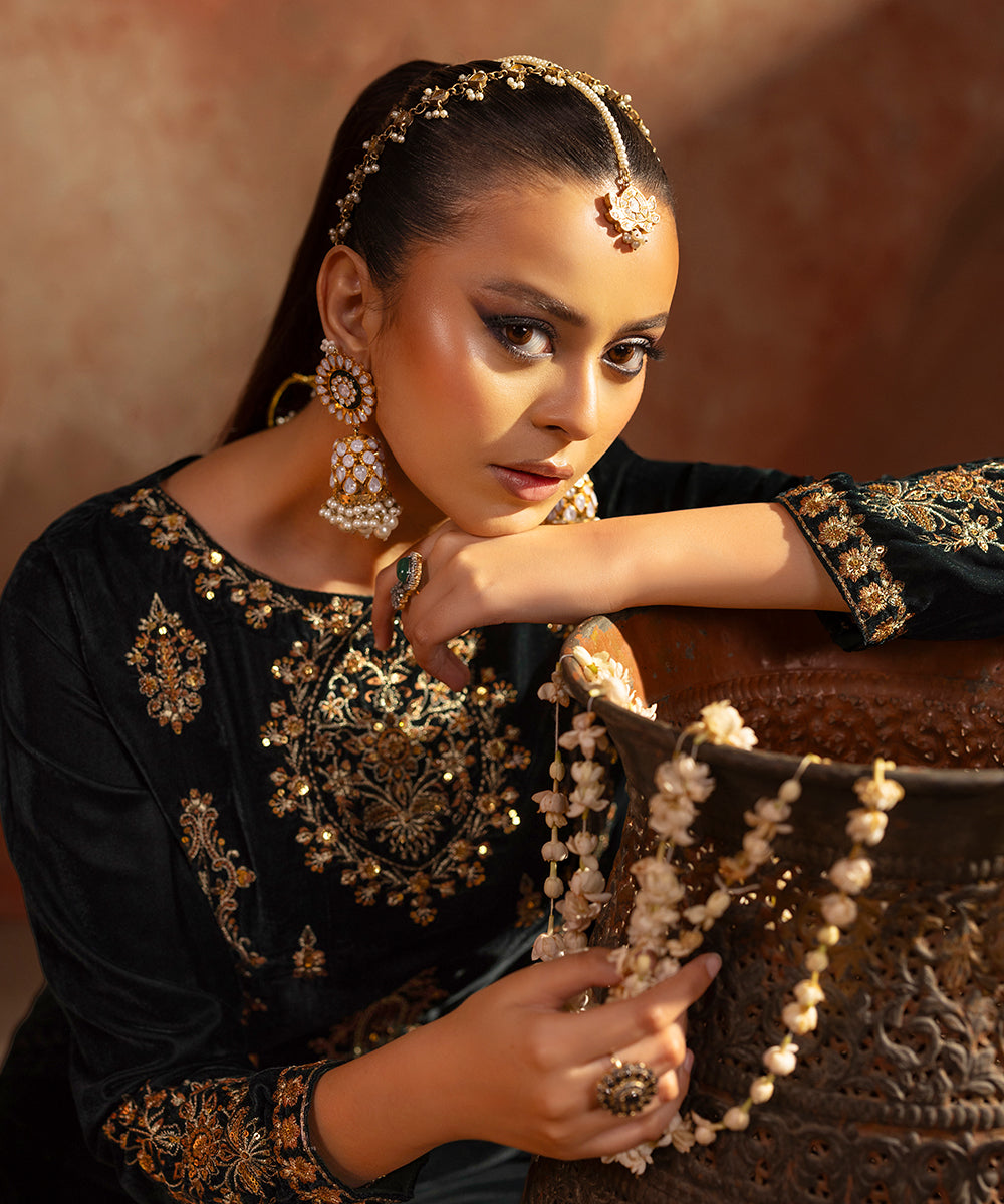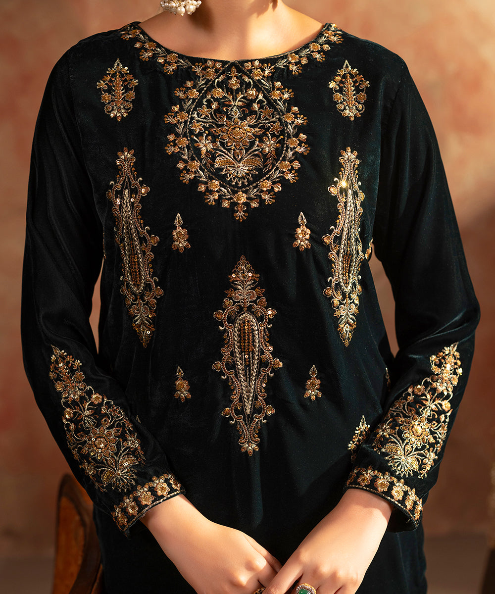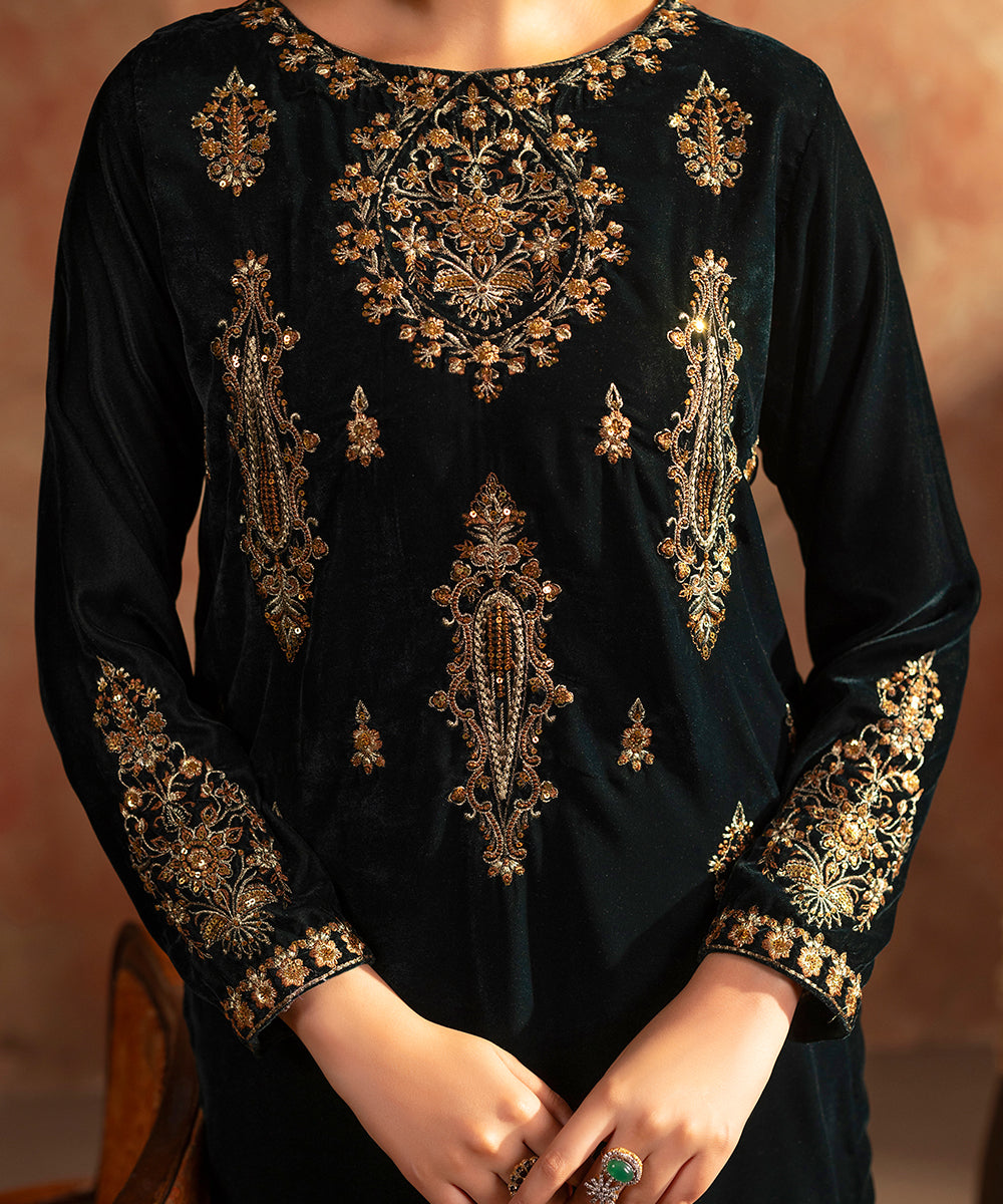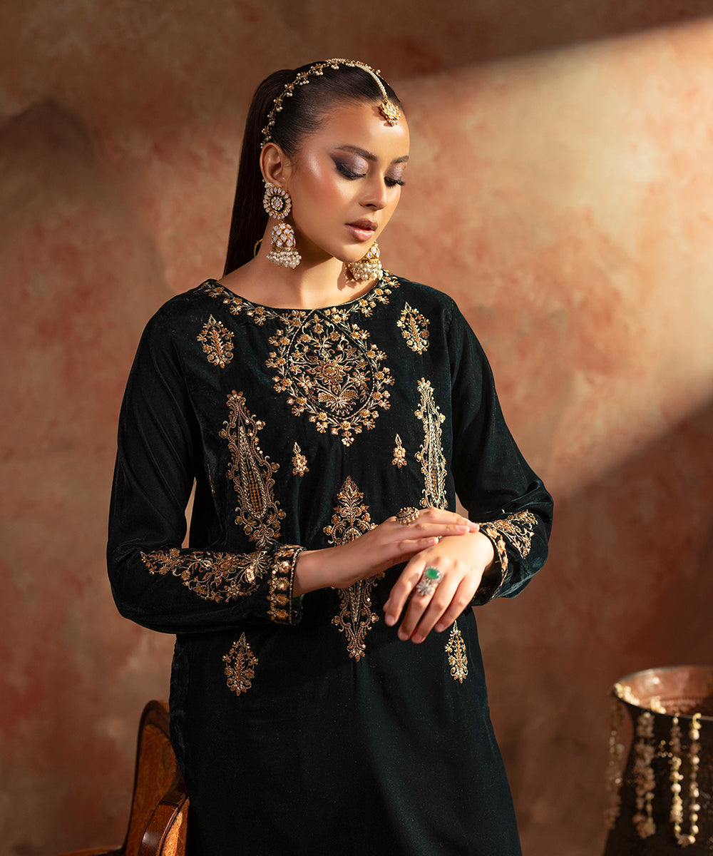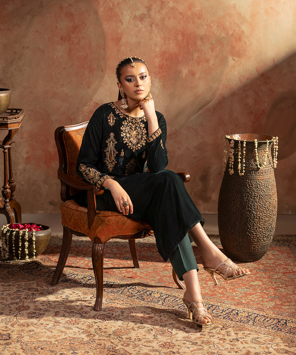Description: This timeless bottle green velvet outfit showcases traditional embroidered motifs crafted with dual tilla work and golden sequins, creating a rich, heritage-inspired look. The design is further enhanced with matching sleeve motifs, adding depth and elegance to this graceful one-piece ensemble.