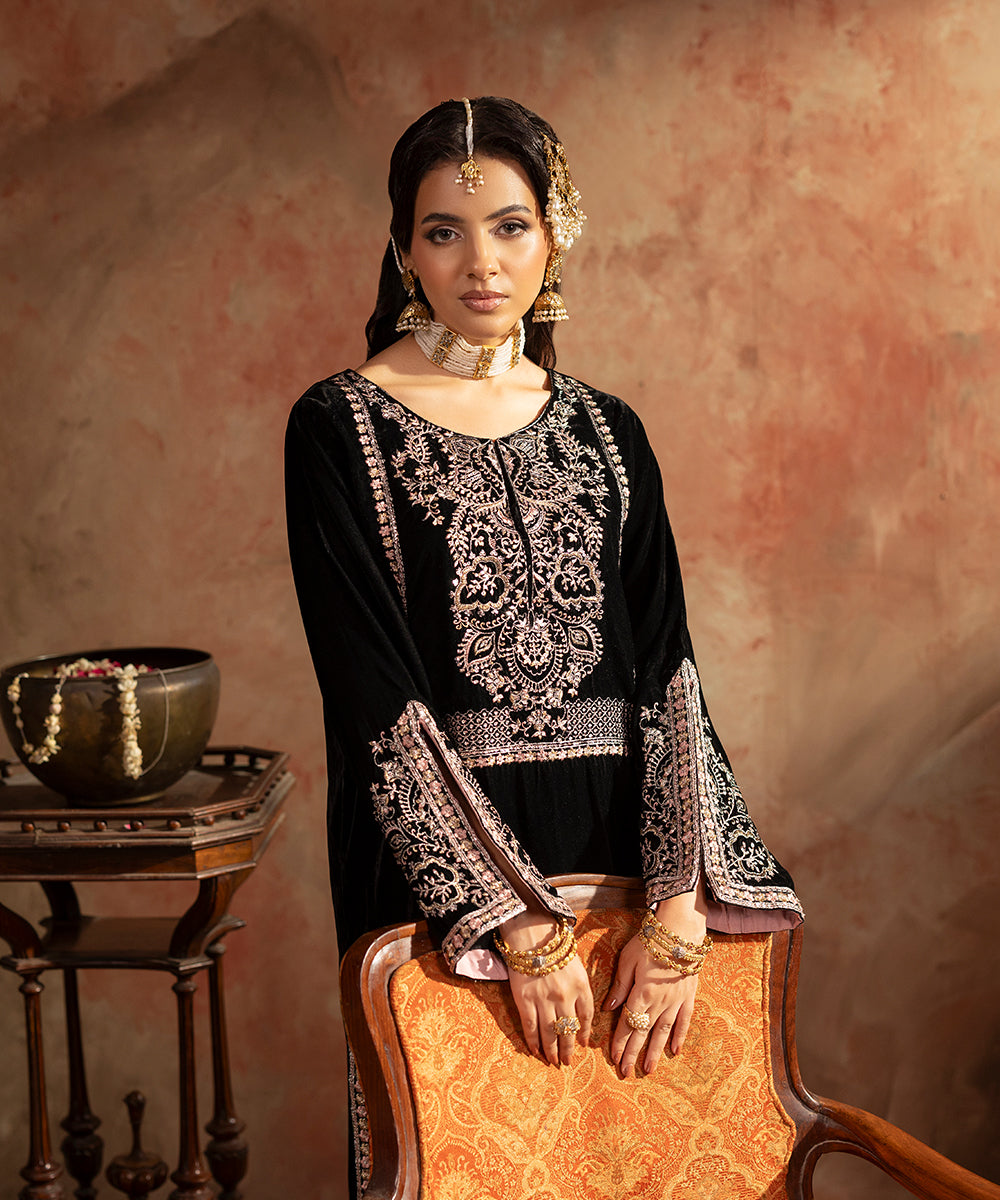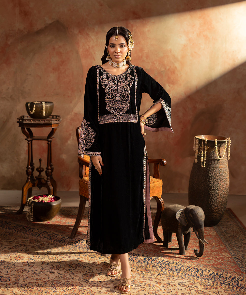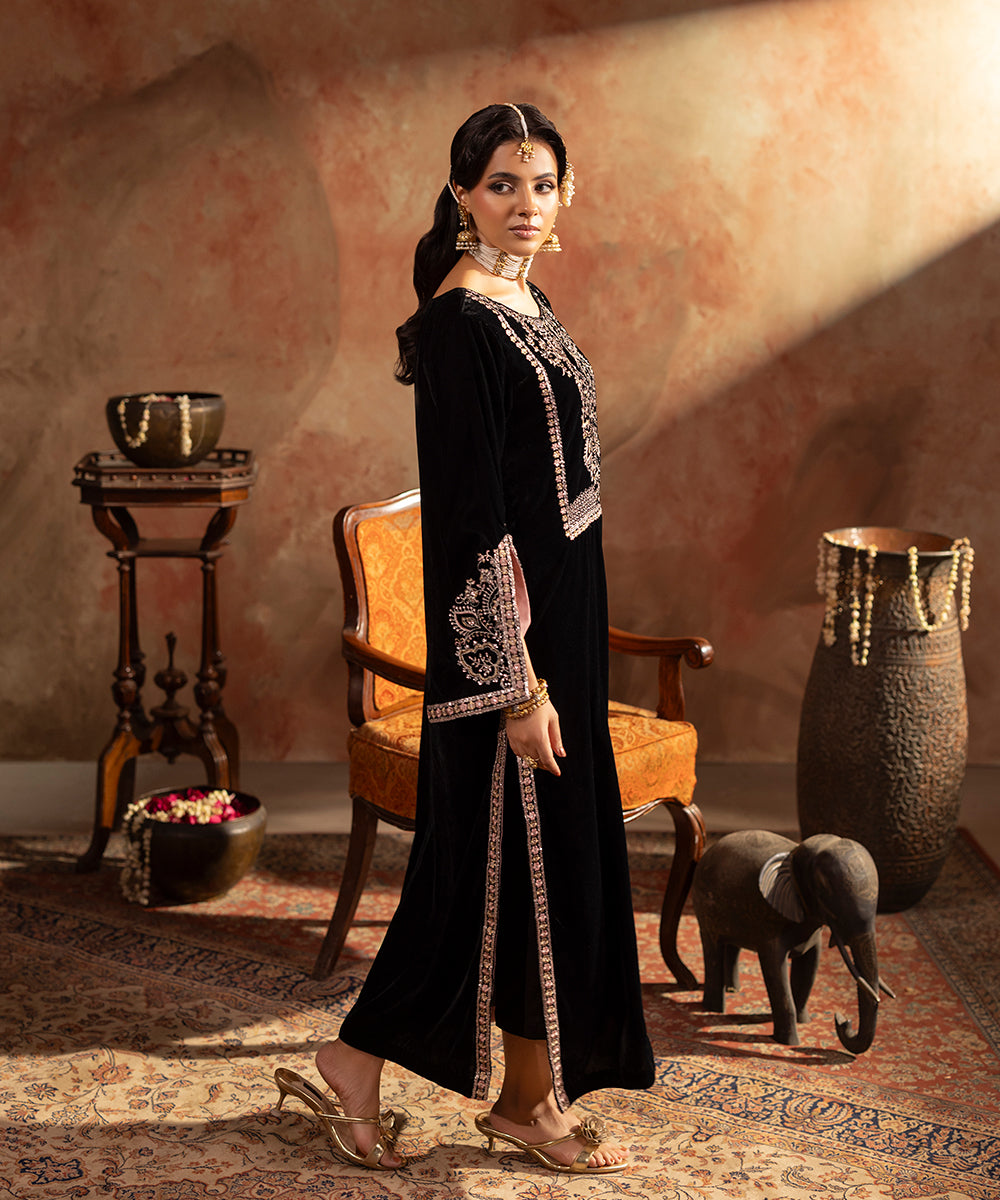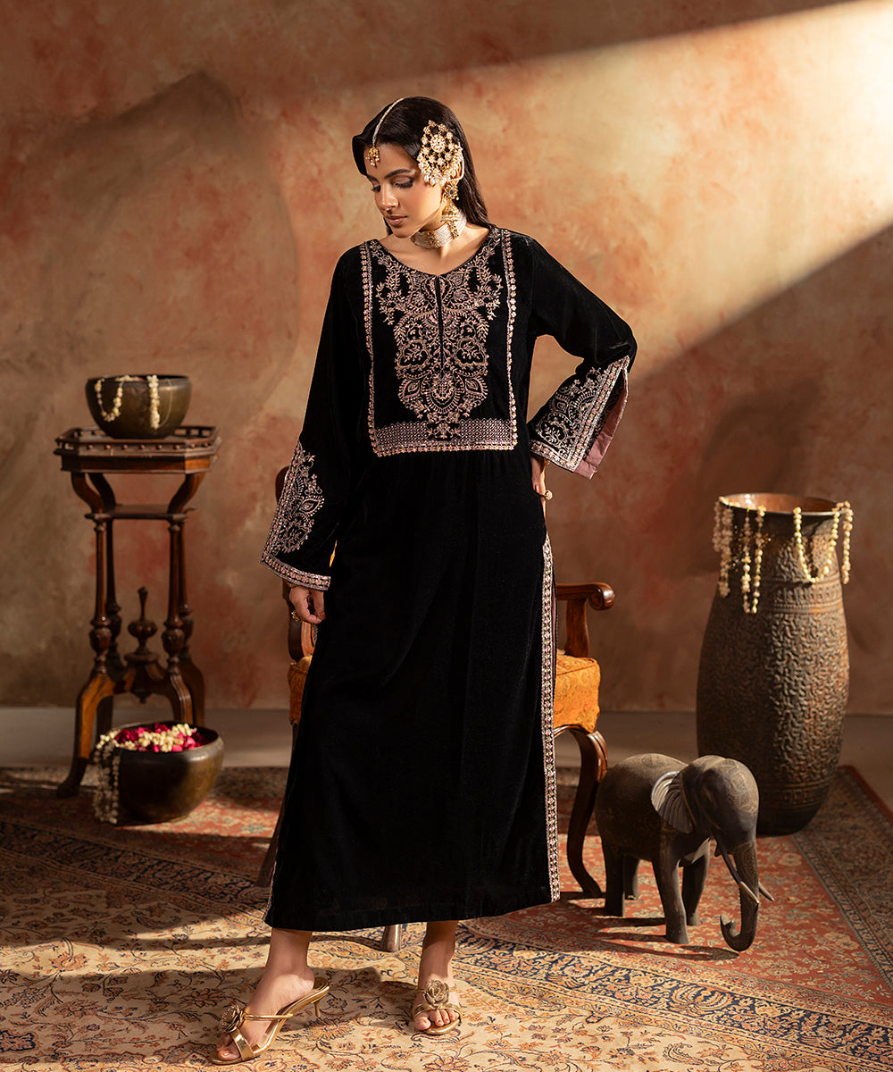 Description: A luxurious one piece black velvet shirt adorned with delicate embroidery in shades of silver, white, and pastel pink. The design features an elegantly embellished neckline and artistically composed sleeves, adding refined charm to the ensemble. Finished with a graceful center slit on sleeves, this piece exudes timeless sophistication and understated glamour.