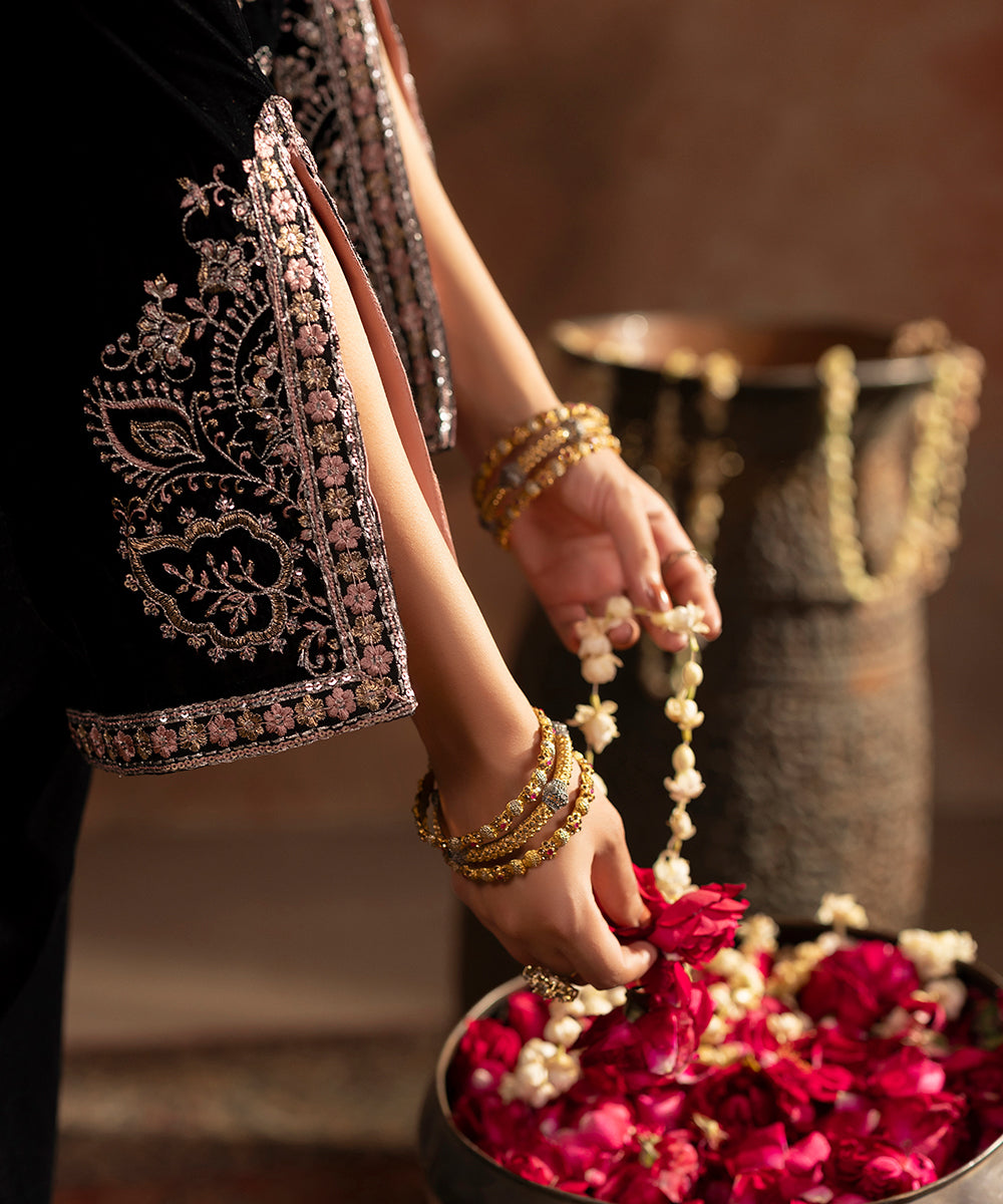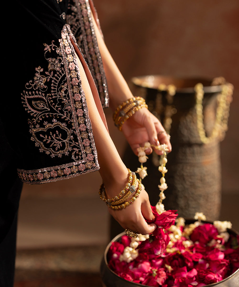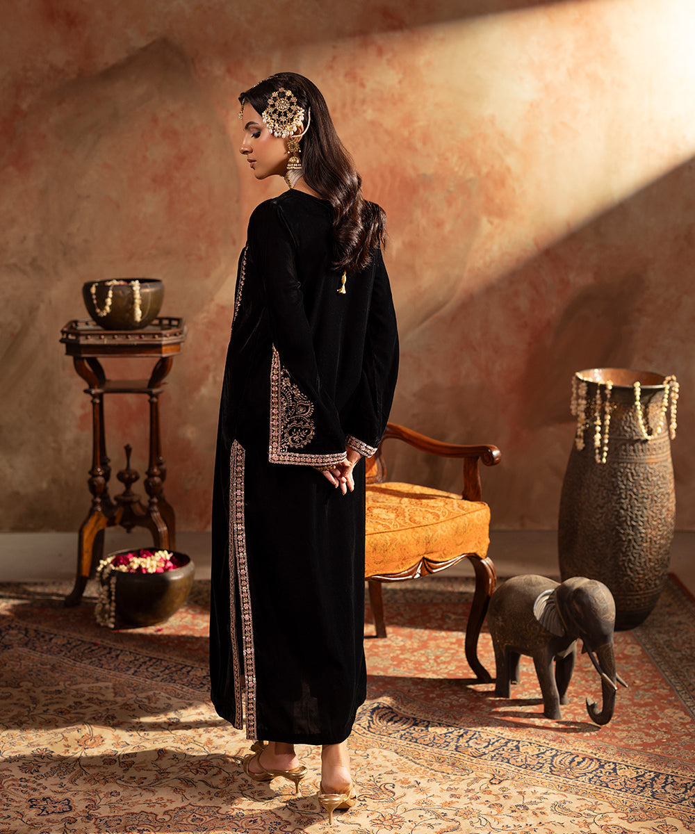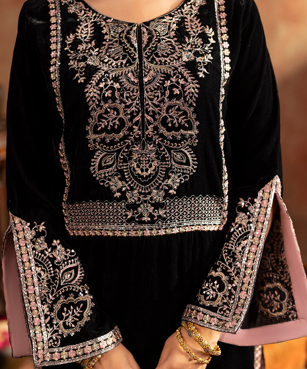 Description: A luxurious one piece black velvet shirt adorned with delicate embroidery in shades of silver, white, and pastel pink. The design features an elegantly embellished neckline and artistically composed sleeves, adding refined charm to the ensemble. Finished with a graceful center slit on sleeves, this piece exudes timeless sophistication and understated glamour.