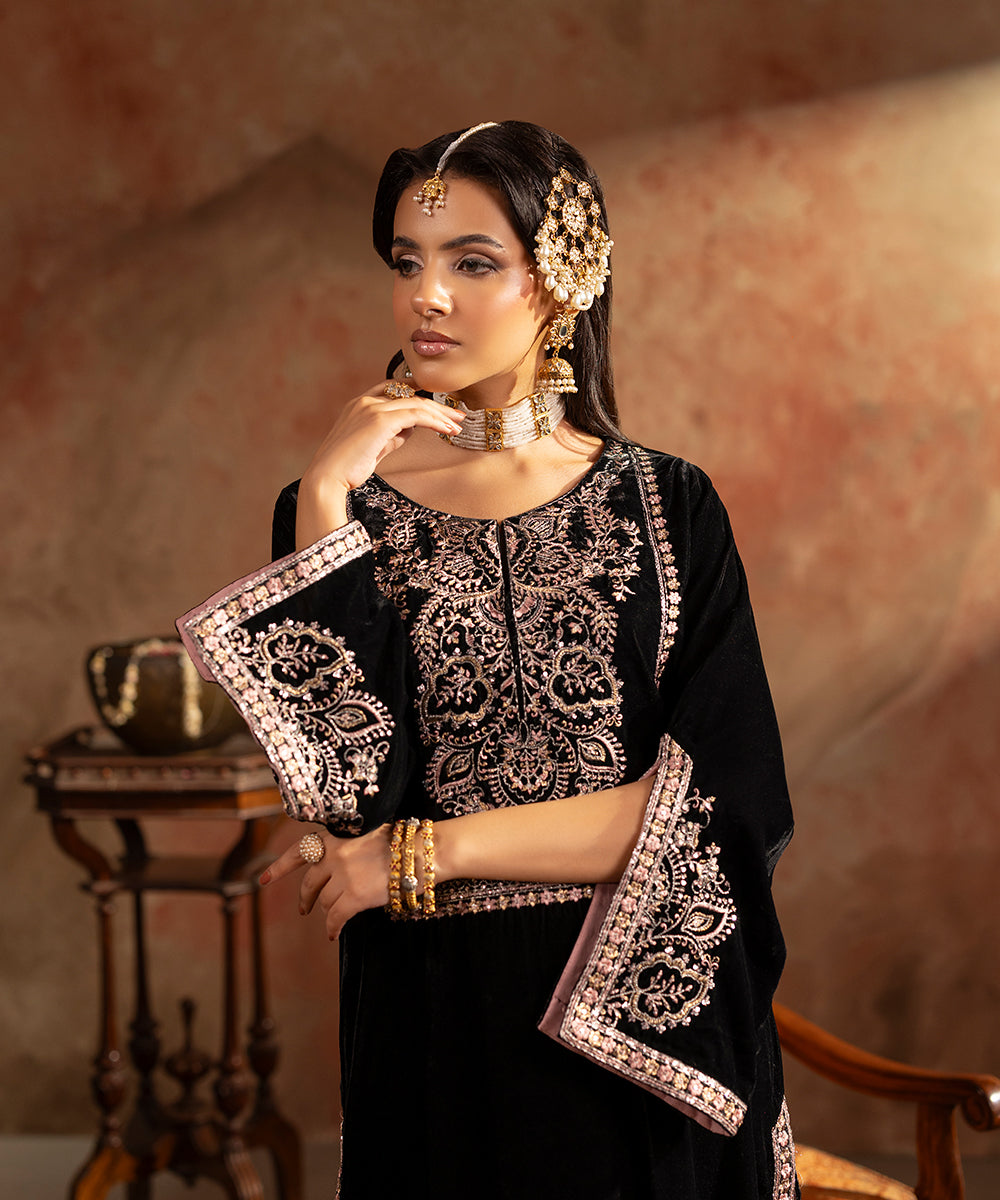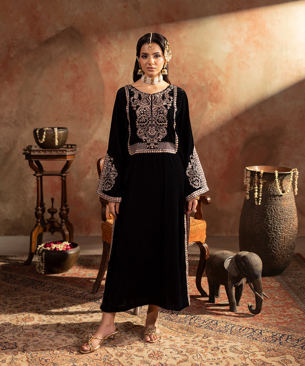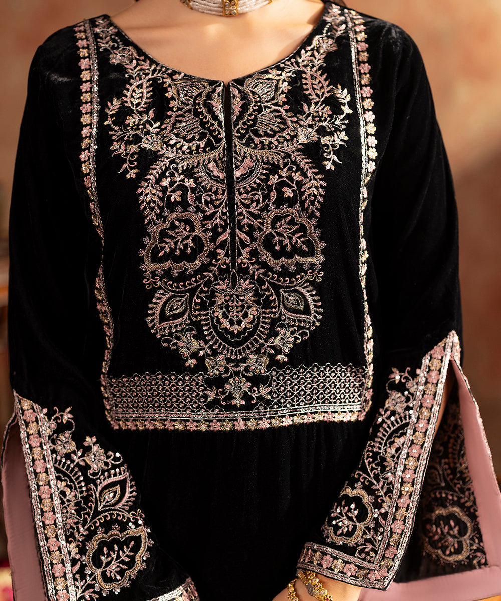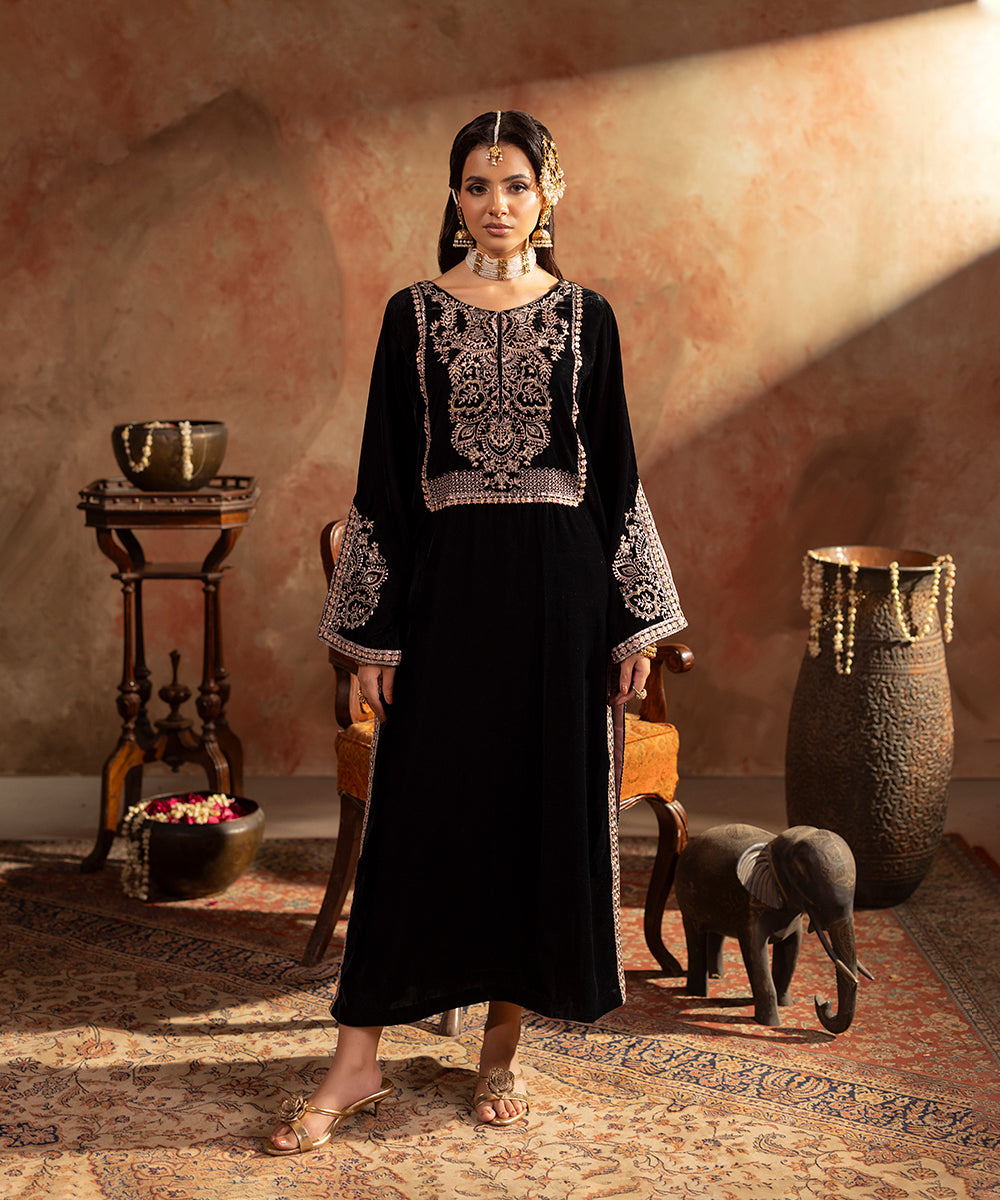 Description: A luxurious one piece black velvet shirt adorned with delicate embroidery in shades of silver, white, and pastel pink. The design features an elegantly embellished neckline and artistically composed sleeves, adding refined charm to the ensemble. Finished with a graceful center slit on sleeves, this piece exudes timeless sophistication and understated glamour.