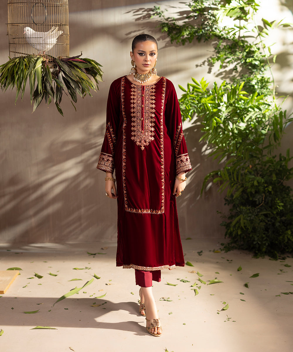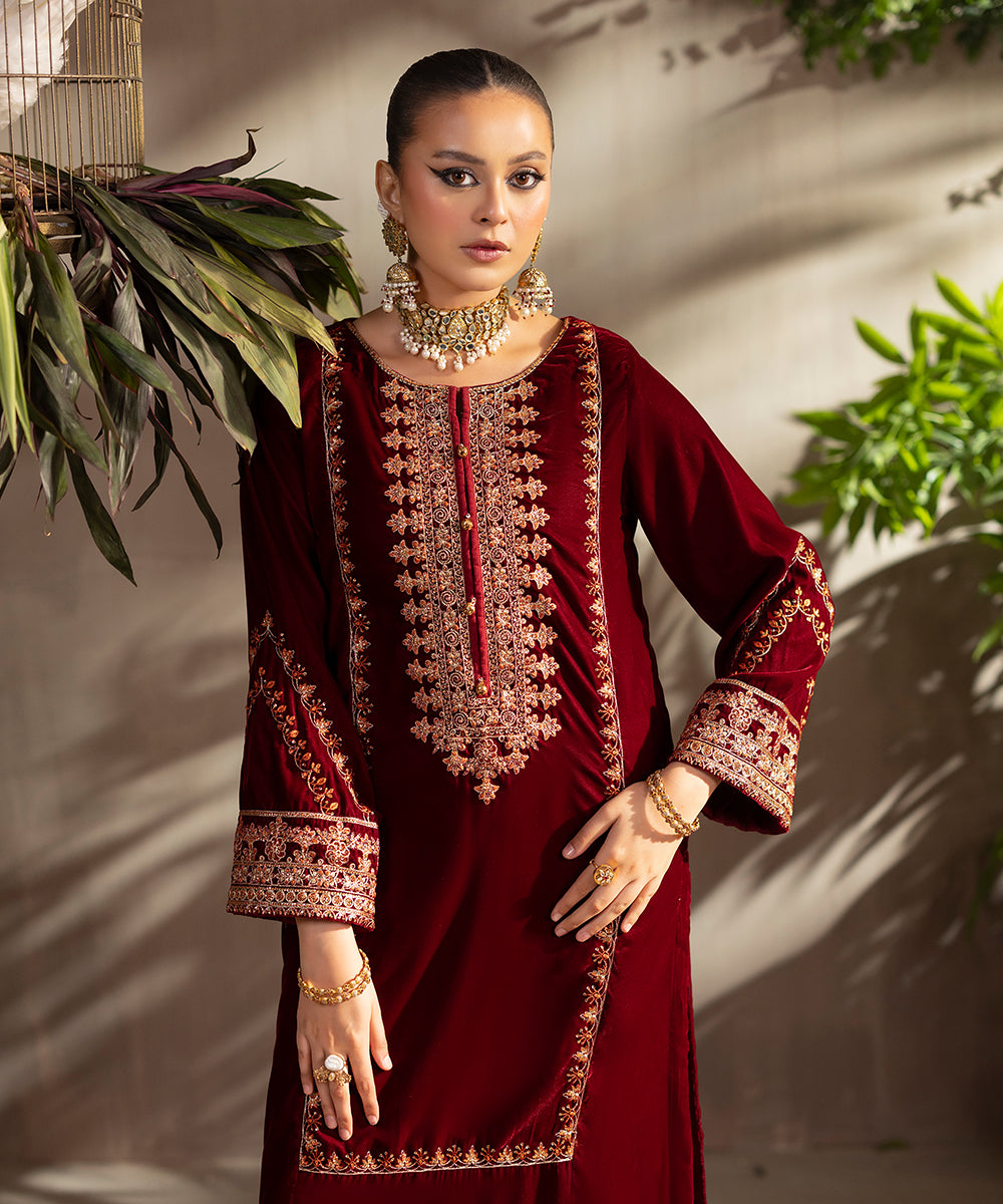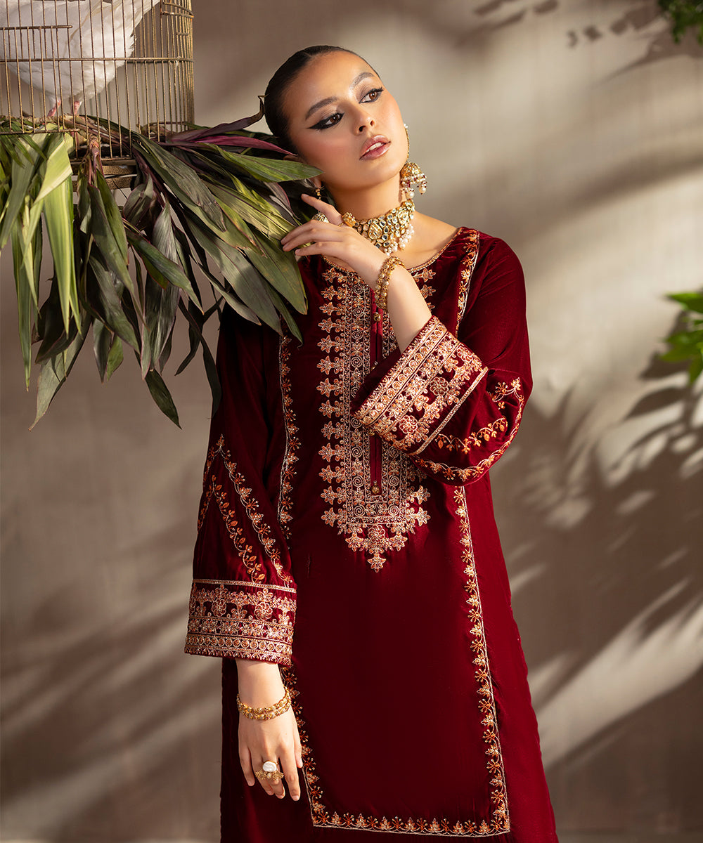 Description: This one piece velvet article in a rich maroon hue radiates classic elegance and festive charm. Adorned with intricate embroidery in hues of gold and rust, it features a beautifully detailed front enhanced with delicate buttons for a refined touch. The sleeves are elegantly embroidered with matching sequin and tilla work, adding a touch of shimmer and sophistication. Perfect for winter festivities, this ensemble exudes timeless grace and regal appeal.