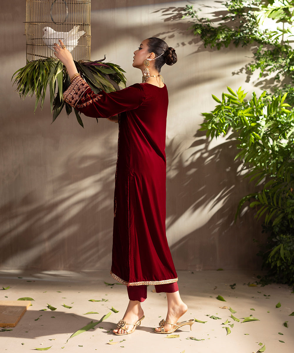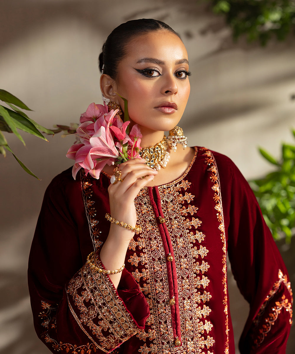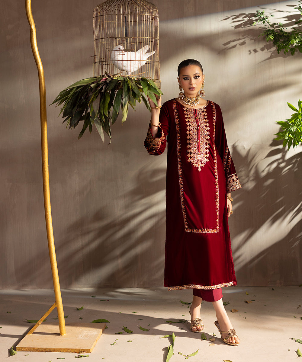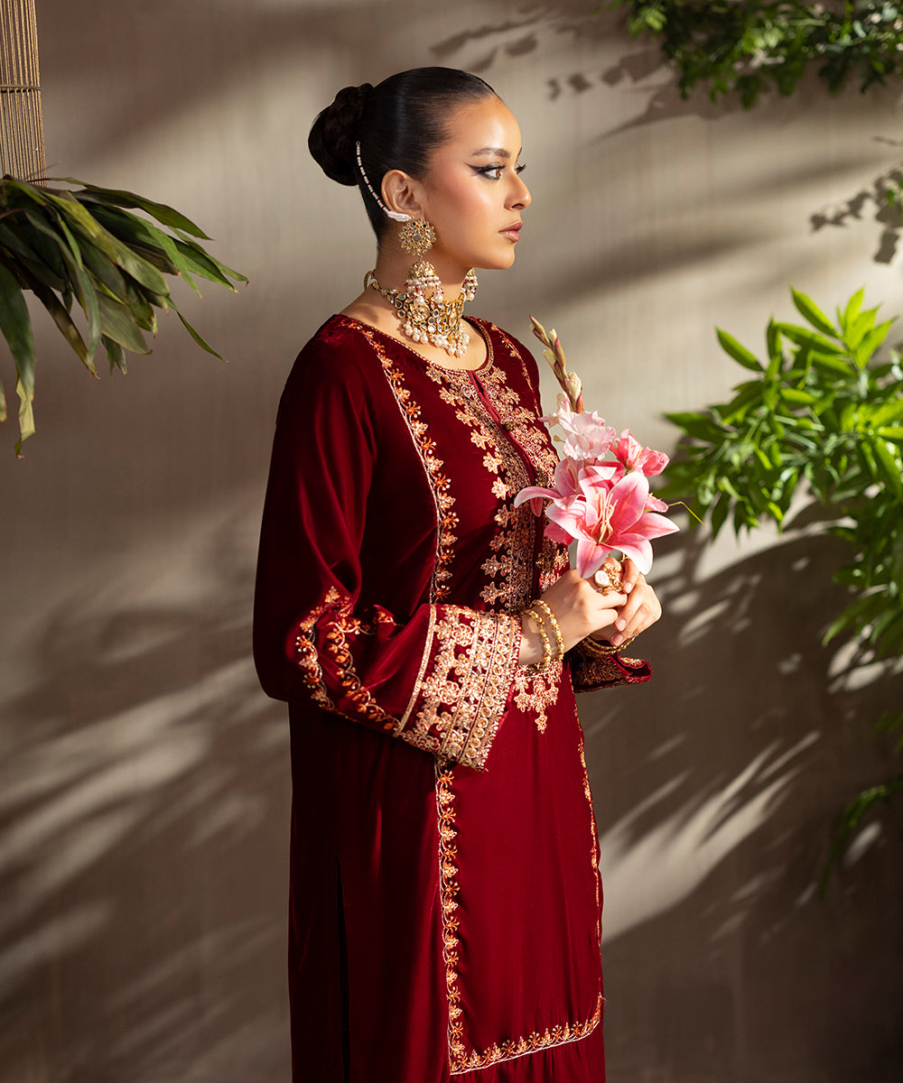 Description: This one piece velvet article in a rich maroon hue radiates classic elegance and festive charm. Adorned with intricate embroidery in hues of gold and rust, it features a beautifully detailed front enhanced with delicate buttons for a refined touch. The sleeves are elegantly embroidered with matching sequin and tilla work, adding a touch of shimmer and sophistication. Perfect for winter festivities, this ensemble exudes timeless grace and regal appeal.