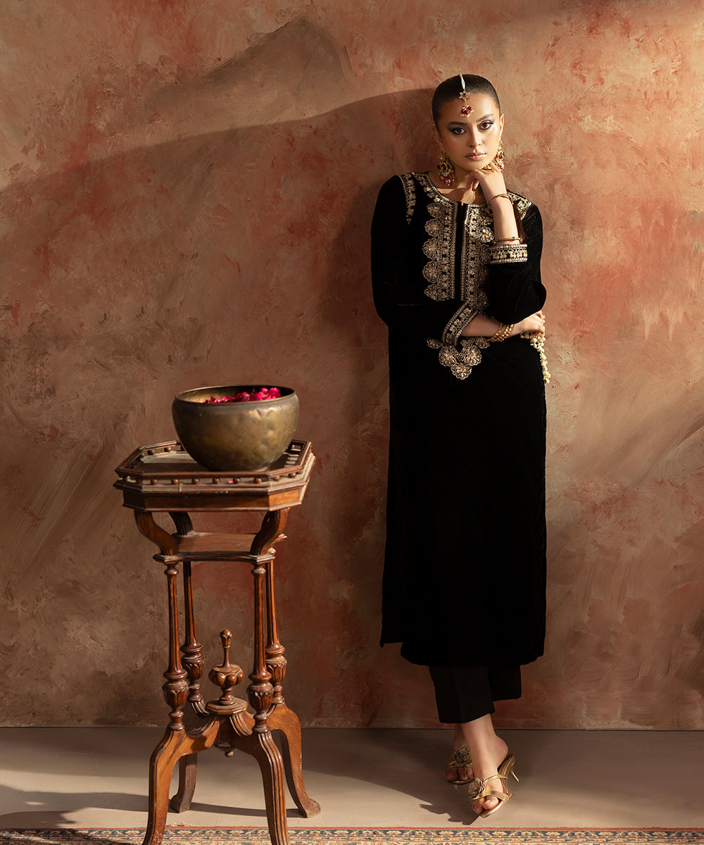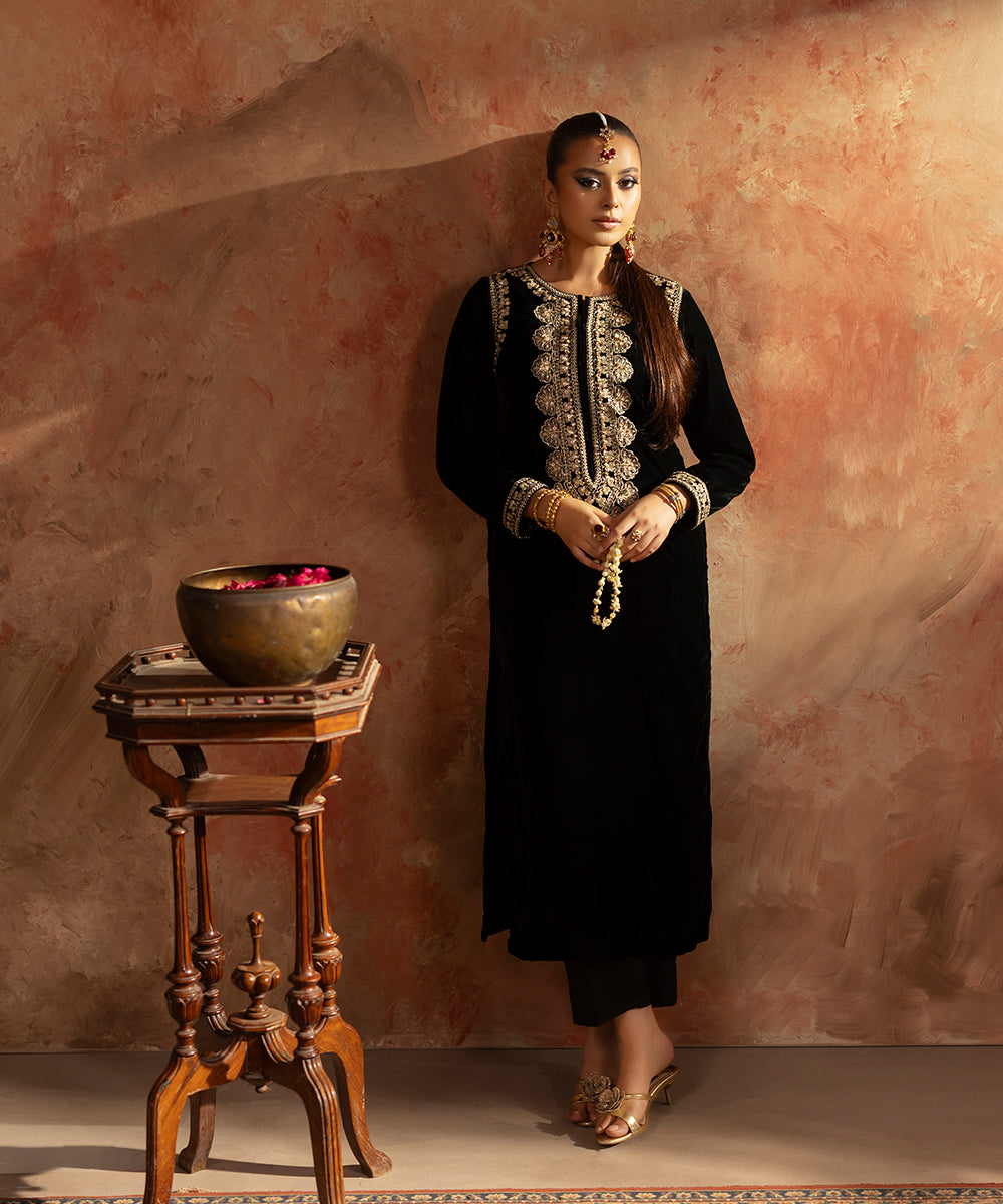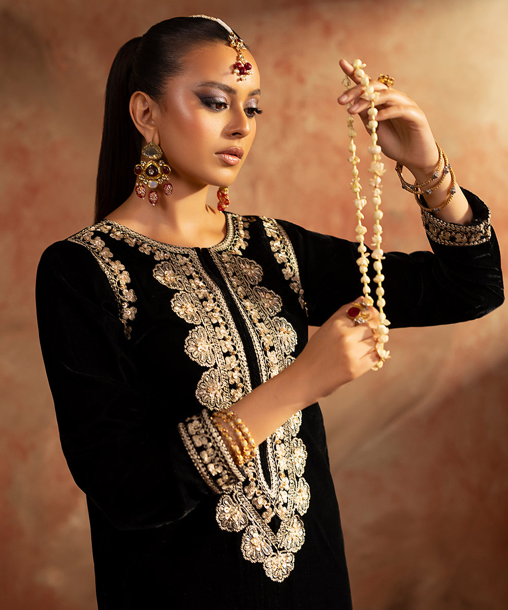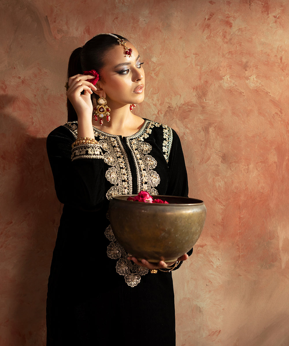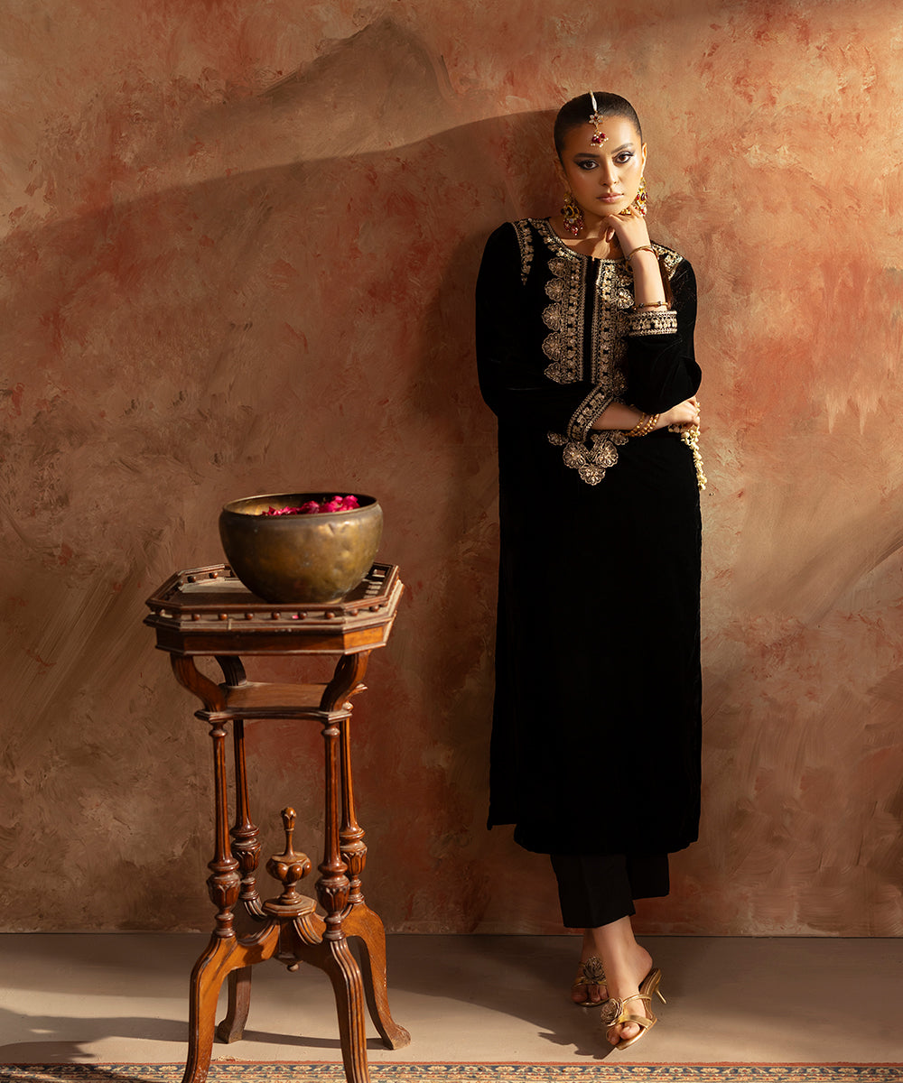 Description: This elegant one piece black velvet outfit exudes timeless sophistication. The design features delicate embroidery along the neckline, armholes, and sleeve borders, intricately crafted in shades of gold and beige. A subtle hint of ada work adds a touch of artisanal charm and luxury, making it a perfect choice for refined evening wear.