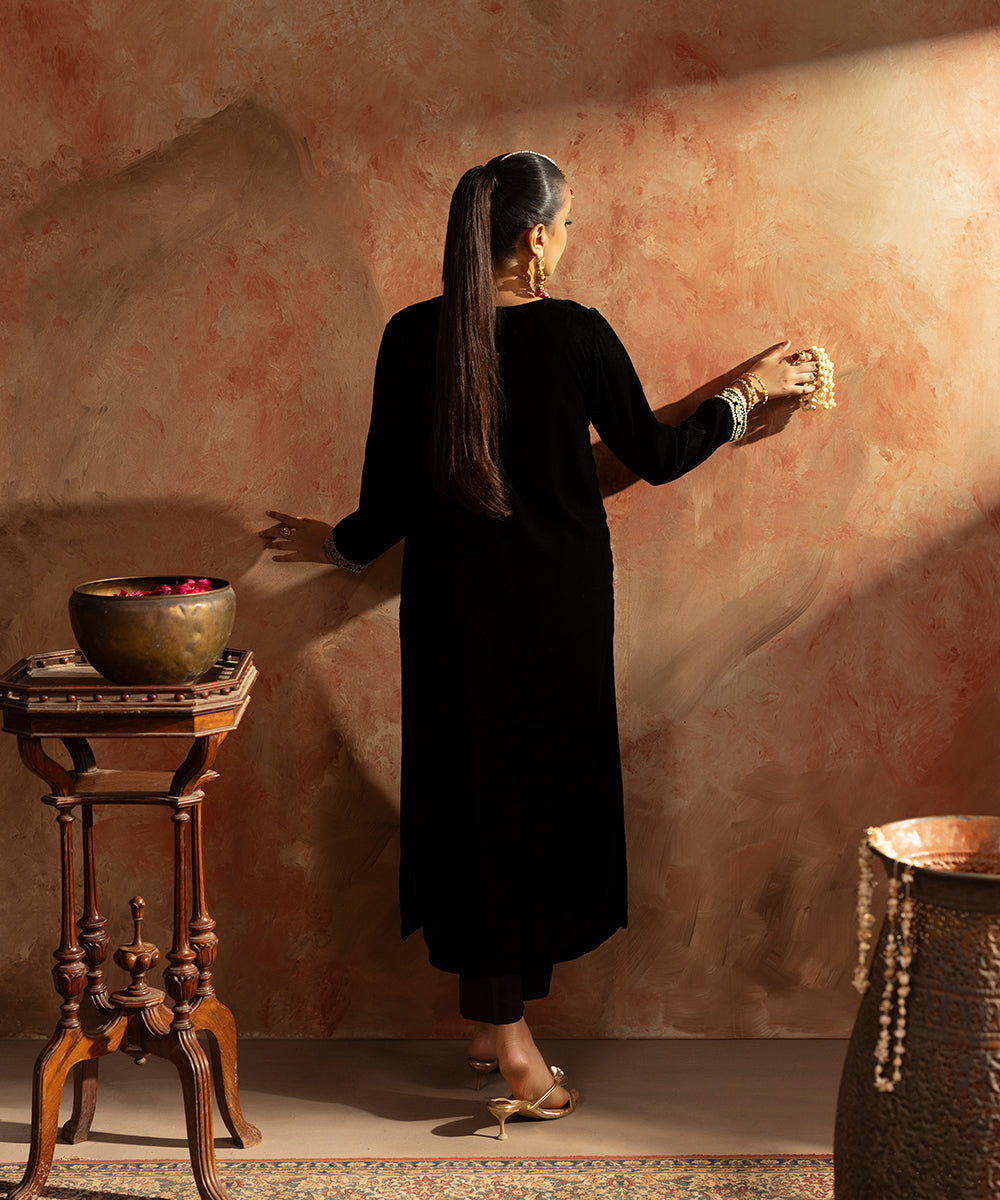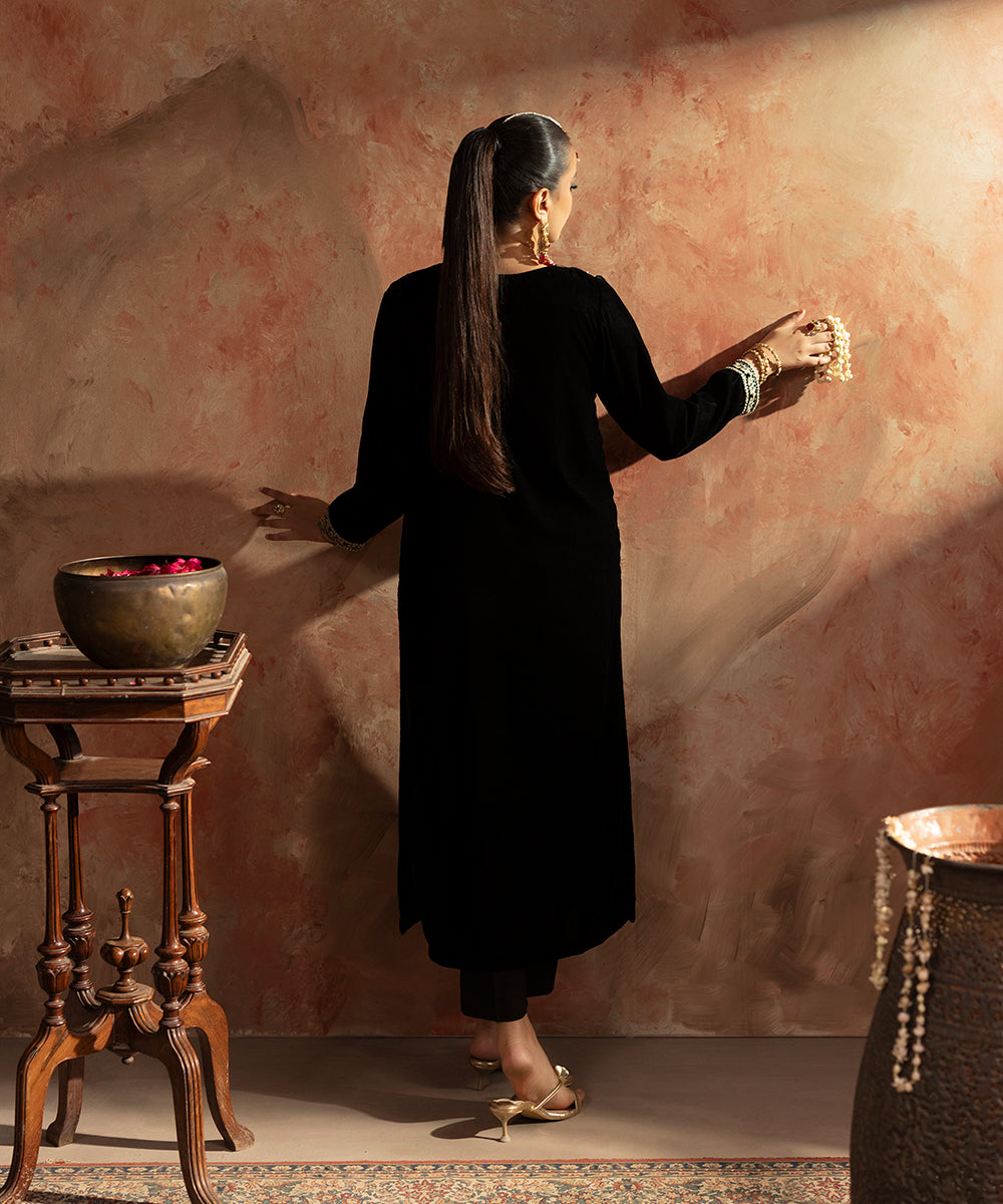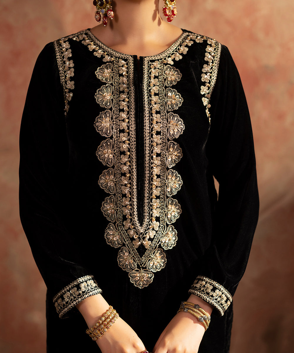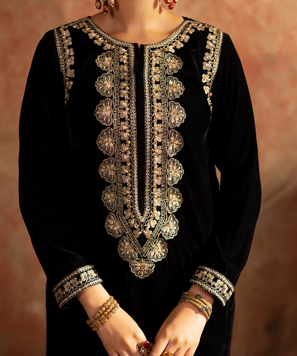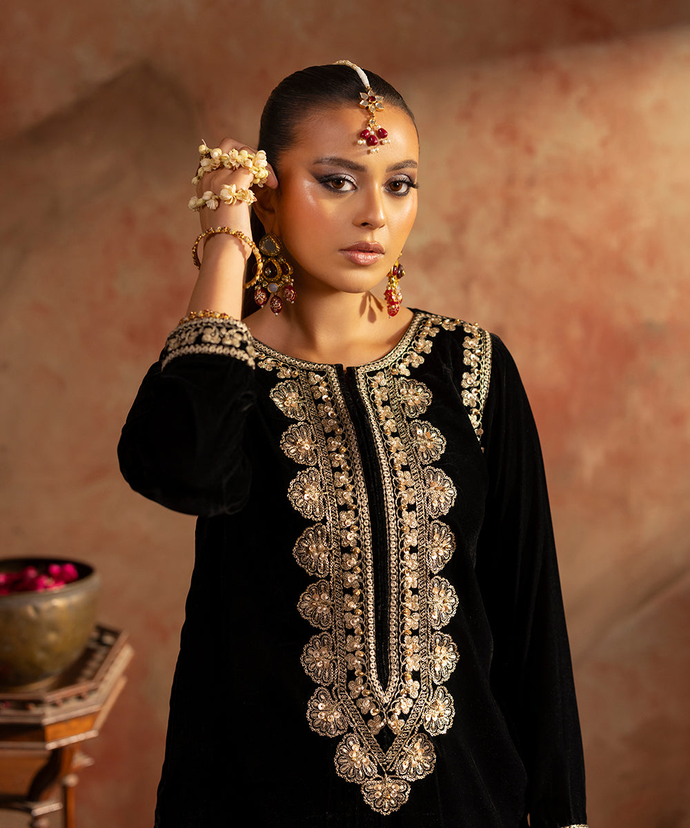 Description: This elegant one piece black velvet outfit exudes timeless sophistication. The design features delicate embroidery along the neckline, armholes, and sleeve borders, intricately crafted in shades of gold and beige. A subtle hint of ada work adds a touch of artisanal charm and luxury, making it a perfect choice for refined evening wear.