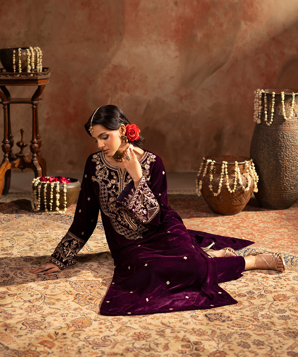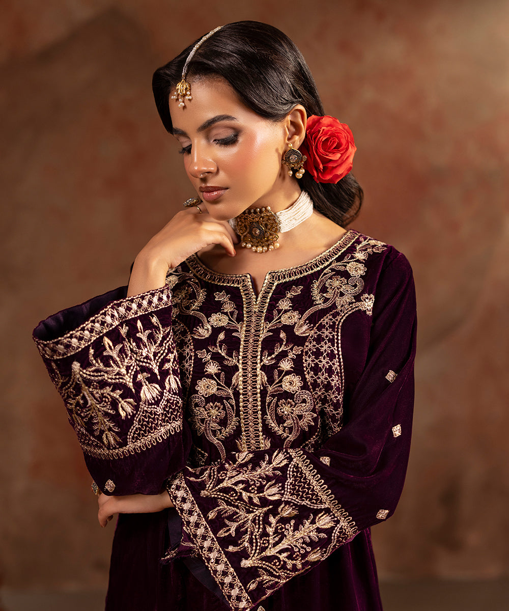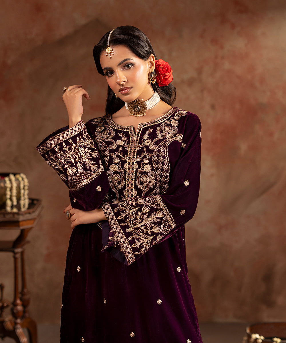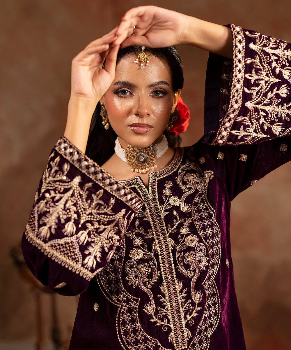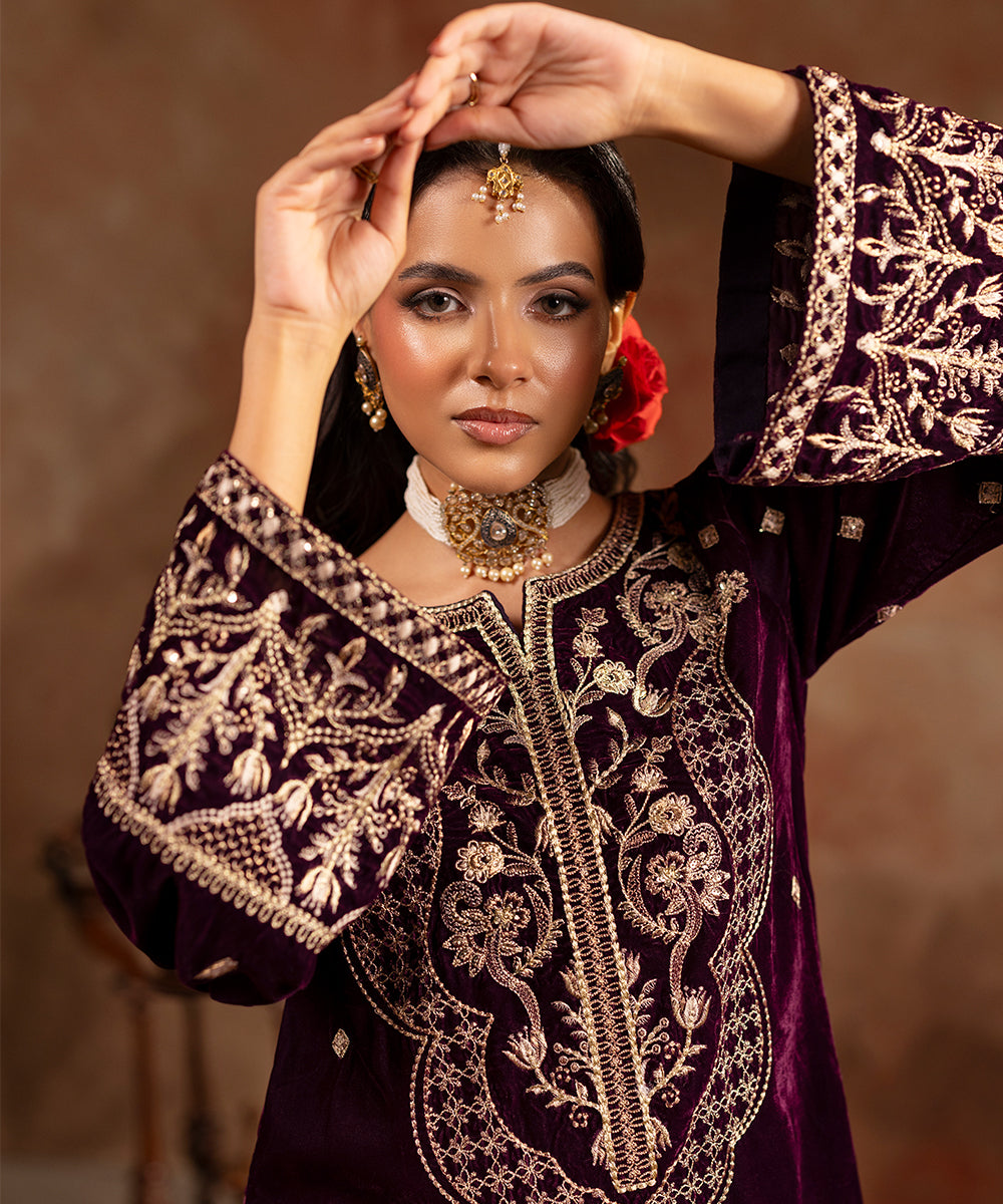 Description: This refined plum velvet outfit is styled with artful hints of tilla and sequin work gracing the neckline and sleeve edges, while a soft scattered sparkle flows over the front and sleeves. Its rich tone and understated shimmer create a look of effortless festive elegance.