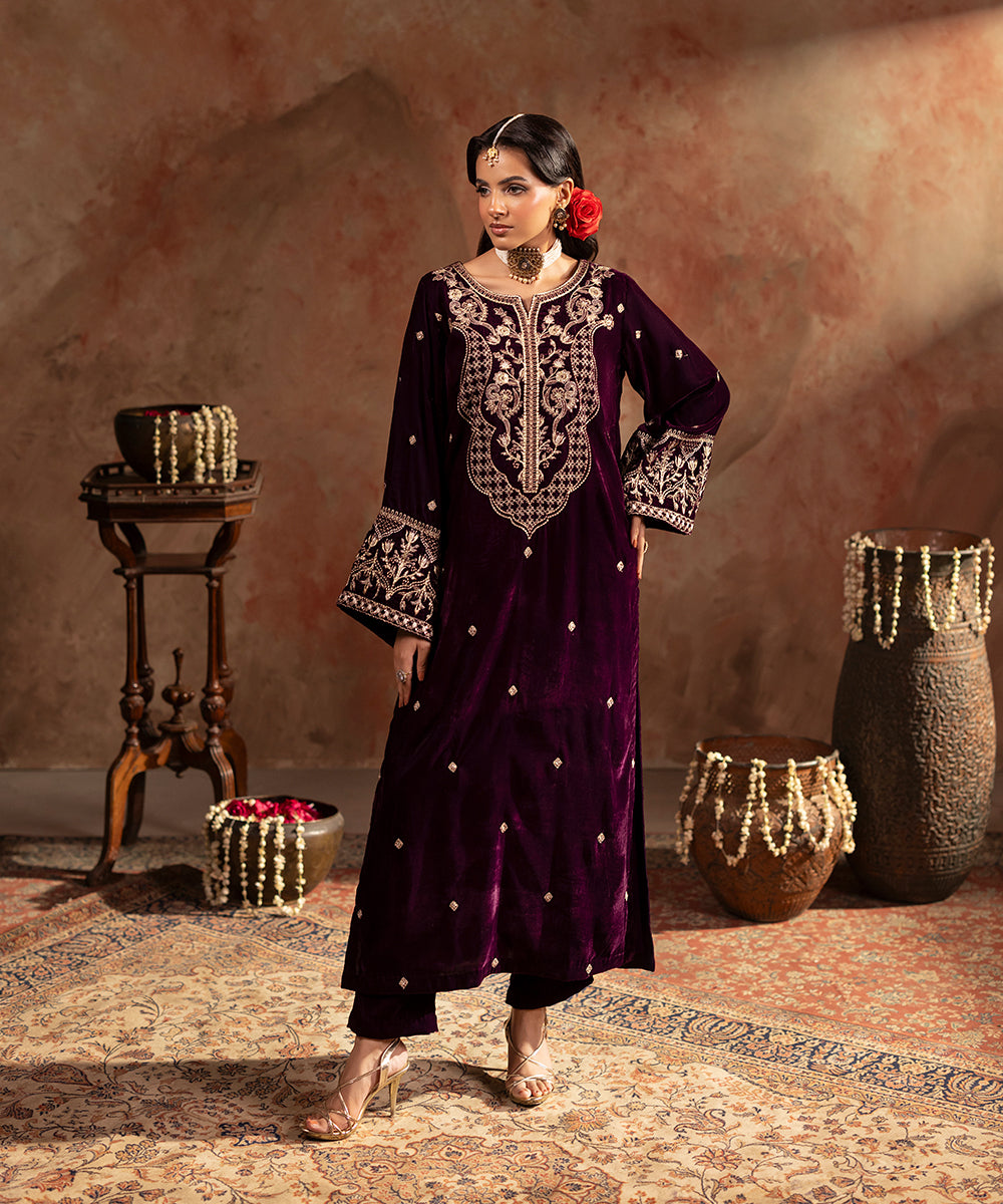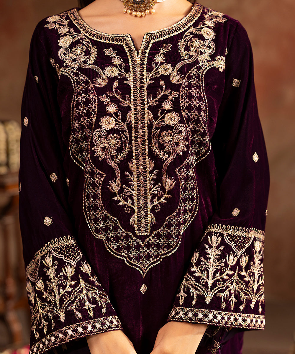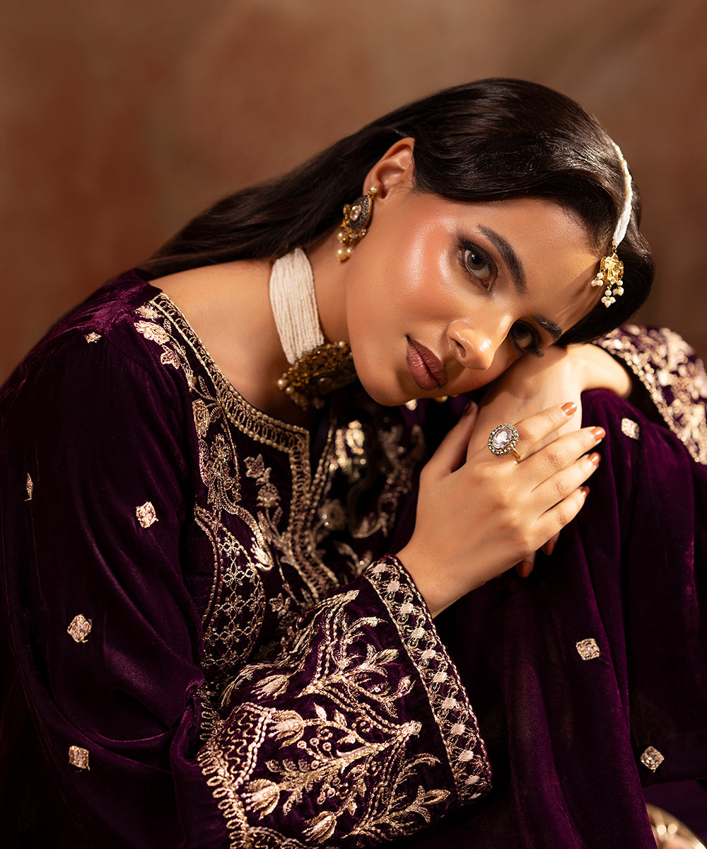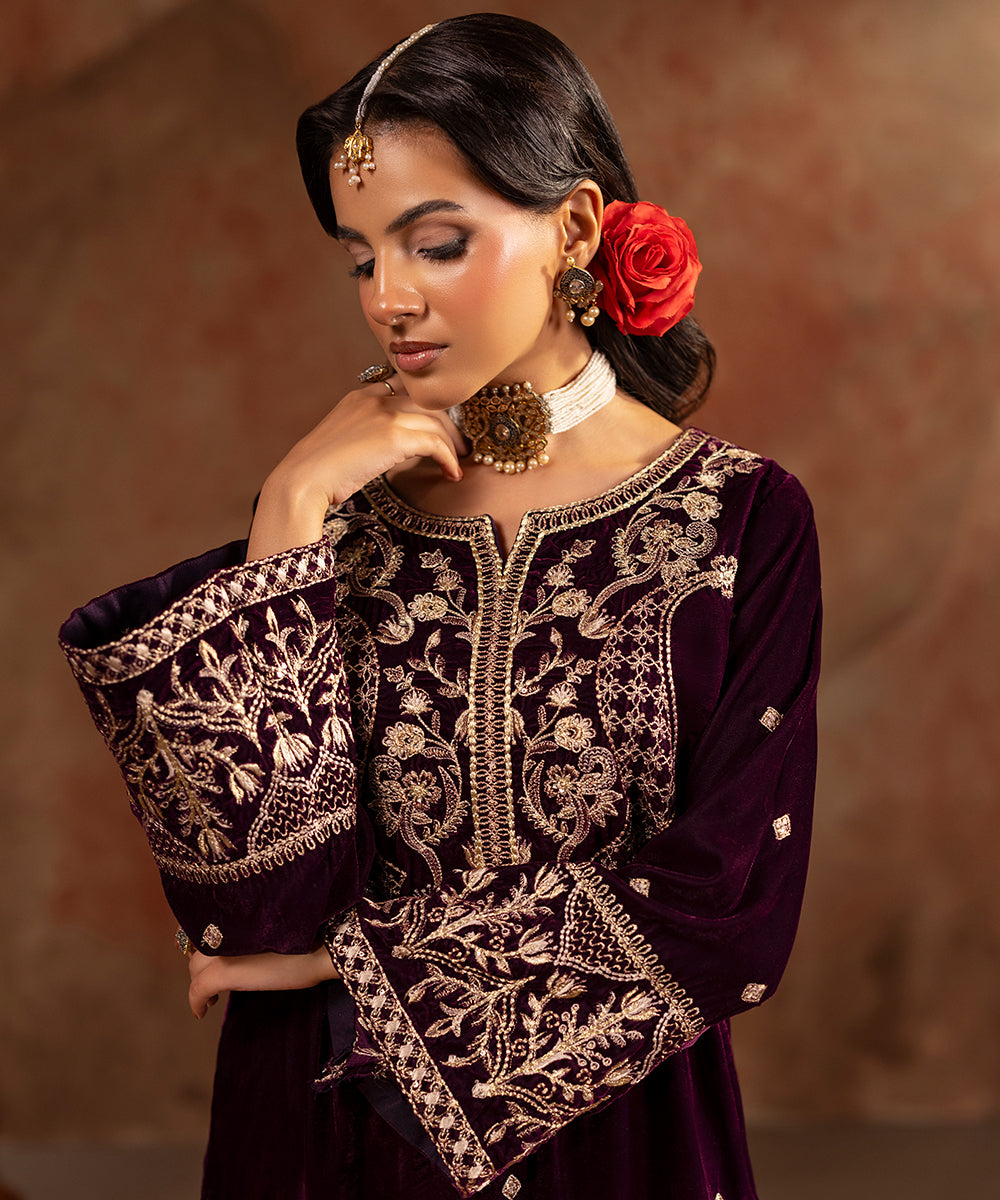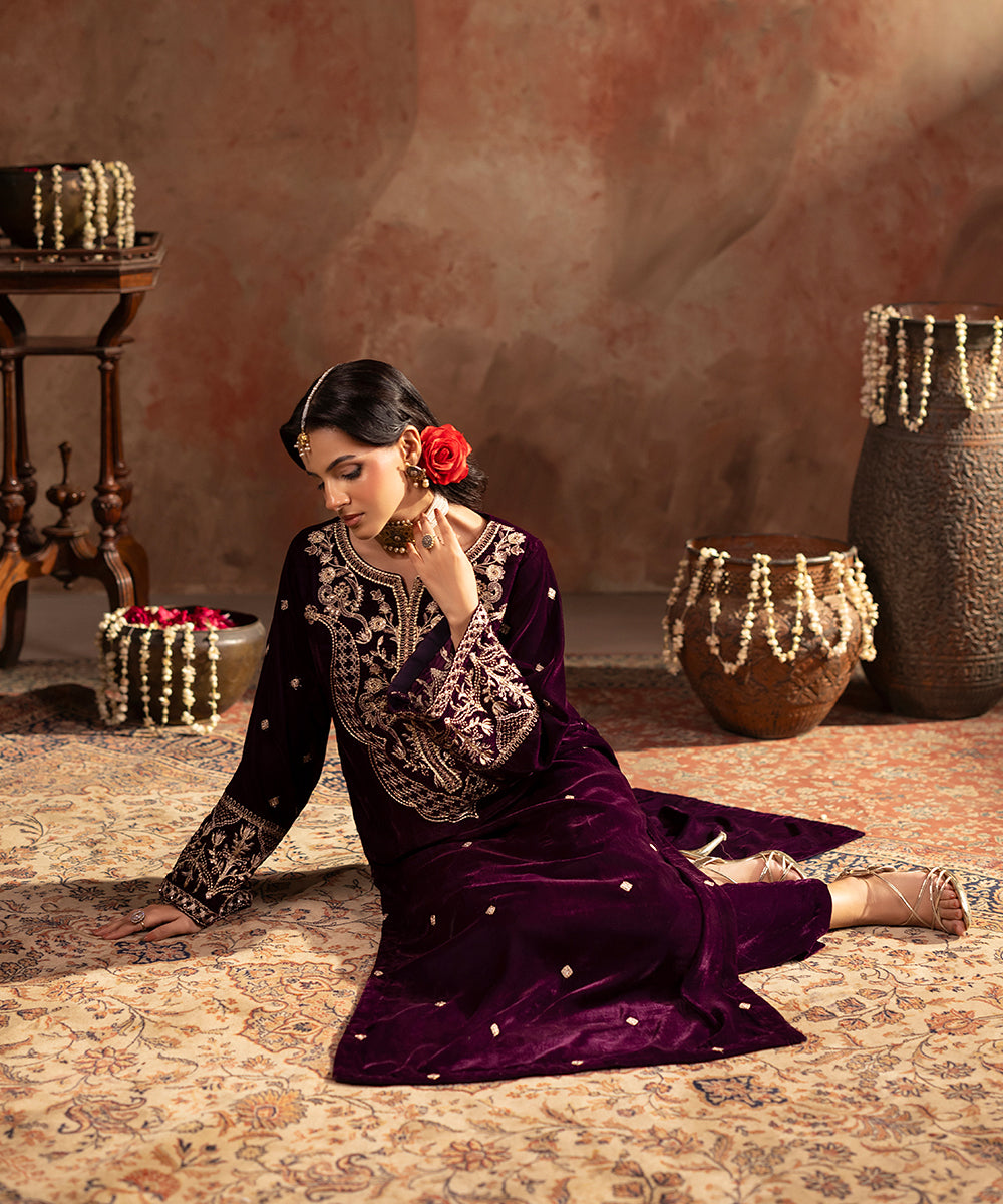 Description: This refined plum velvet outfit is styled with artful hints of tilla and sequin work gracing the neckline and sleeve edges, while a soft scattered sparkle flows over the front and sleeves. Its rich tone and understated shimmer create a look of effortless festive elegance.