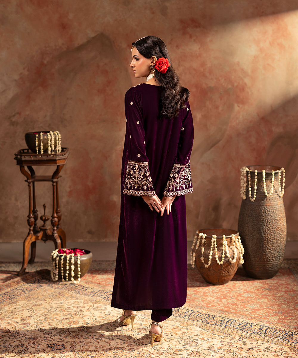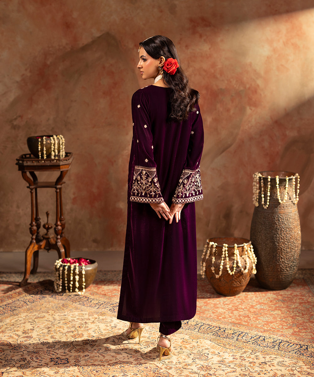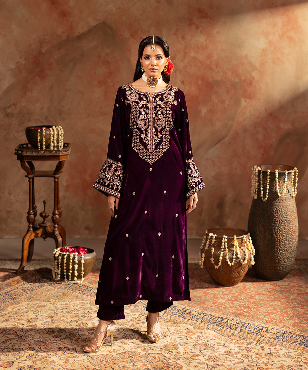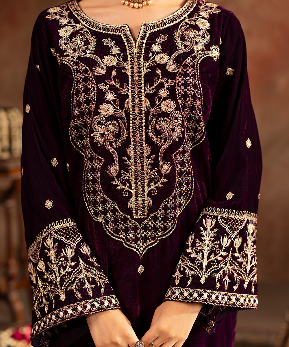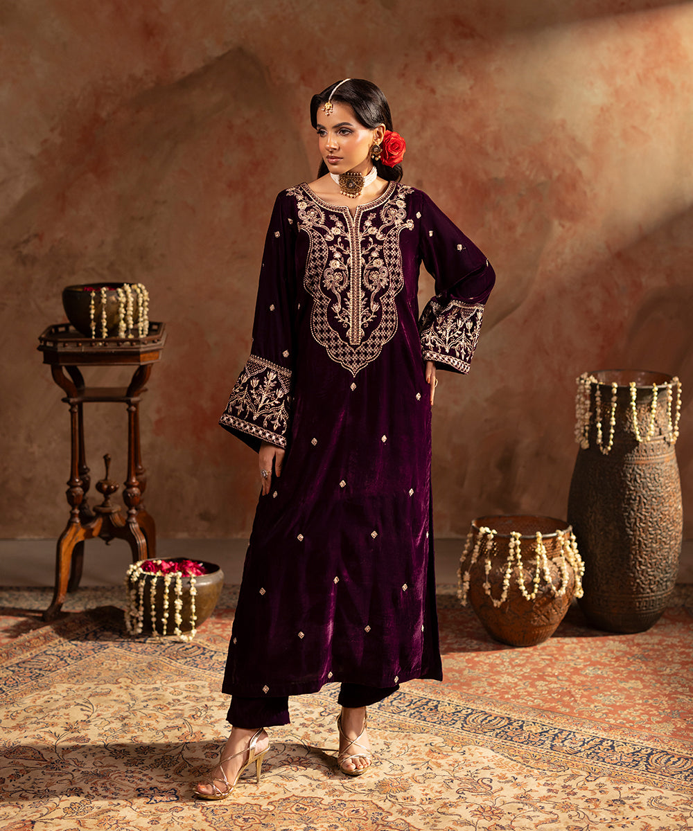 Description: This refined plum velvet outfit is styled with artful hints of tilla and sequin work gracing the neckline and sleeve edges, while a soft scattered sparkle flows over the front and sleeves. Its rich tone and understated shimmer create a look of effortless festive elegance.