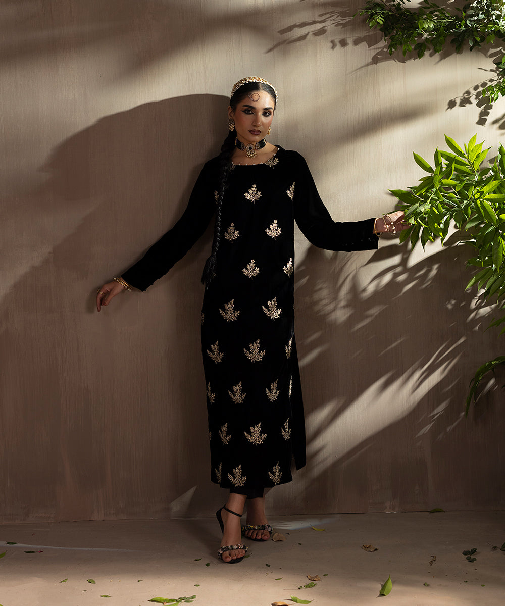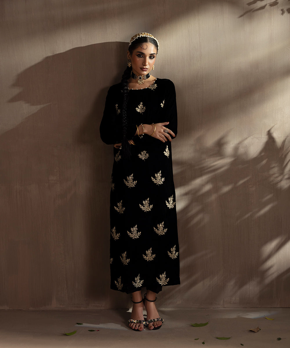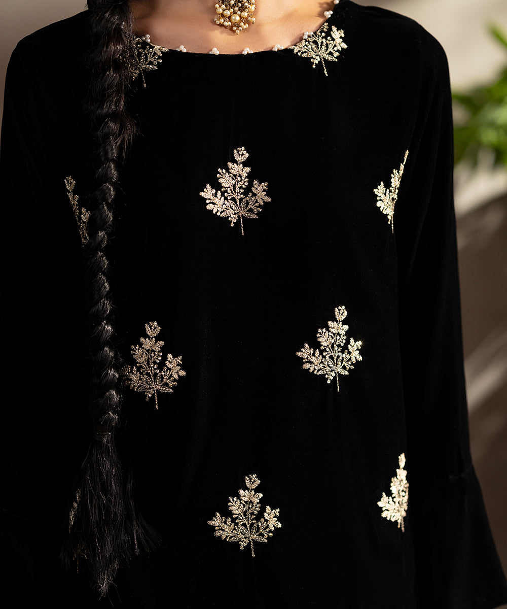 Description: This one piece velvet article in classic black featuring an overall floral embroidery spray in rich golden tones. The intricate gold threadwork adds a luxurious sheen and festive charm, perfectly complementing the deep velvet base for an elegant and timeless look.