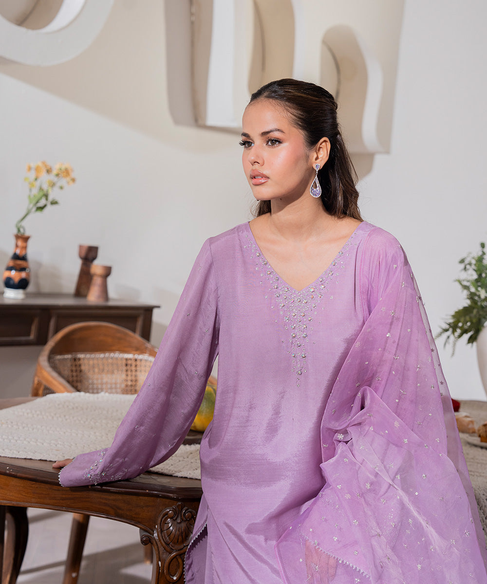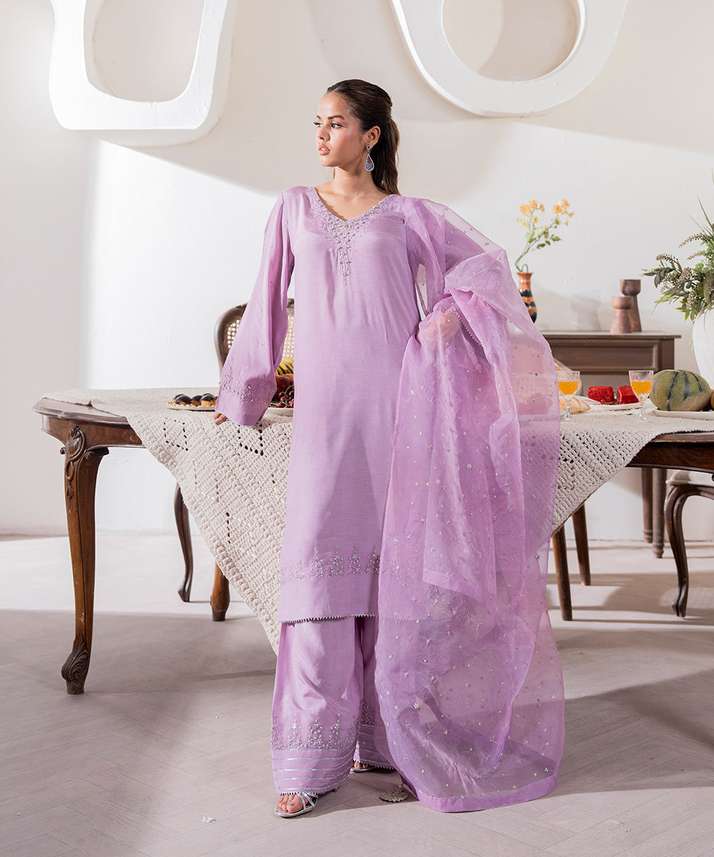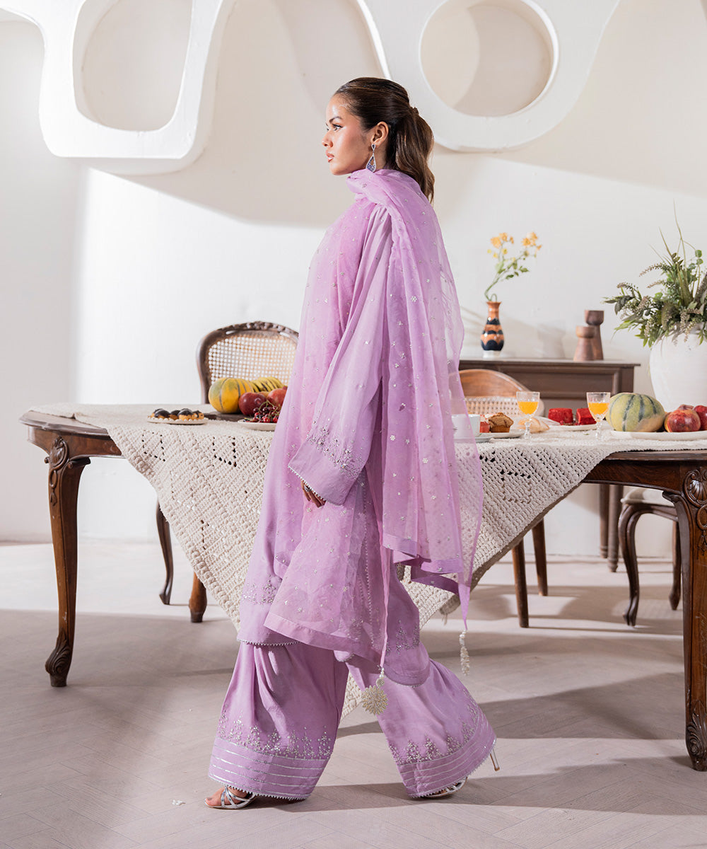 Description: Grace meets glamour in this stunning lavender ensemble, crafted from luxurious Sheesha silk. The shirt features delicate hand embellishments in shimmering tones, beautifully placed along the neckline and sleeves for an elegant, feminine finish. Paired with a trendy Farshi shalwar that lends volume and sophistication to the silhouette, the outfit is completed with an intricately embroidered organza dupatta. Light and ethereal, the dupatta adds the perfect touch of refinement, making this set ideal for festive occasions, formal events, and intimate celebrations.