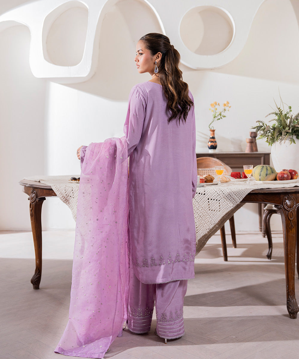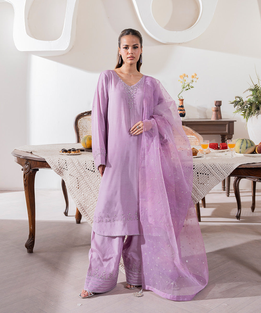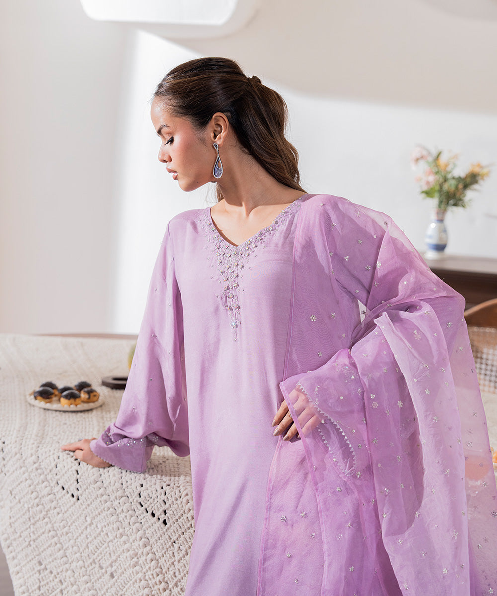 Description: Grace meets glamour in this stunning lavender ensemble, crafted from luxurious Sheesha silk. The shirt features delicate hand embellishments in shimmering tones, beautifully placed along the neckline and sleeves for an elegant, feminine finish. Paired with a trendy Farshi shalwar that lends volume and sophistication to the silhouette, the outfit is completed with an intricately embroidered organza dupatta. Light and ethereal, the dupatta adds the perfect touch of refinement, making this set ideal for festive occasions, formal events, and intimate celebrations.