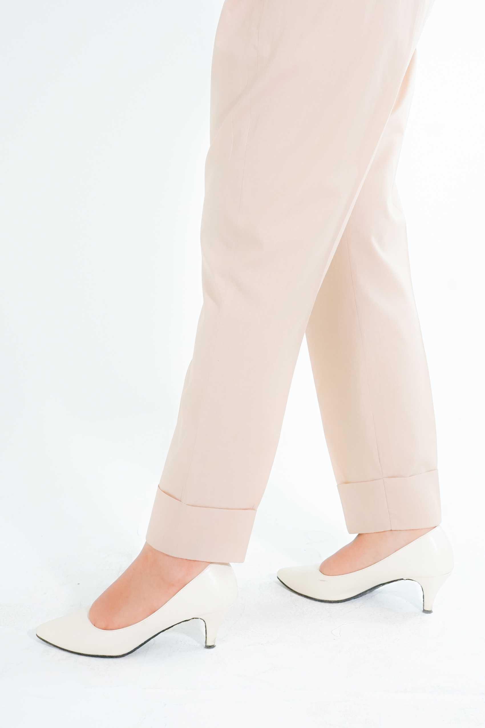 This beige straight-fit pant is crafted from ultra-fine cambric fabric, offering a perfect balance of comfort and style. Its simple yet elegant design makes it a versatile wardrobe essential for both casual and formal occasions.